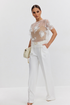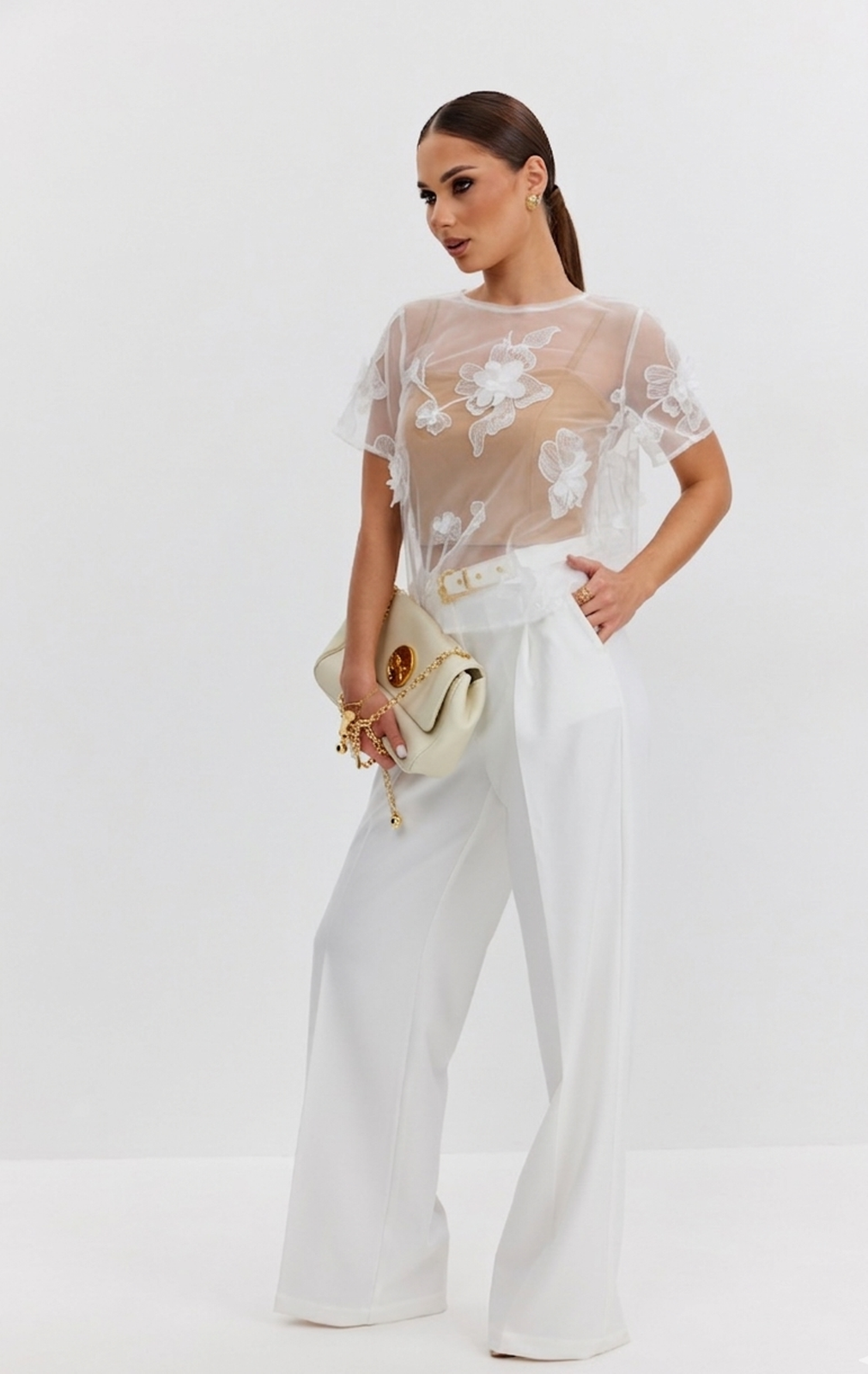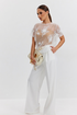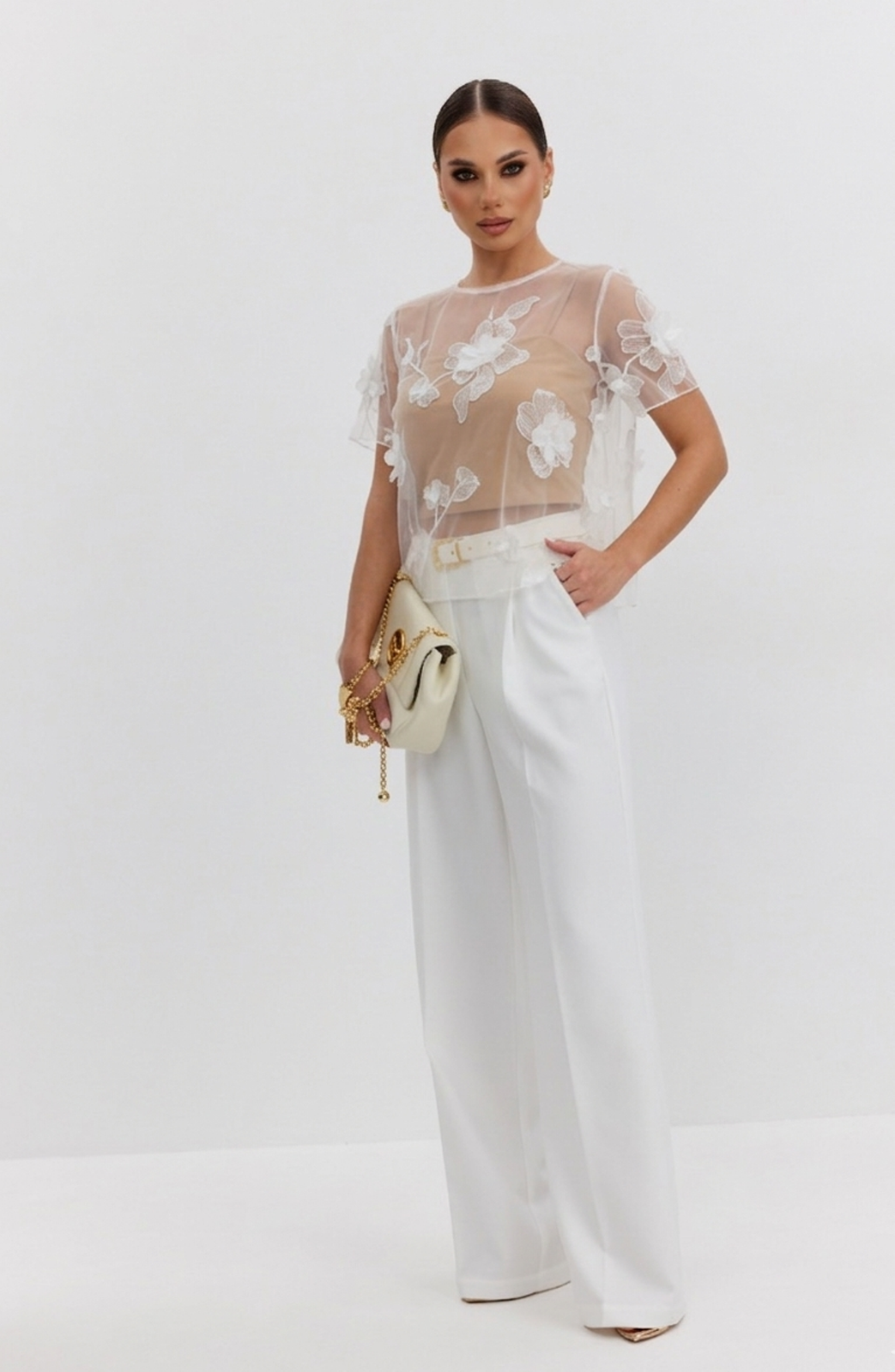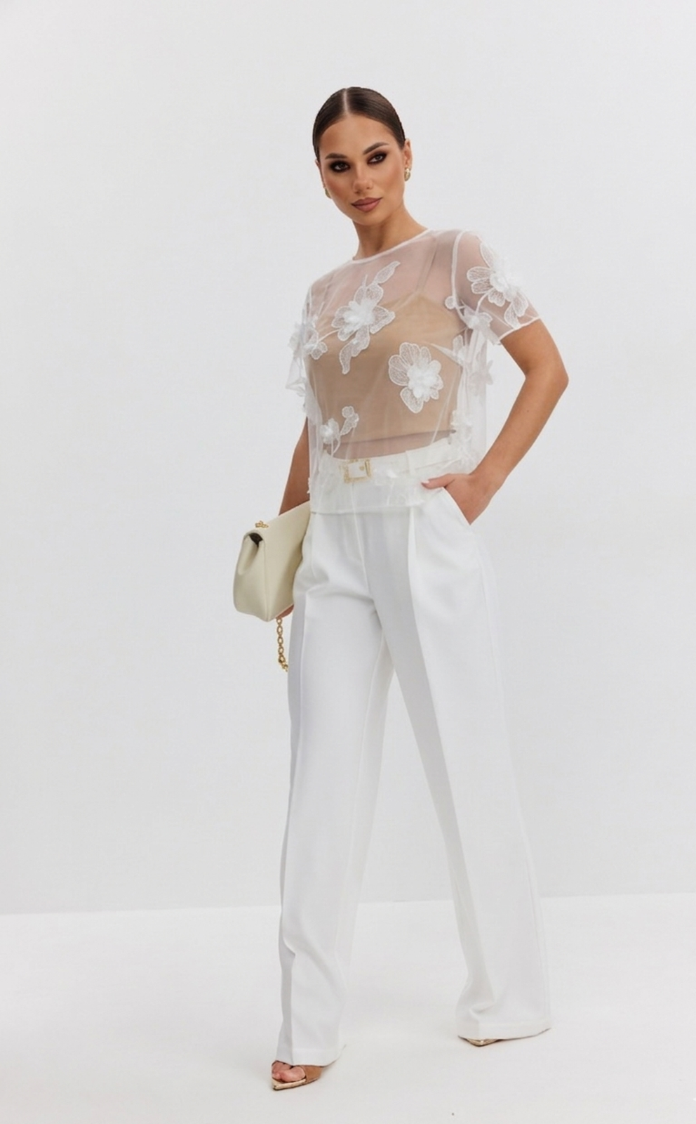Блузка женская прямого силуэта из фактурной ткани «цветы на сетке», по горловине спинки застежка на декоративный крючок, рукав короткий, горловина круглой формы. В комплекте нижний топ-бандо на бретелях из эластичного трикотажного полотна.