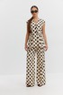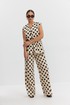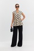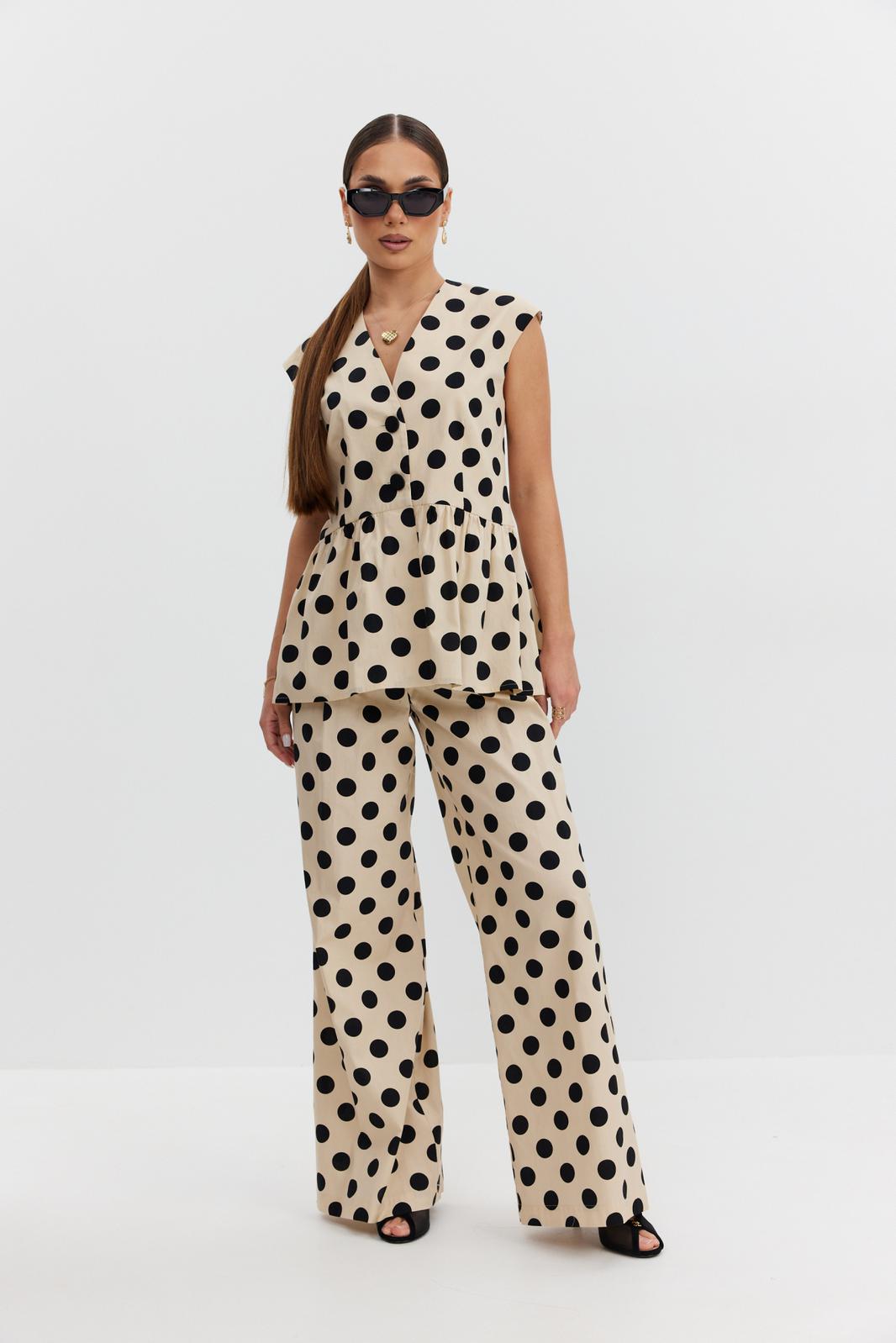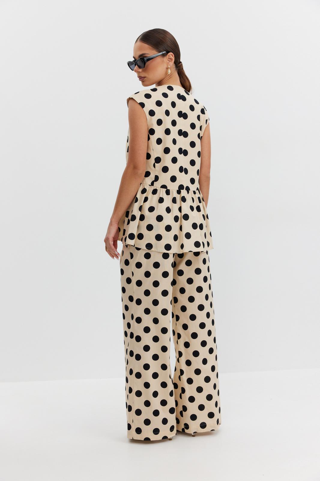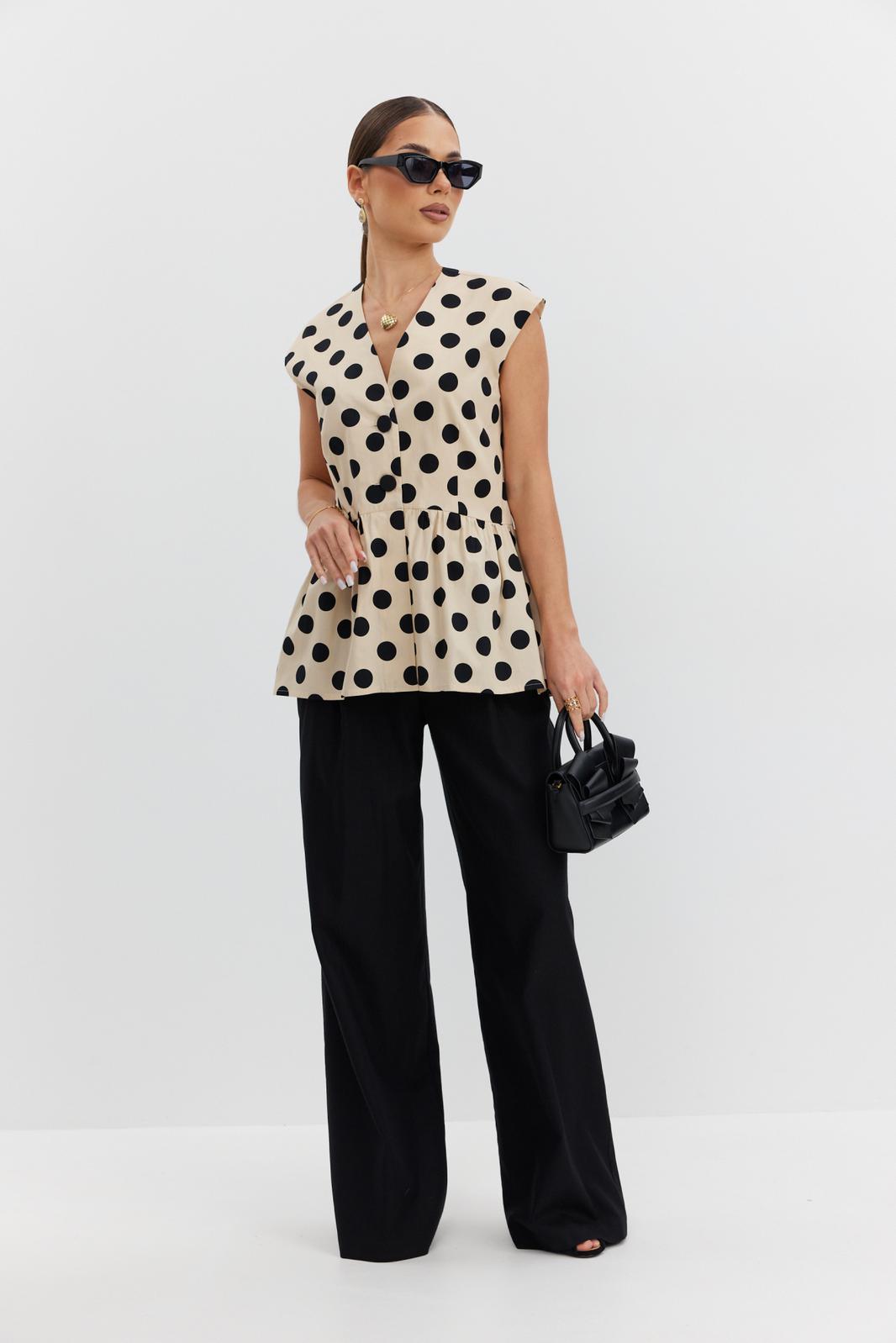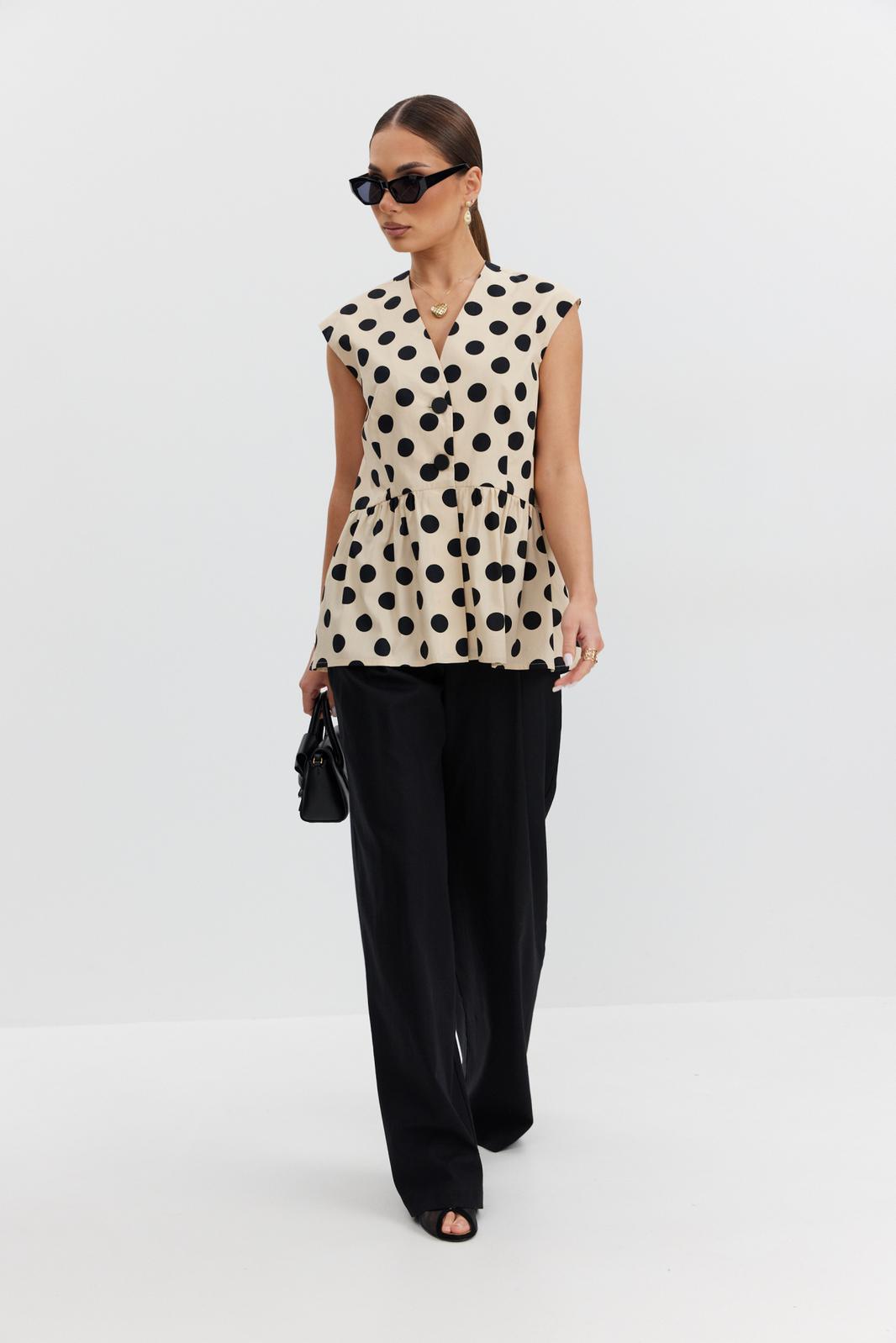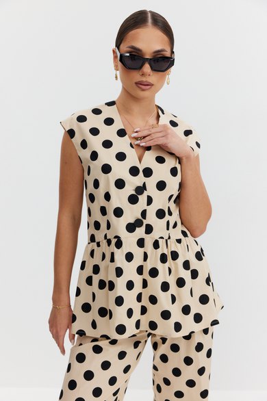 Жилет женский полуприлегающего силуэта, на хлопковой подкладке, со слегка спущенной линией плеча, вырез горловины глубокий V-образный, жилет с подрезом по талии, нижняя часть жилета без подкладки, сосборена по шву притачивания. Спинка со средним швом и рельефами, по переду нагрудные вытачки. Застежка центральная на две декоративные пуговицы.