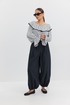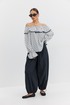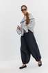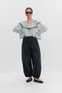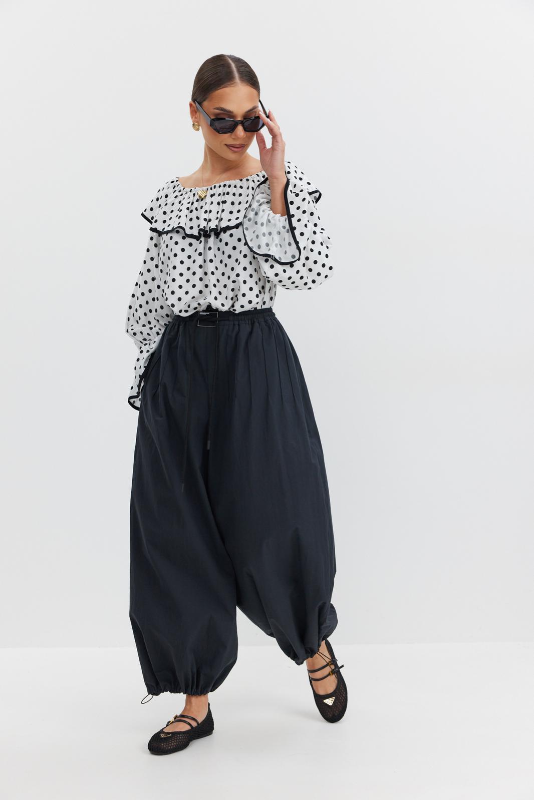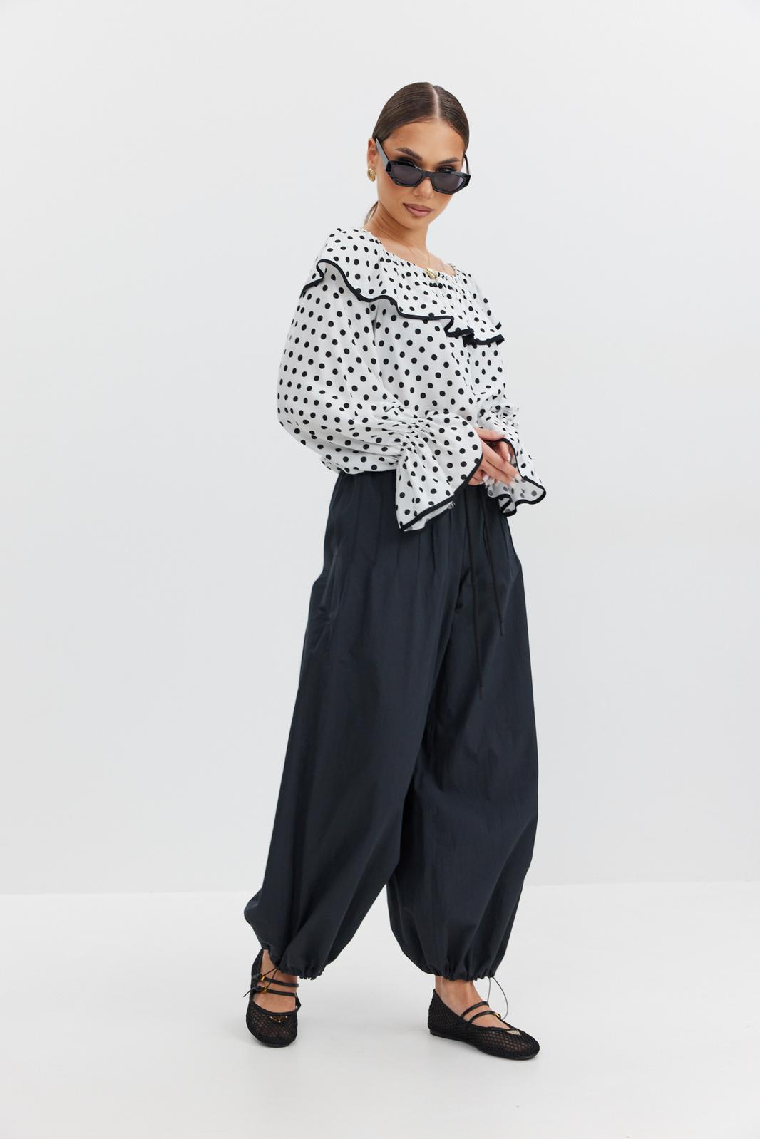 Блузка женская объёмного силуэта, длиной до уровня бедер. Вырез горловины плавной округлой формы с воланом, по верху переда, спинки и рукавов резинка. Рукав длинный объёмный. По низу рукава прострочена тонкая резинка, позволяющая приспустить или поднять рукав выше. По низу блузки, рукава и волана контрастная окантовка.