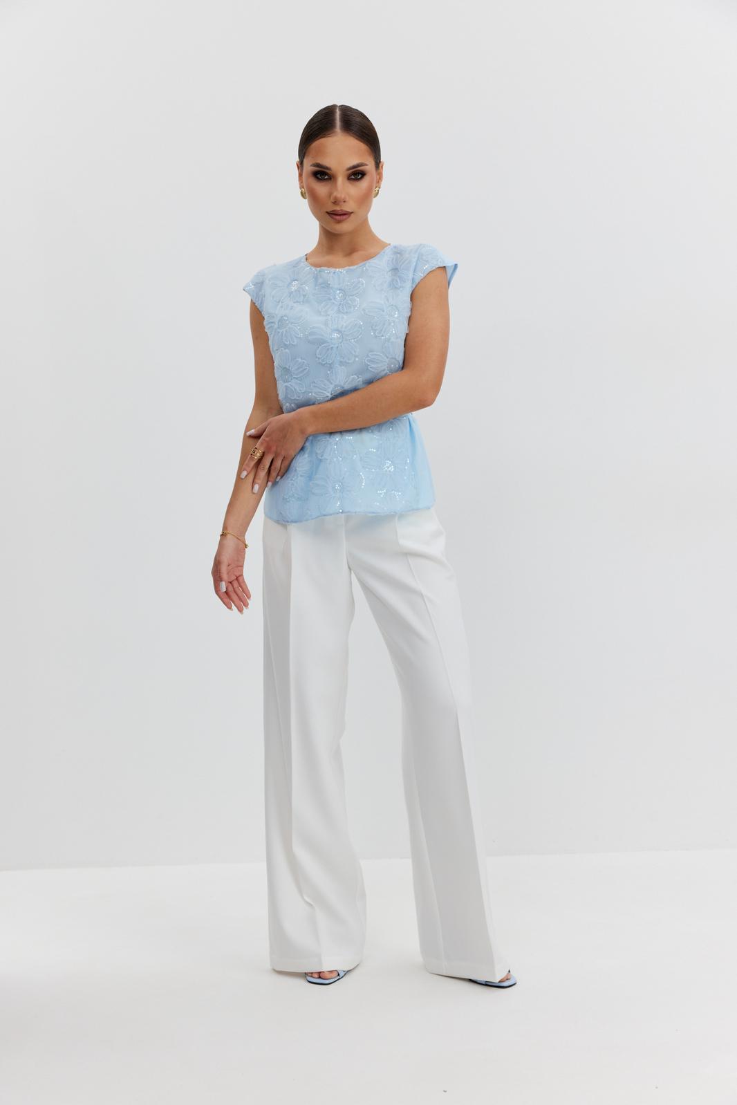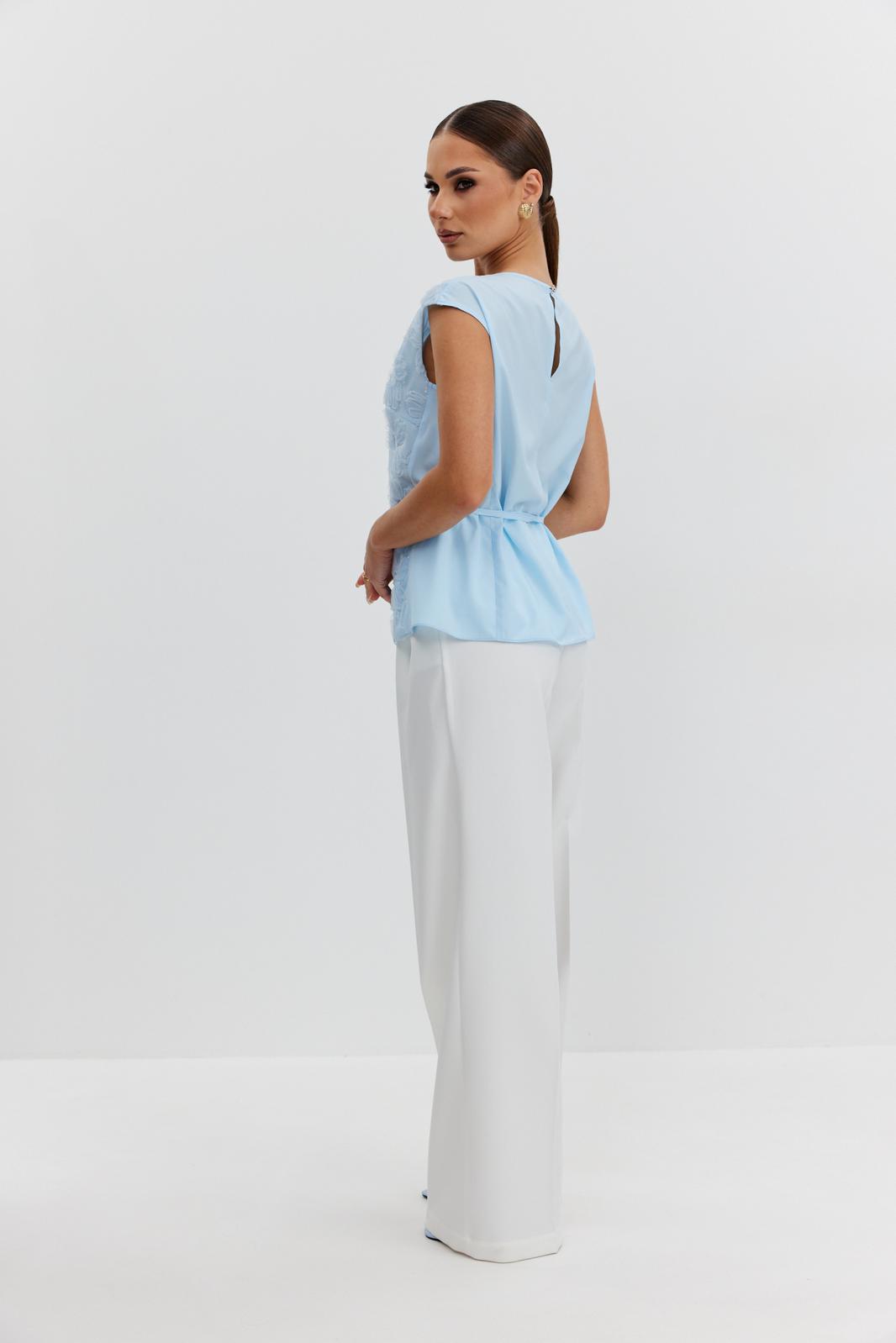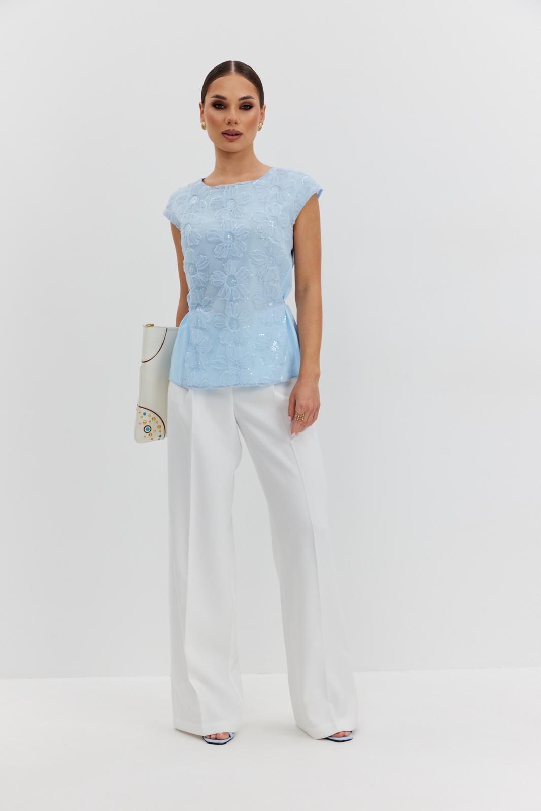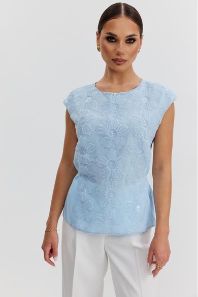 Блузка прямого силуэта со спущенным плечом. Перед из фактурной ткани «ромашки на сетке», спинка из полупрозрачной ткани «органза». Горловина округлой формы, по спинке застежка на навесную петлю и пуговицу. Перед на атласной подкладке.