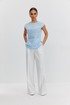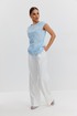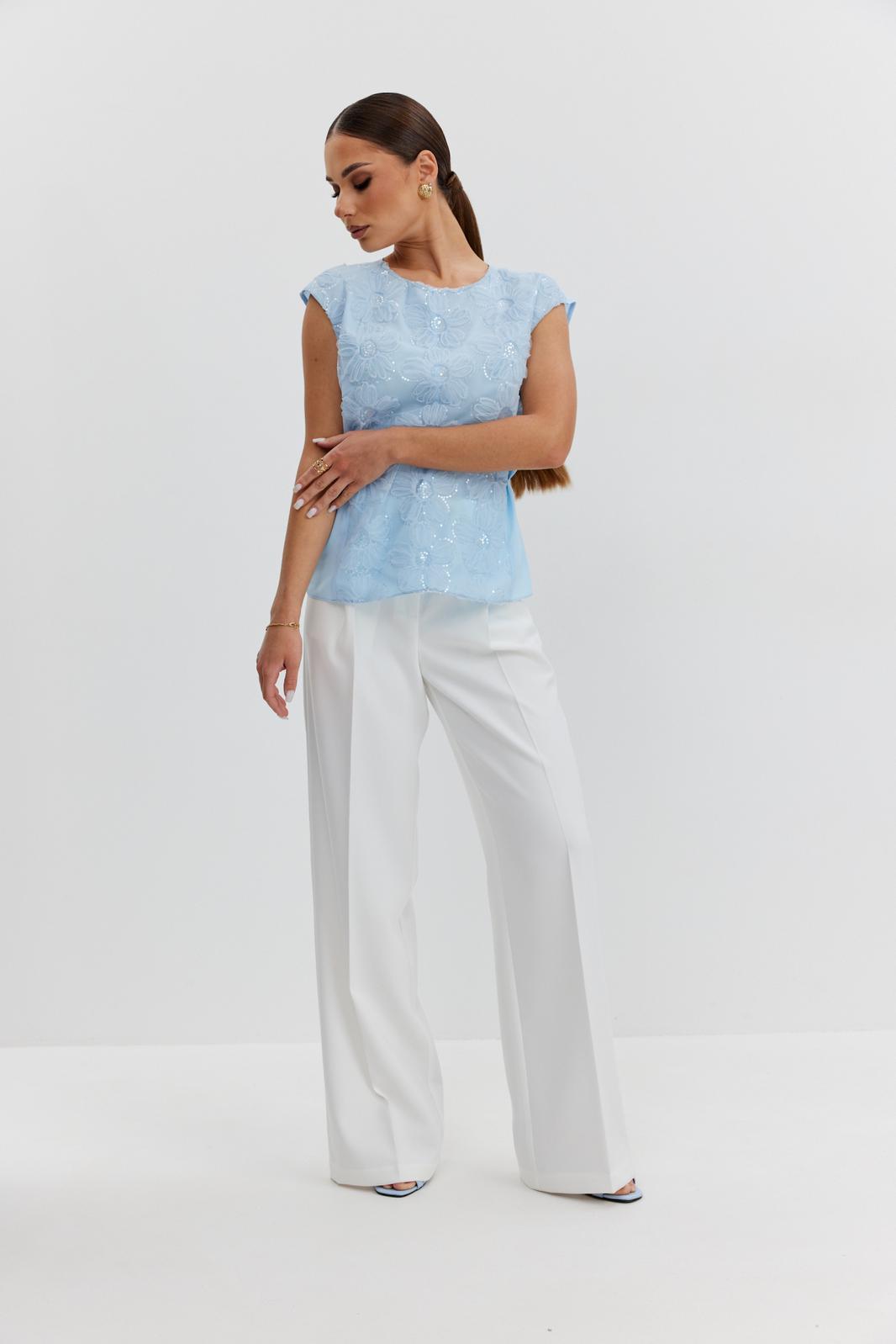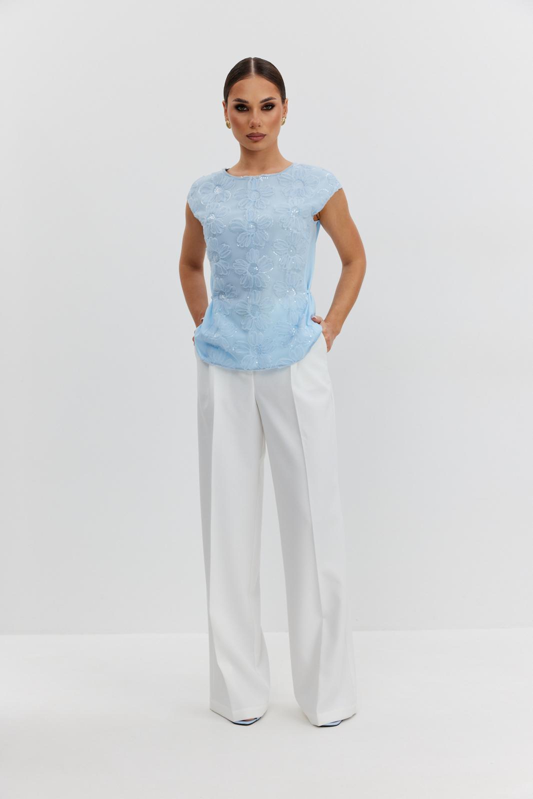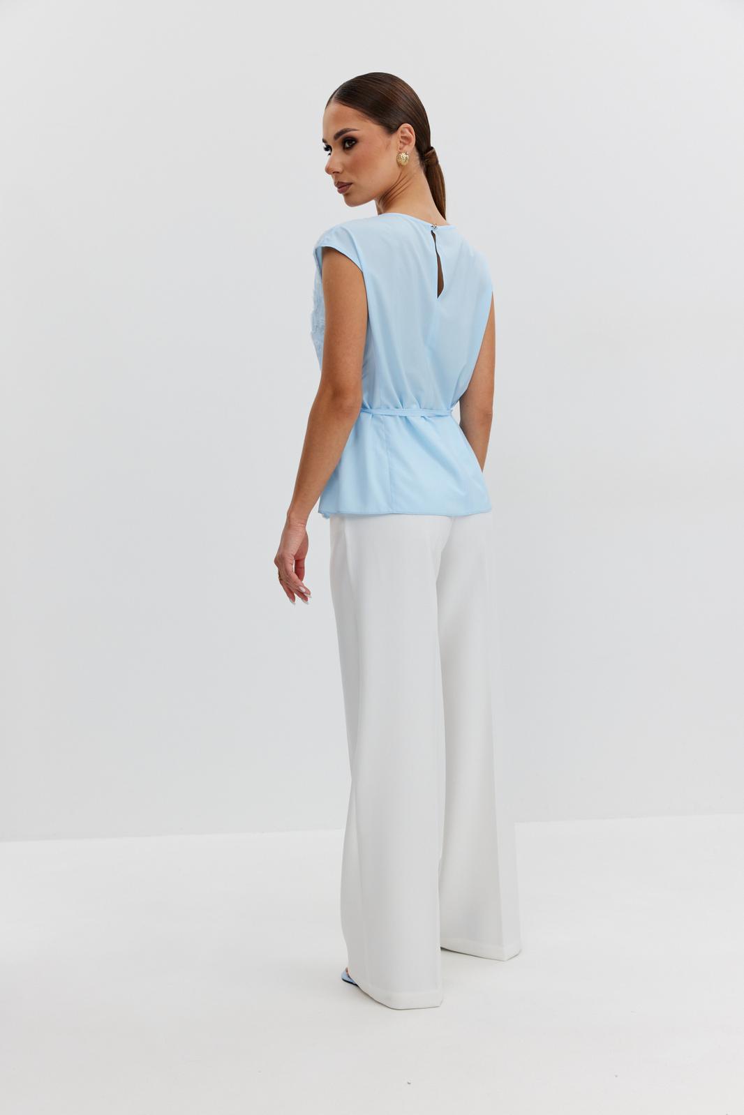 Блузка прямого силуэта со спущенным плечом. Перед из фактурной ткани «ромашки на сетке», спинка из полупрозрачной ткани «органза». Горловина округлой формы, по спинке застежка на навесную петлю и пуговицу. Перед на атласной подкладке.