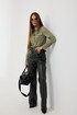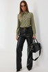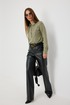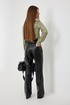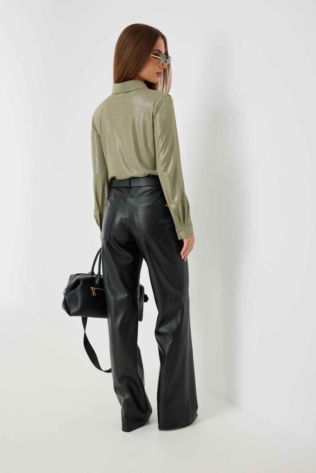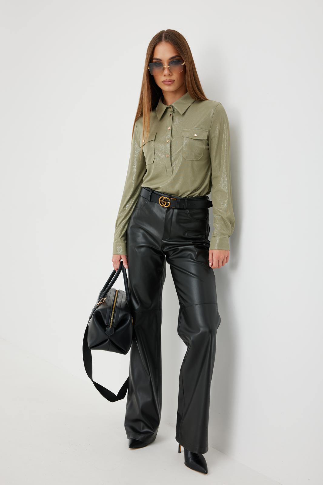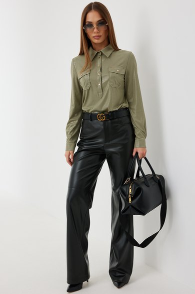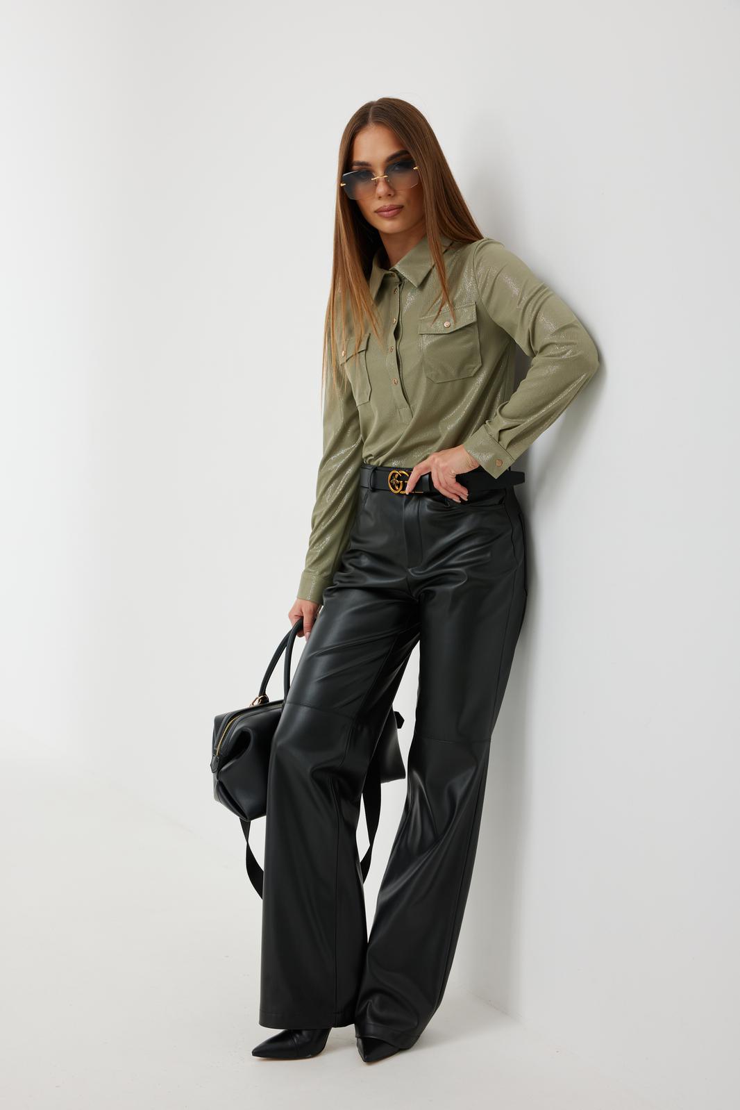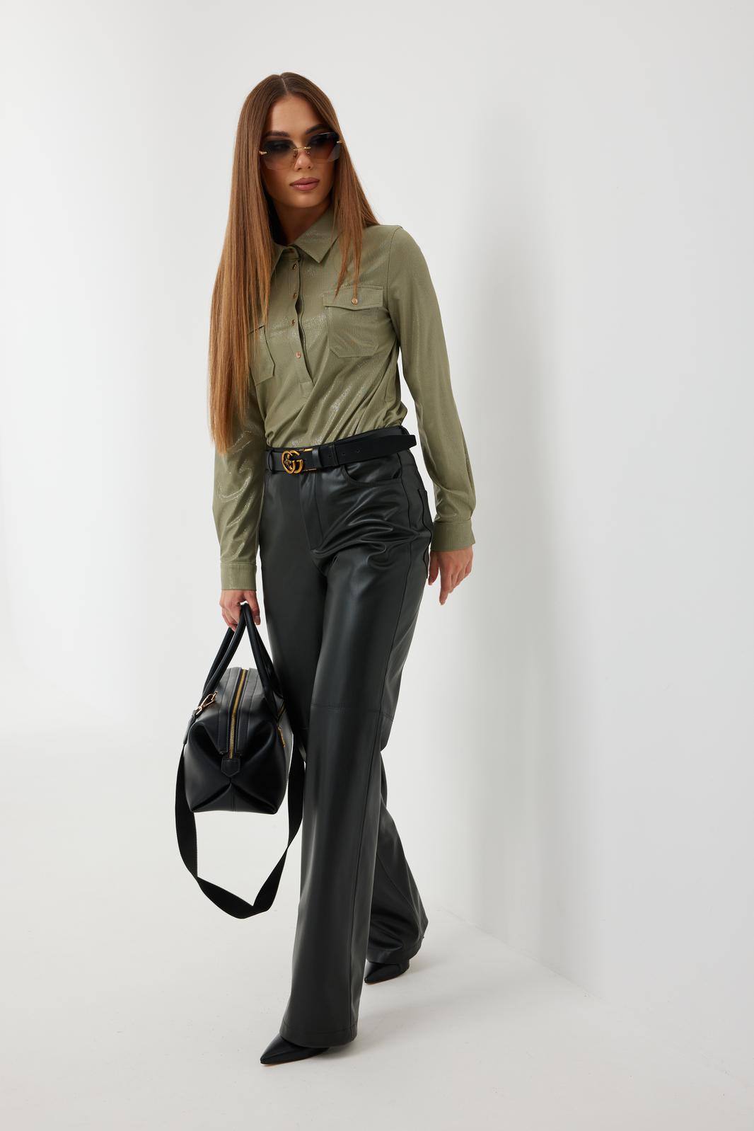 Брюки прямого силуэта из «эко» кожи. Застёжка по переду на молнию и кнопку на поясе. Пояс притачной со шлёвками. По переду боковые карманы. Сзади накладные карманы. На брюках выполнен декоративный подрез.