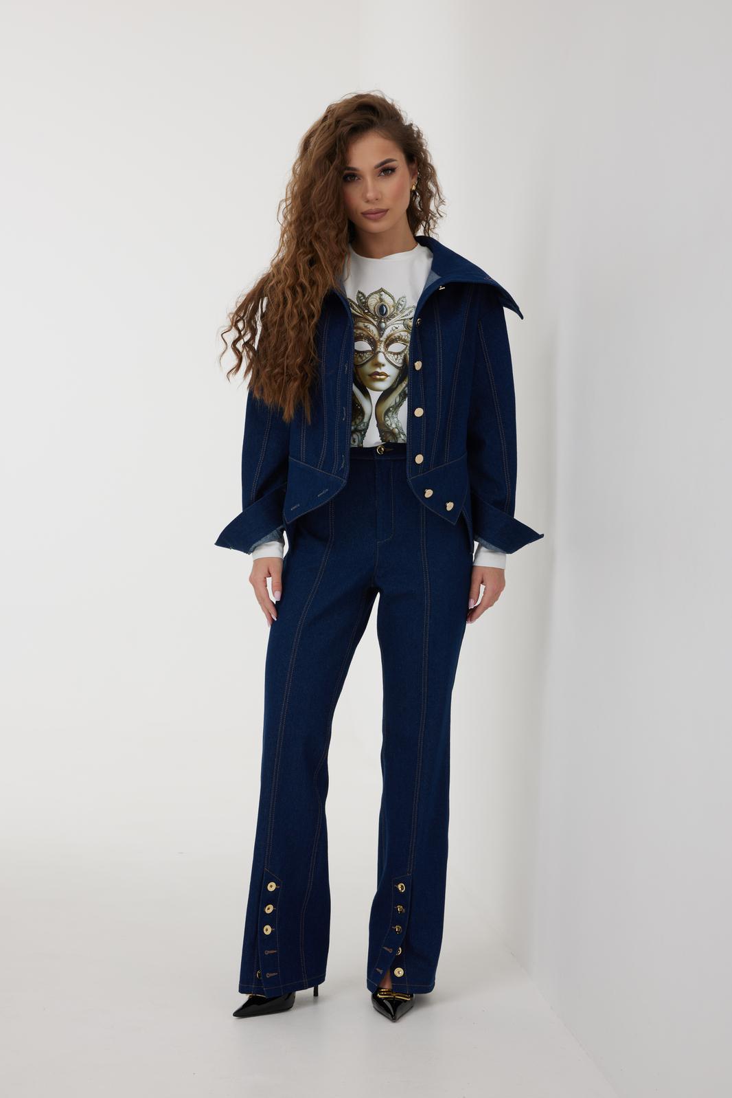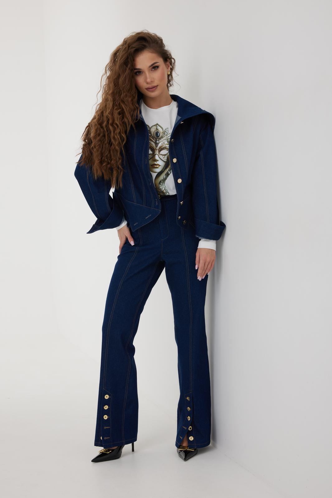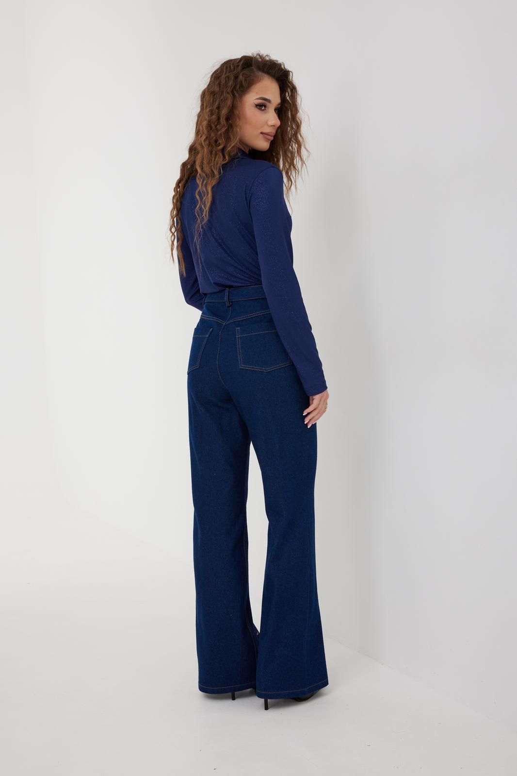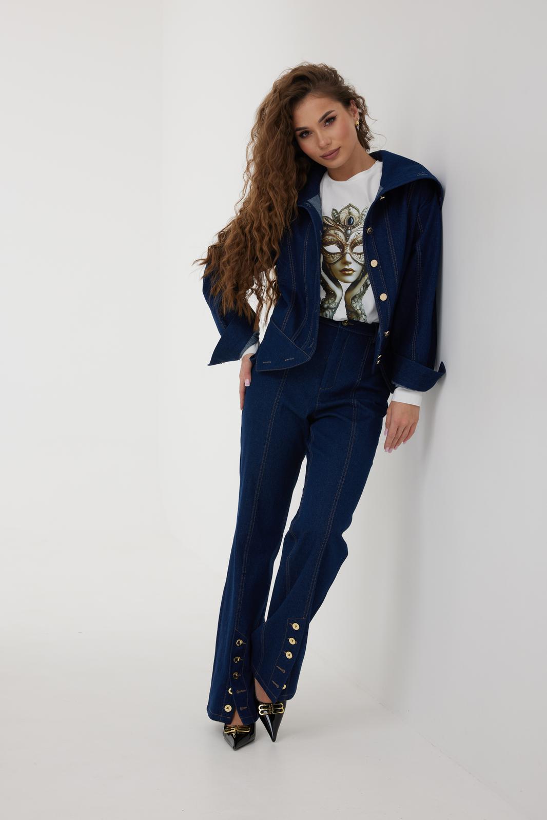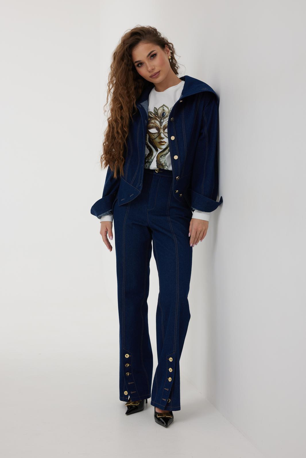 Брюки из джинса, прямого кроя, слегка расширенные к низу. Высокая посадка, пояс притачной, застежка спереди на молнию и джинсовую пуговицу. По переду боковые карманы, вертикальные швы заканчиваются шлицей с петлями и пуговицами, сзади под кокеткой накладные карманы.