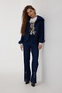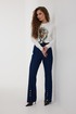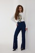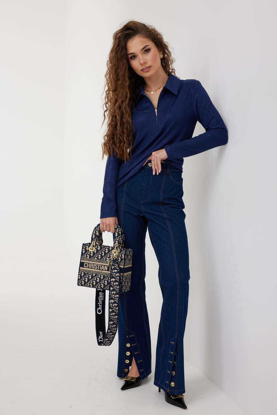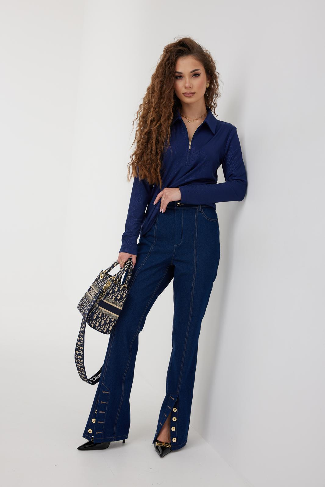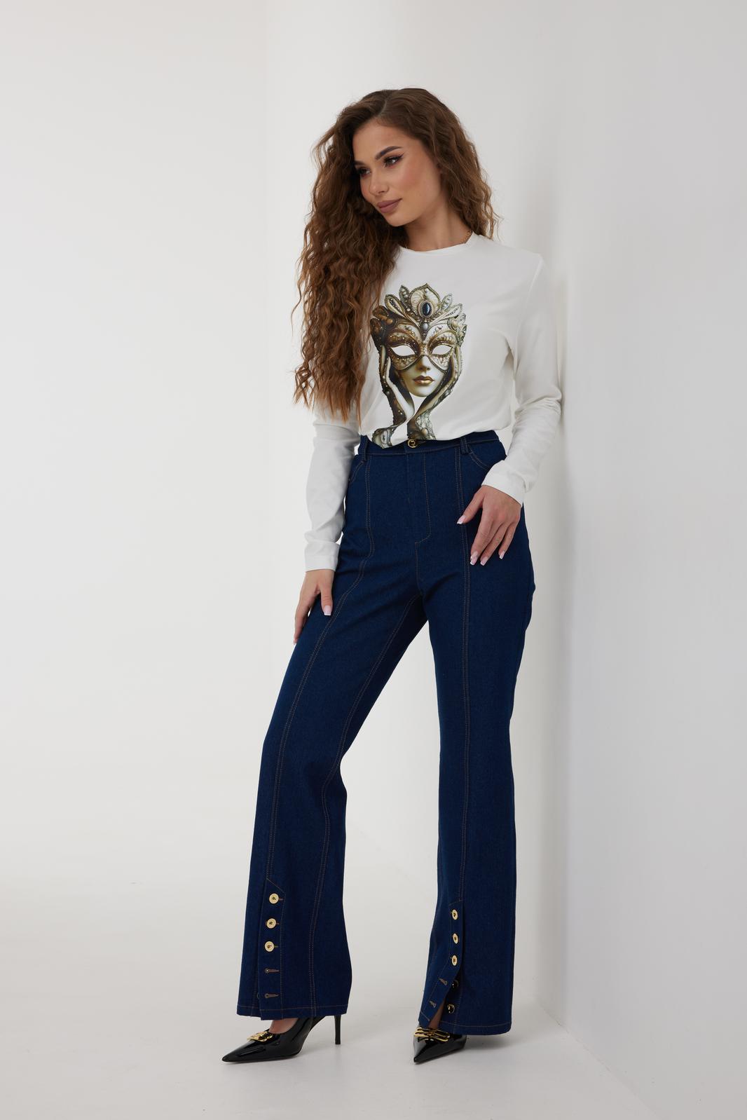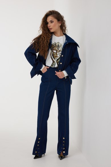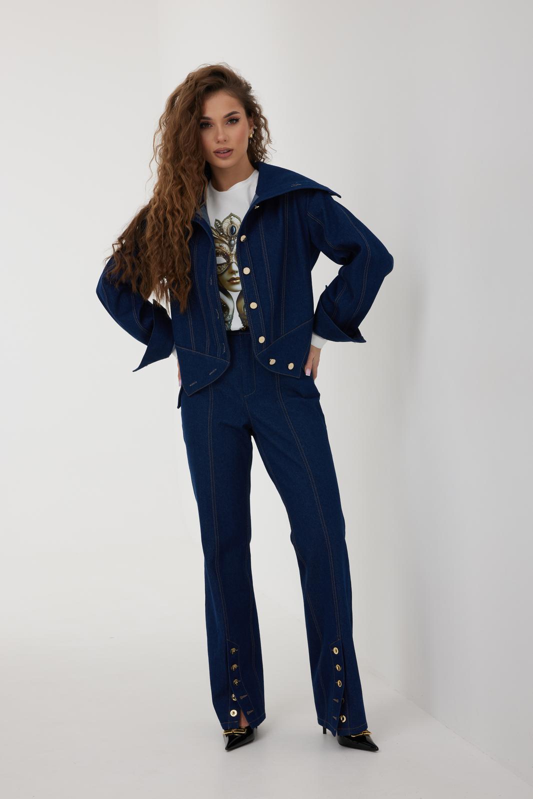 Брюки из джинса, прямого кроя, слегка расширенные к низу. Высокая посадка, пояс притачной, застежка спереди на молнию и джинсовую пуговицу. По переду боковые карманы, вертикальные швы заканчиваются шлицей с петлями и пуговицами, сзади под кокеткой накладные карманы.