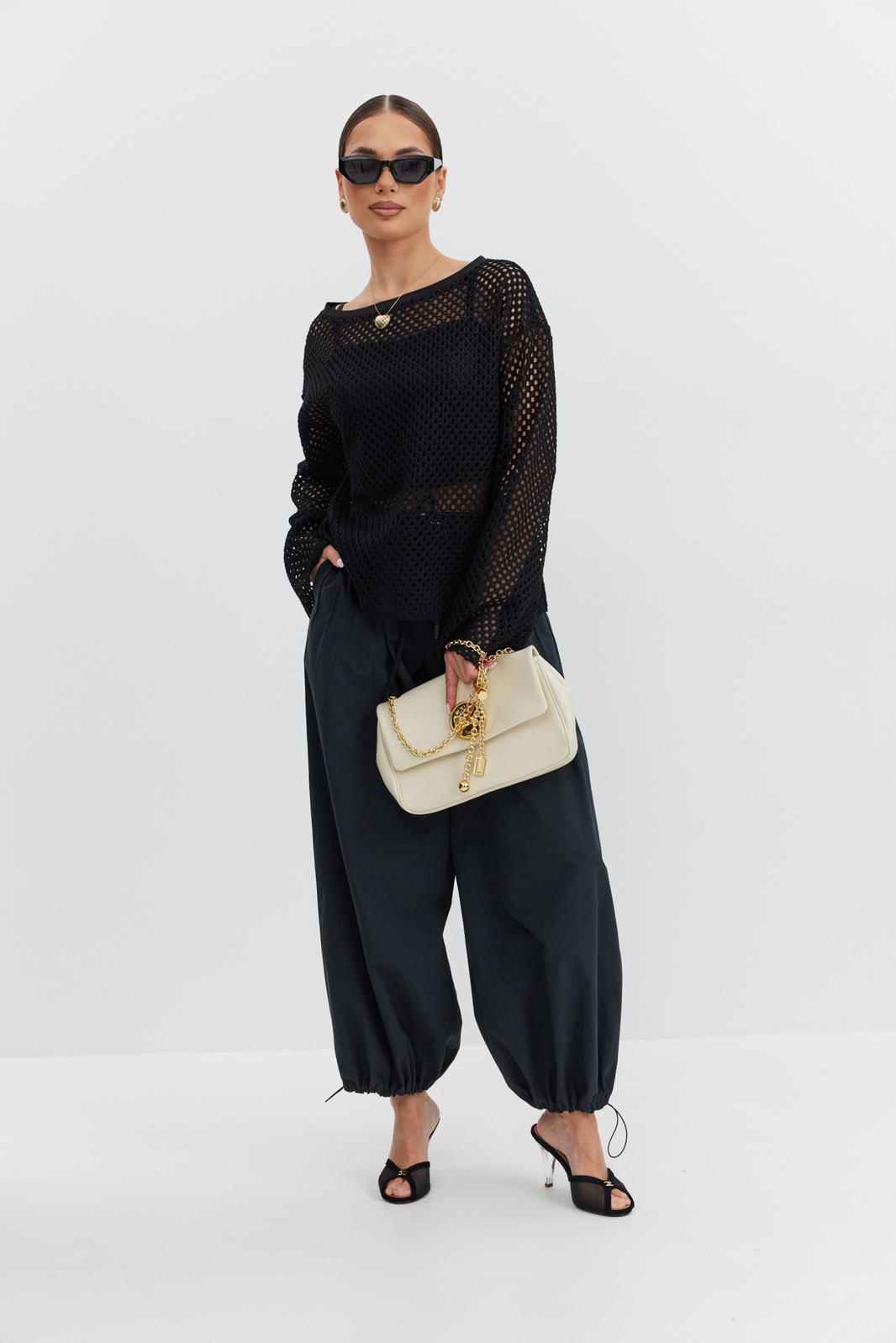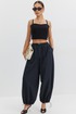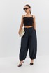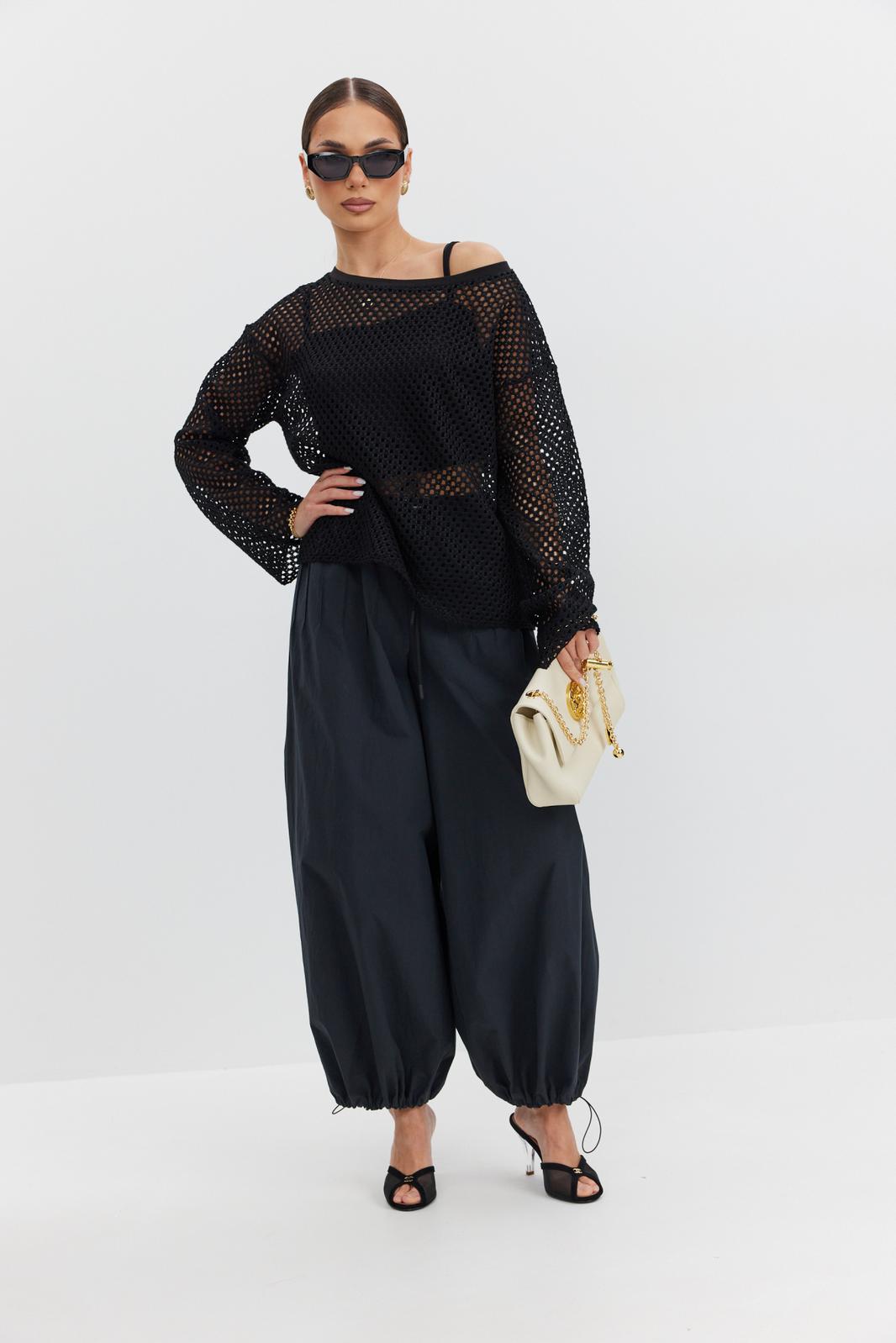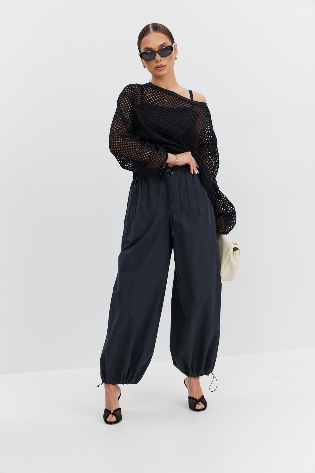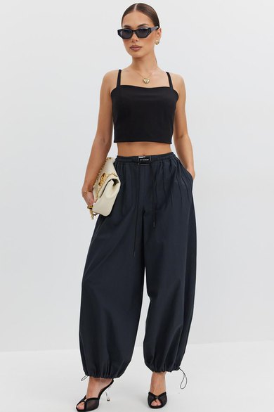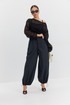Брюки женские объемные из ткани с «креш»-эффектом актуального кроя - «алладины», по низу кулиса с резинкой и фиксатором, высокая посадка, брюки на резинке, пояс притачной со шнуром, боковые карманы в швах, по переду декоративные элементы в виде защипов, застроченных до уровня бедер.