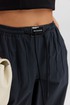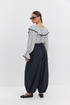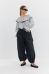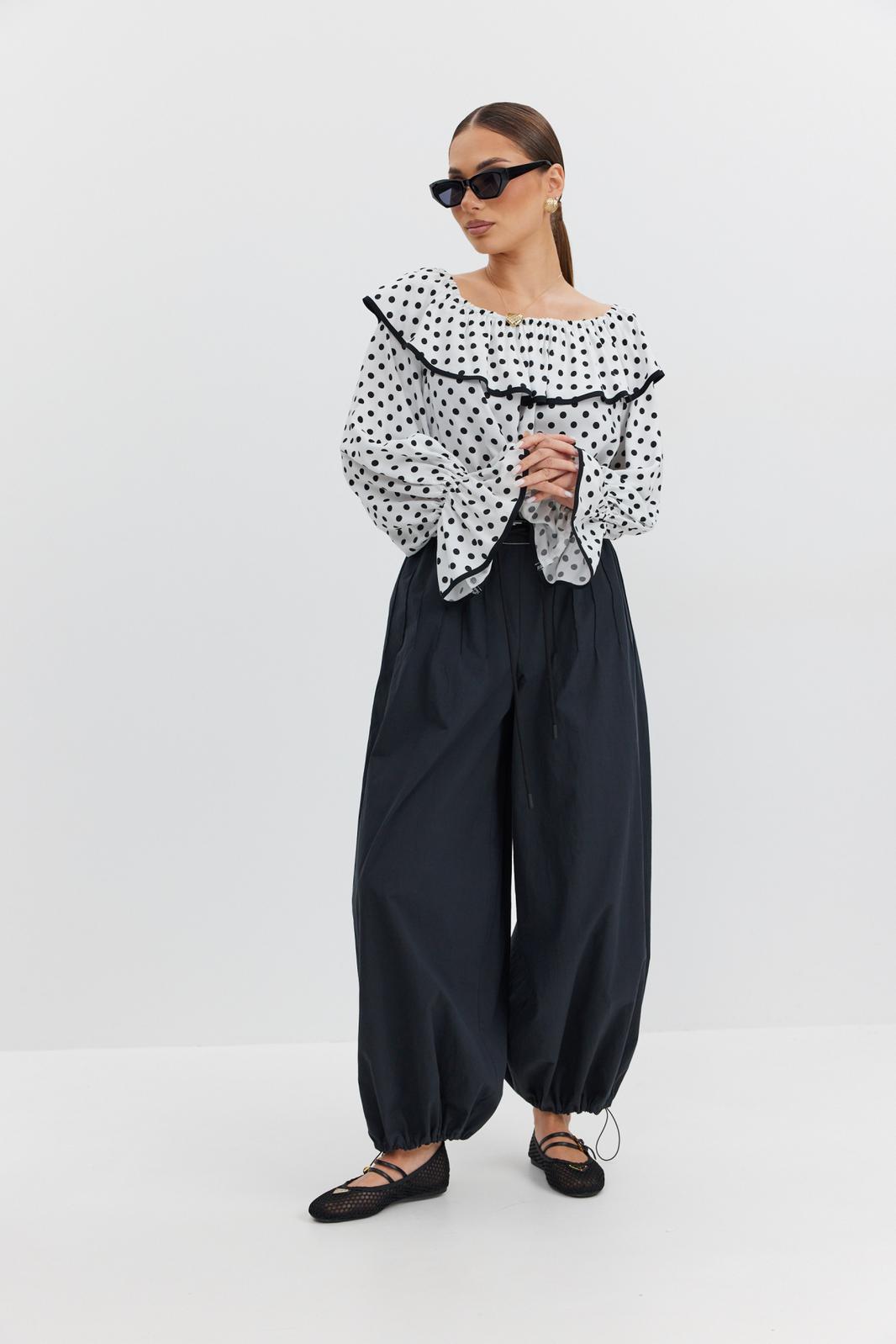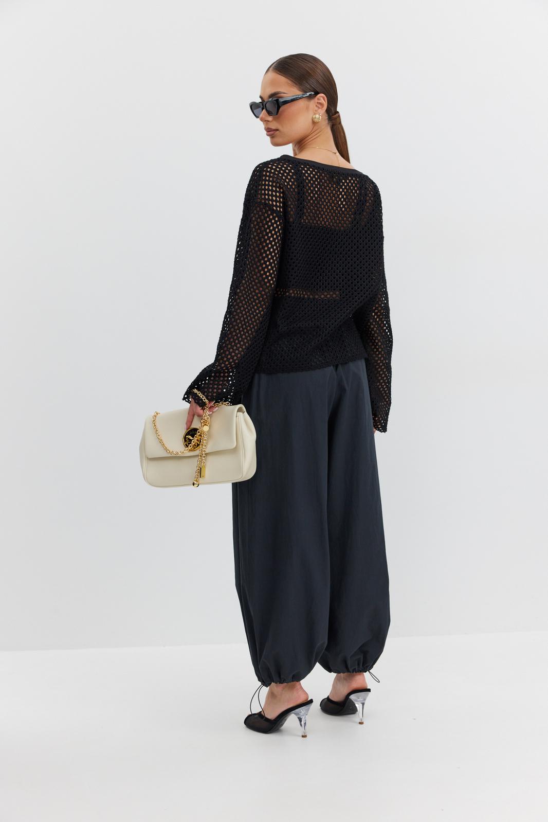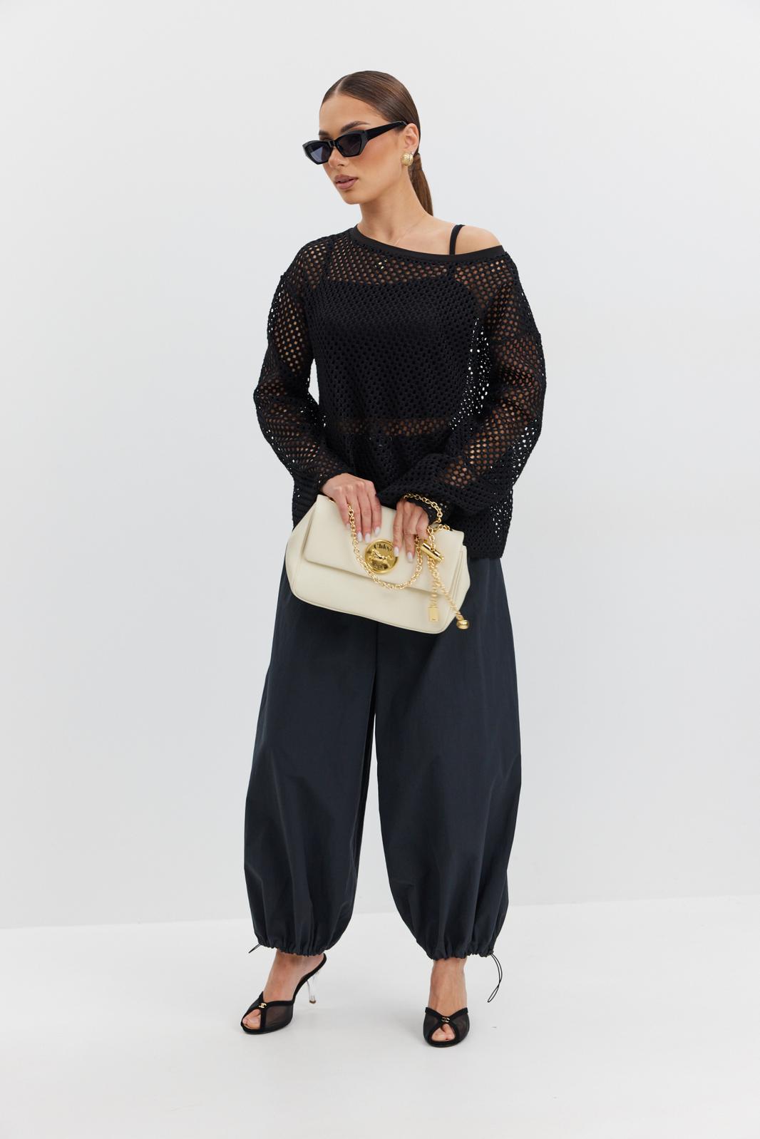 Брюки женские объемные из ткани с «креш»-эффектом актуального кроя - «алладины», по низу кулиса с резинкой и фиксатором, высокая посадка, брюки на резинке, пояс притачной со шнуром, боковые карманы в швах, по переду декоративные элементы в виде защипов, застроченных до уровня бедер.