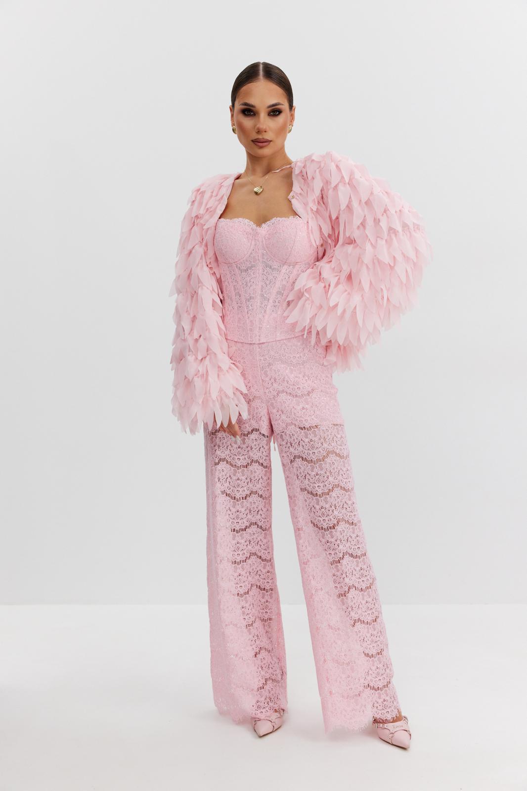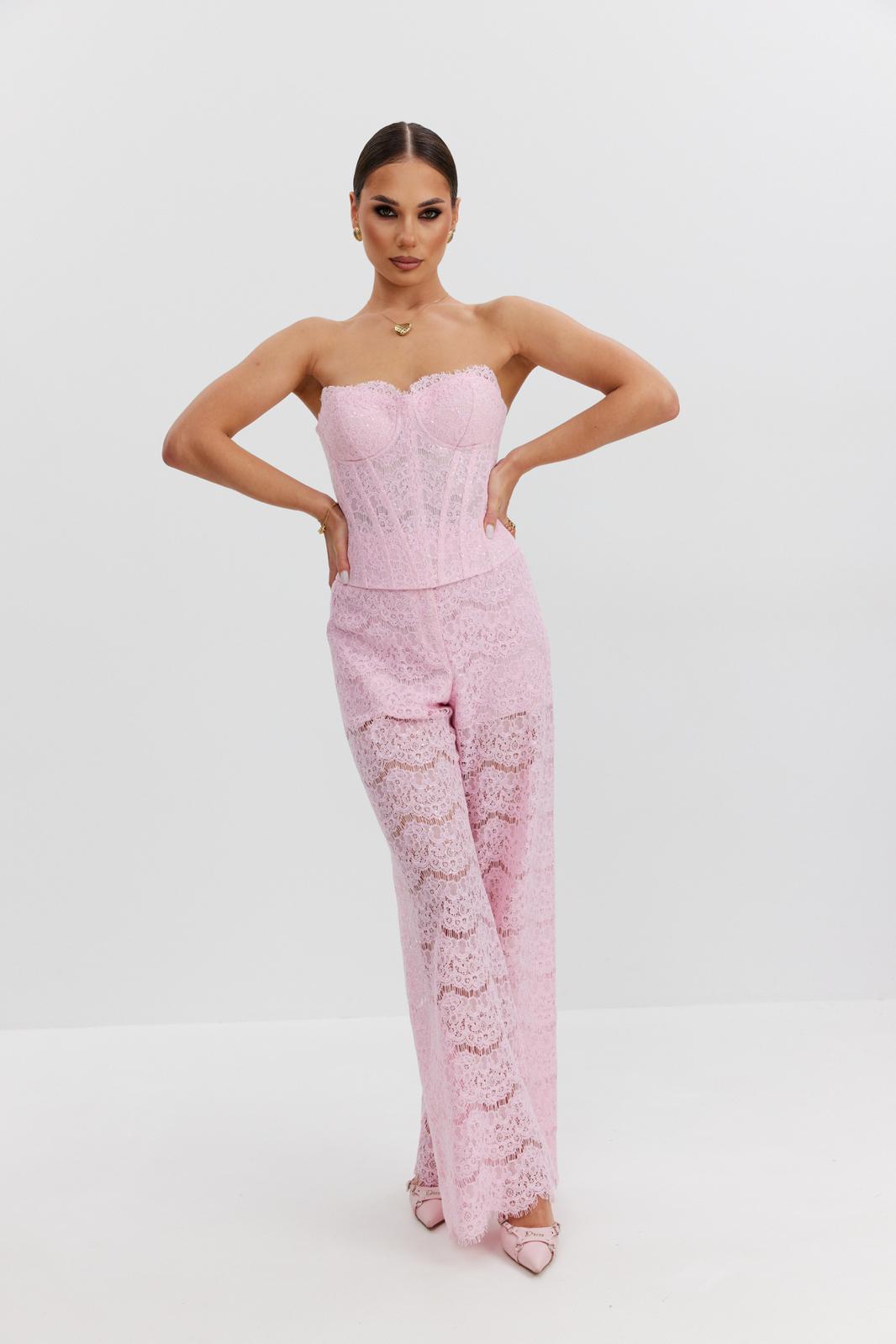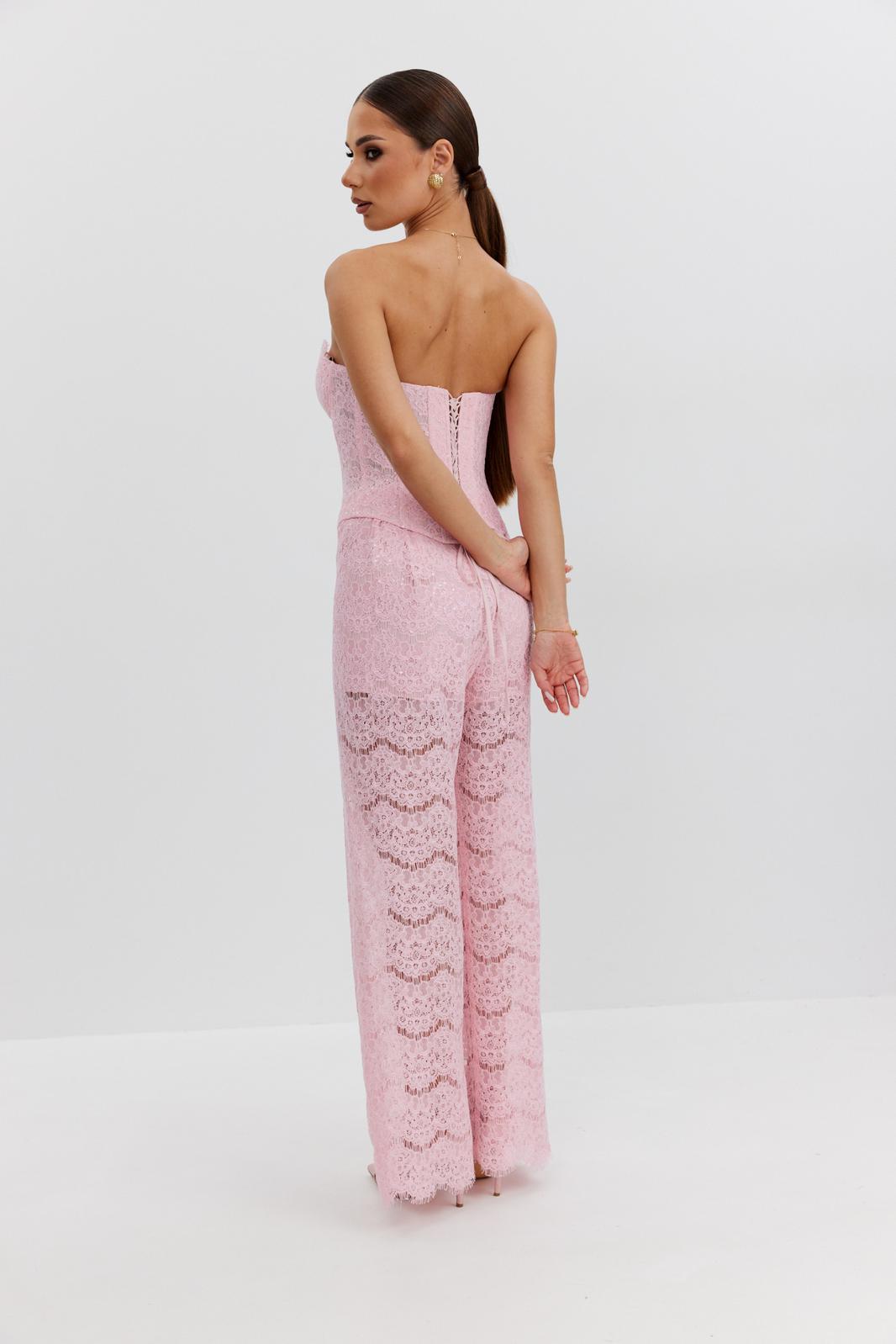 Брюки женские из эластичного кружева с пайетками, прямого кроя, высокая посадка, пояс притачной, частично на резинке, застежка спереди на молнию и скрытый крючок. По задним половинкам талиевые вытачки. Низ брюк выполнен с фигурным фестончатым краем. Брюки с укороченной подкладкой-шортиками в тон кружева.
