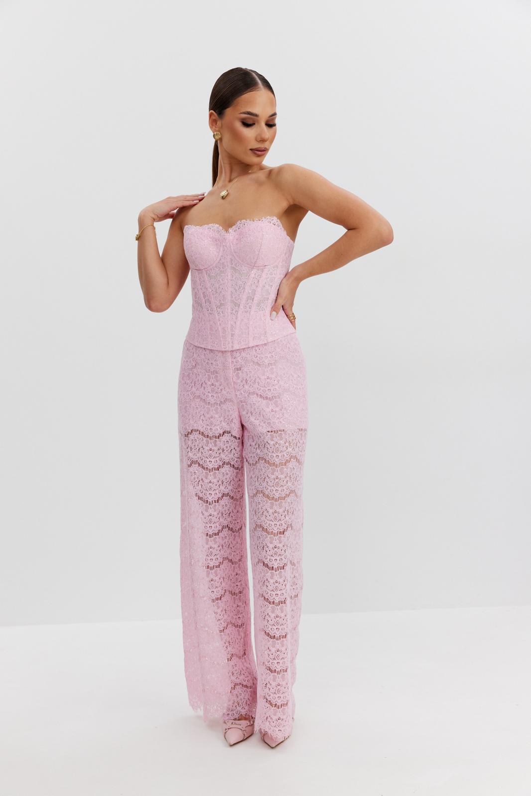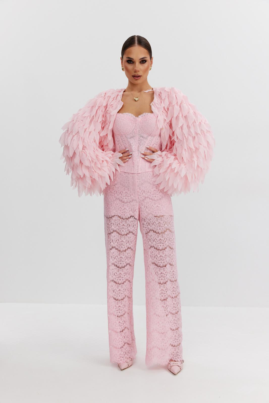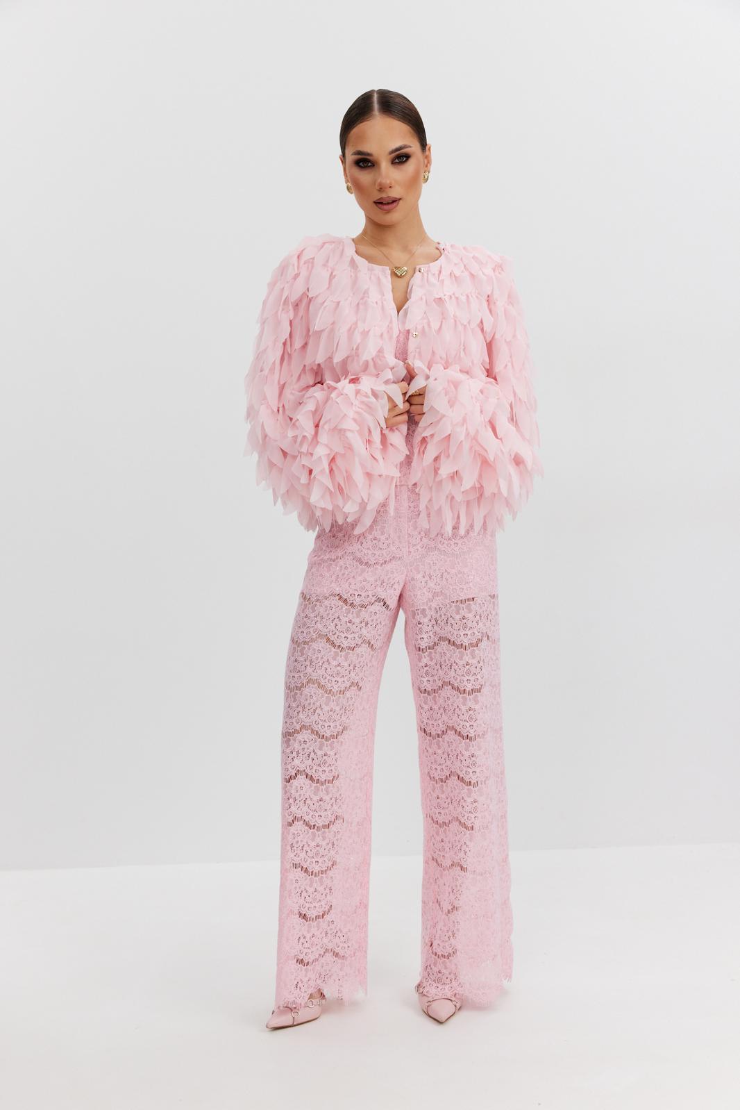 Брюки женские из эластичного кружева с пайетками, прямого кроя, высокая посадка, пояс притачной, частично на резинке, застежка спереди на молнию и скрытый крючок. По задним половинкам талиевые вытачки. Низ брюк выполнен с фигурным фестончатым краем. Брюки с укороченной подкладкой-шортиками в тон кружева.
