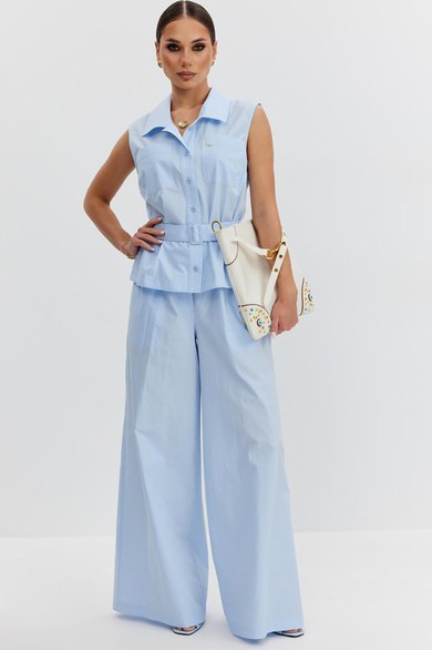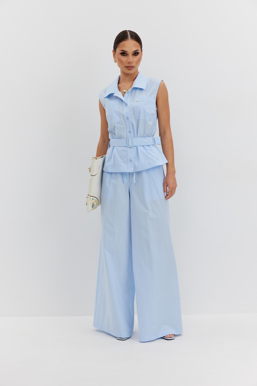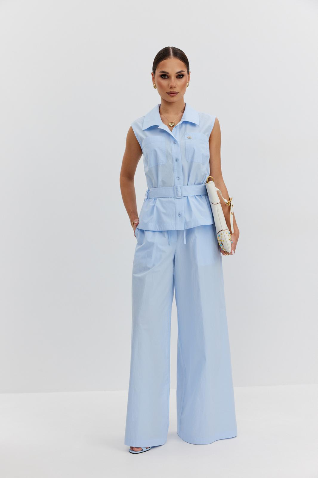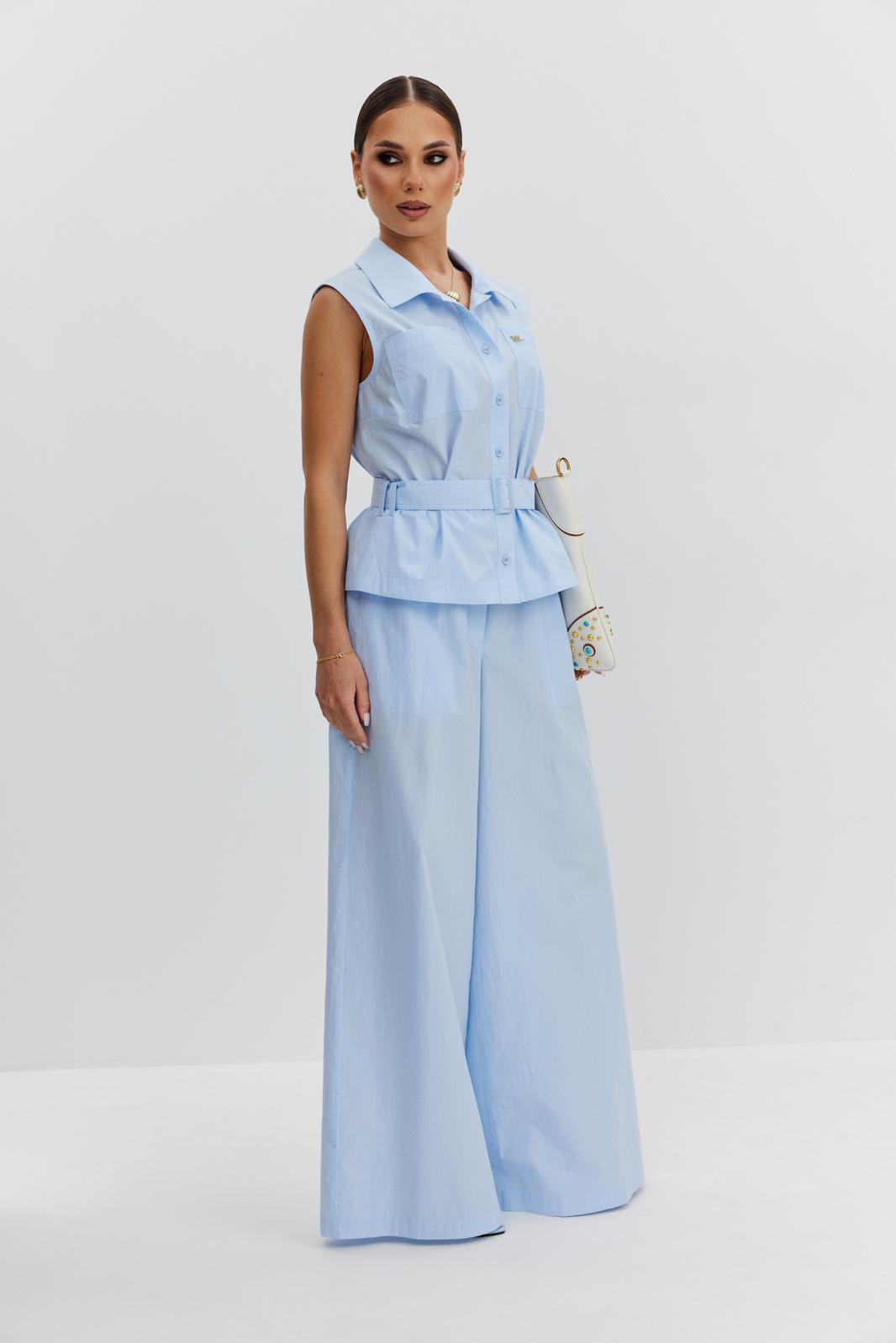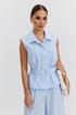 Блузка женская полуприлегающего силуэта, из хлопковой ткани с «креш»-эффектом. Спинка со средним швом. Застежка на планку и 6 петель и пуговиц, по переду накладные карманы, низ блузки на обтачке. Воротник рубашечный отложной. В комплекте пояс из основной ткани с декоративной пряжкой.