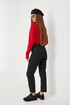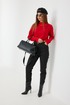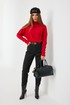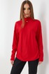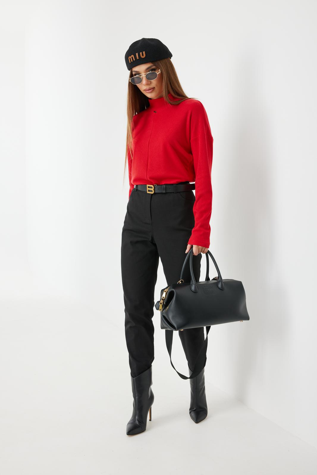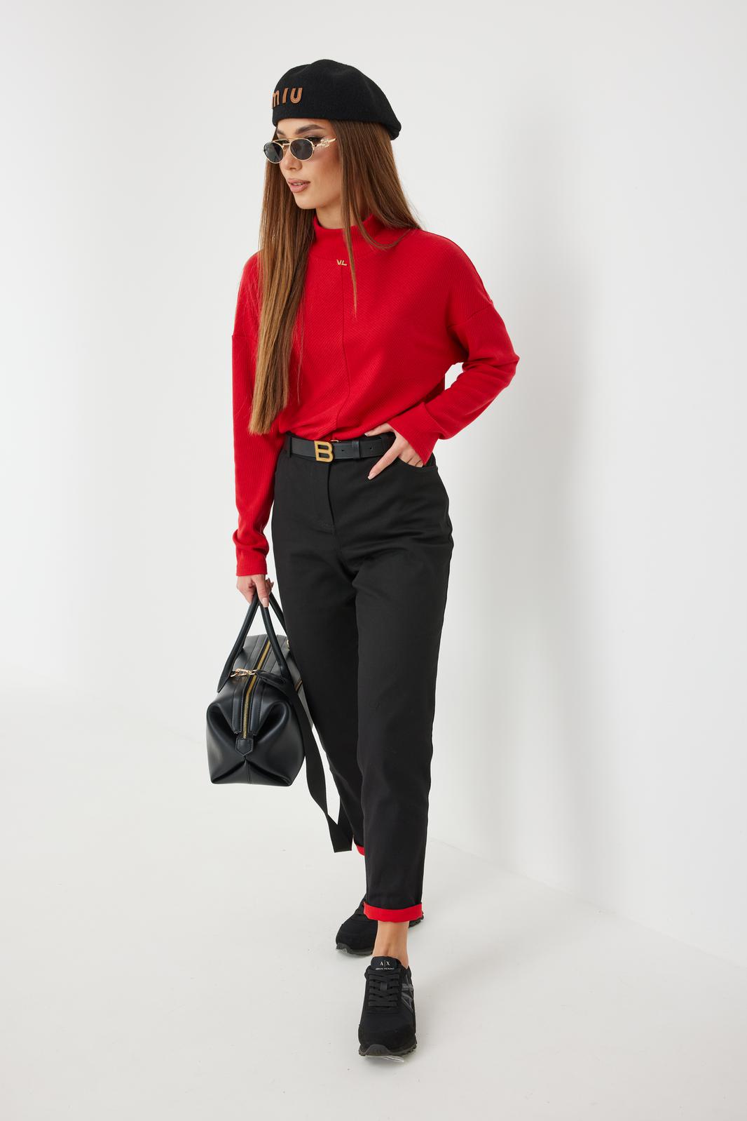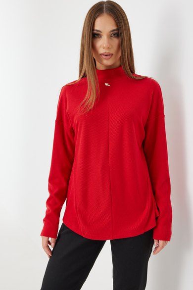Джемпер свободного силуэта со спущенной на руку проймой. По горловине притачная стойка. По бокам джемпера фигурные подрезы. Рукав полной длины, зауженный к низу.