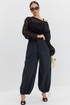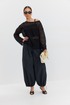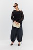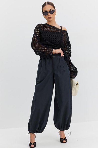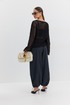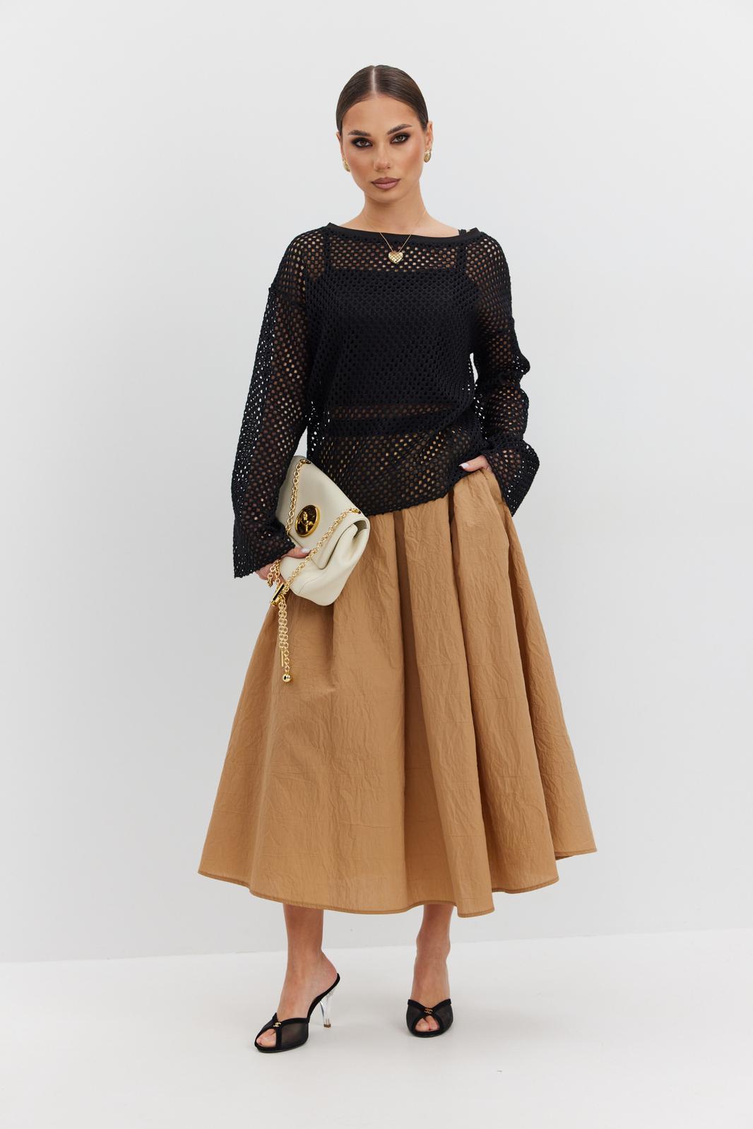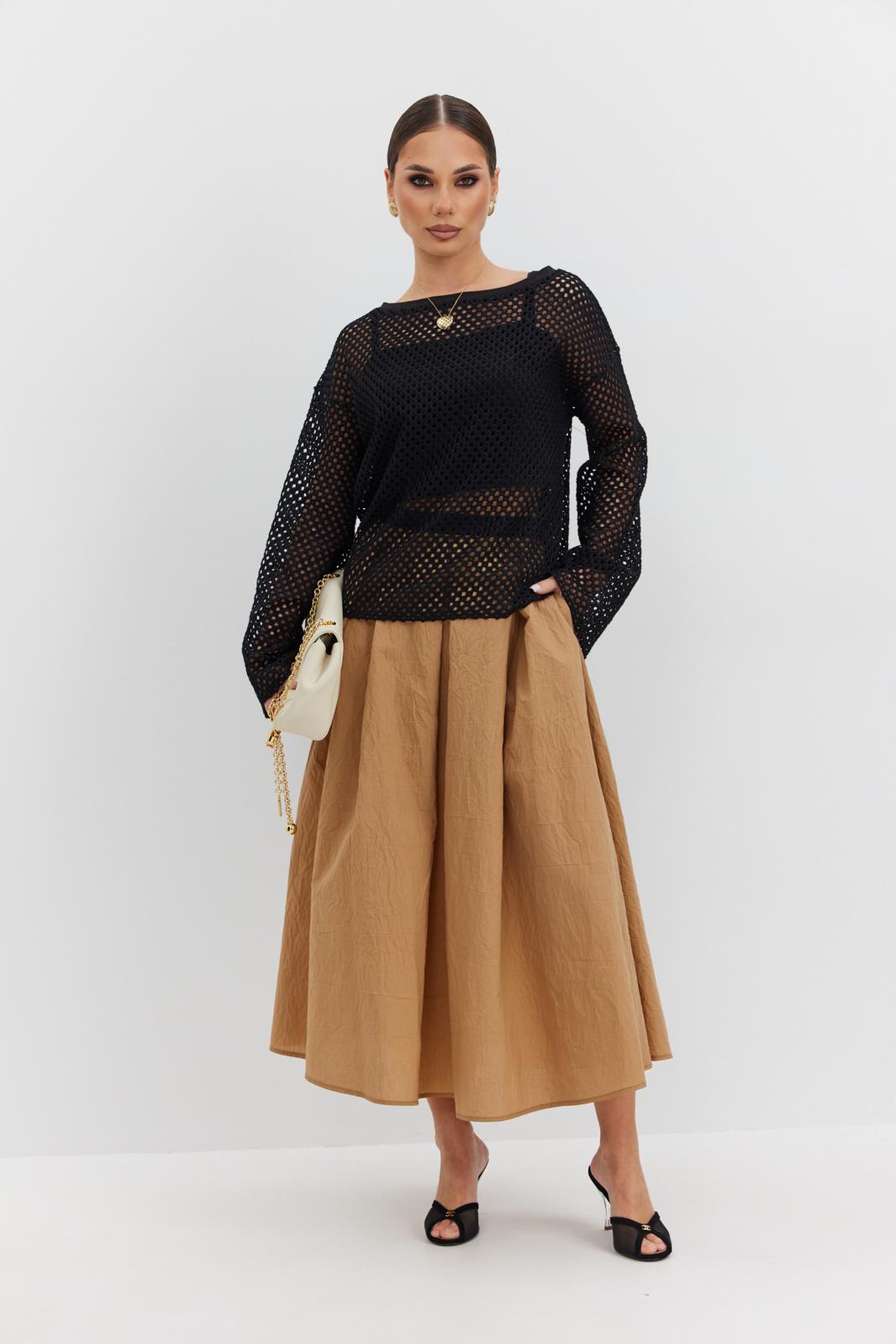 Джемпер прямого силуэта из фактурной ткани «сетка». Горловина округлой формы, рукав расширенный к низу.