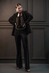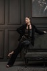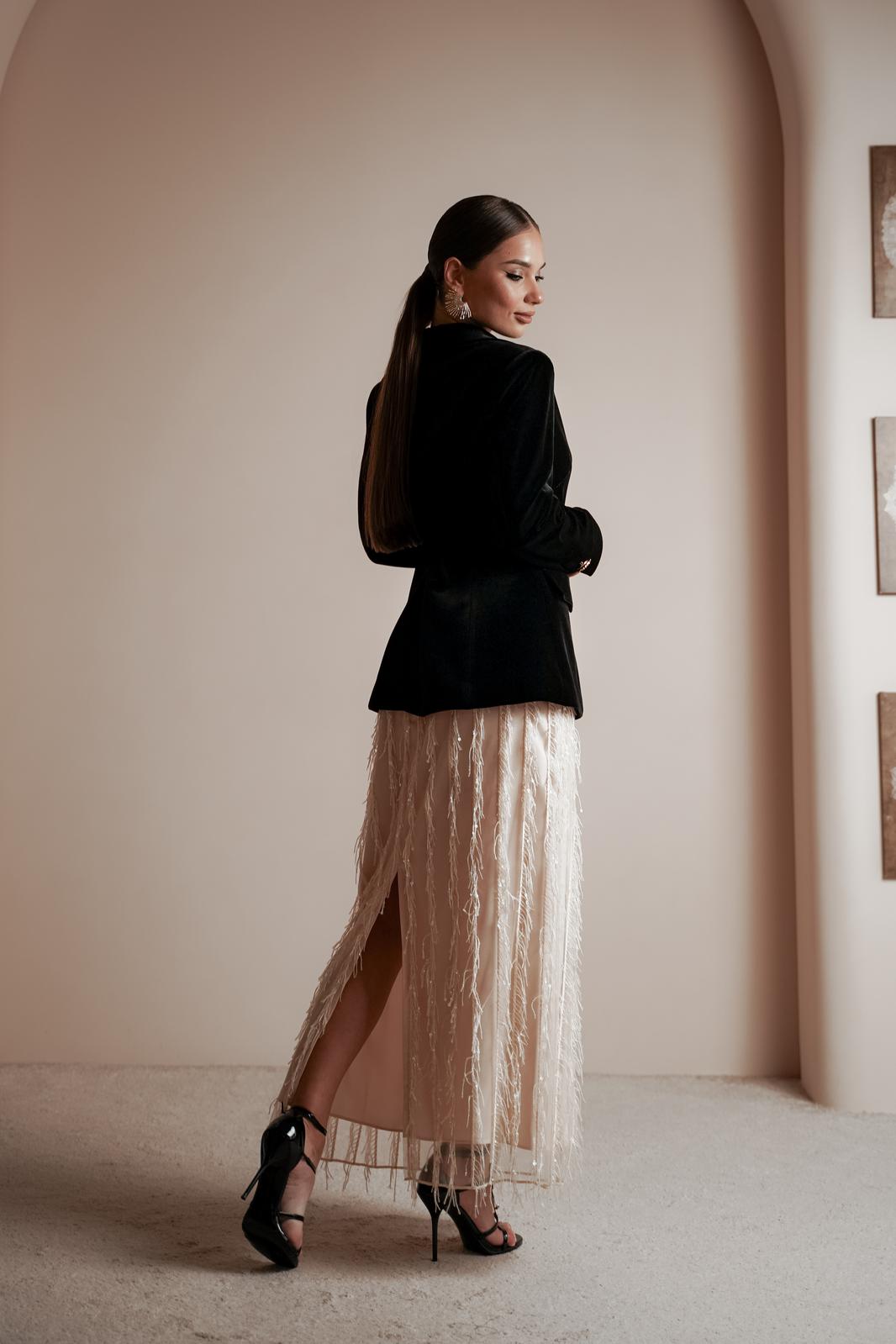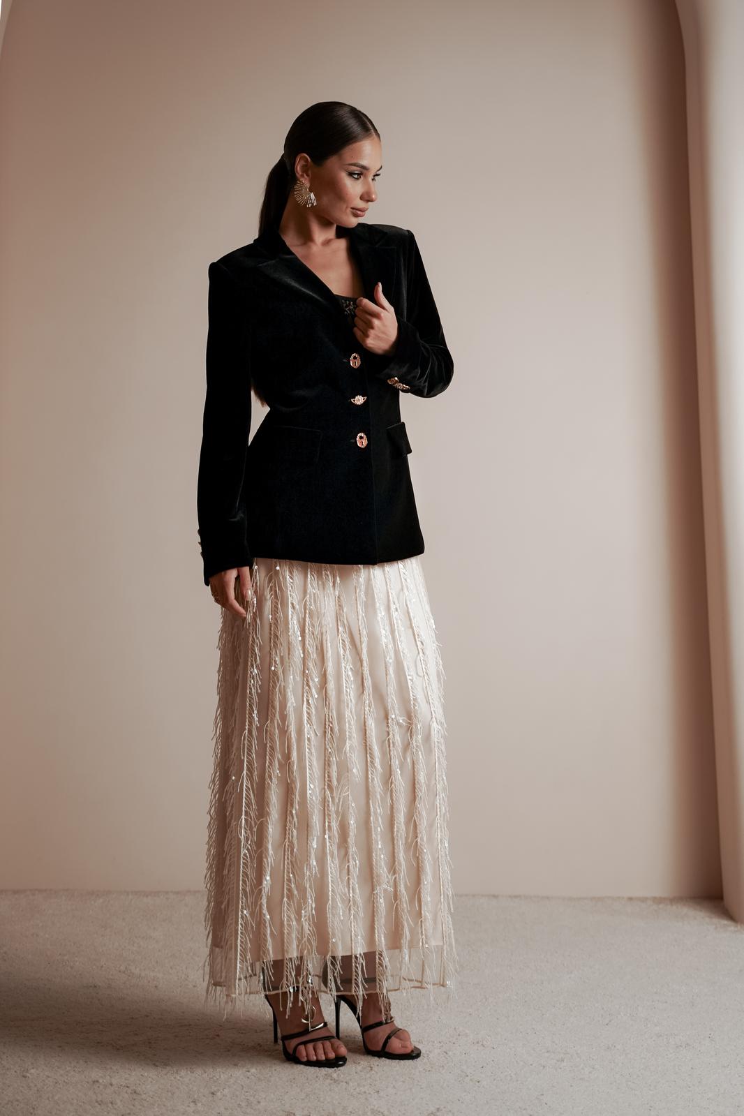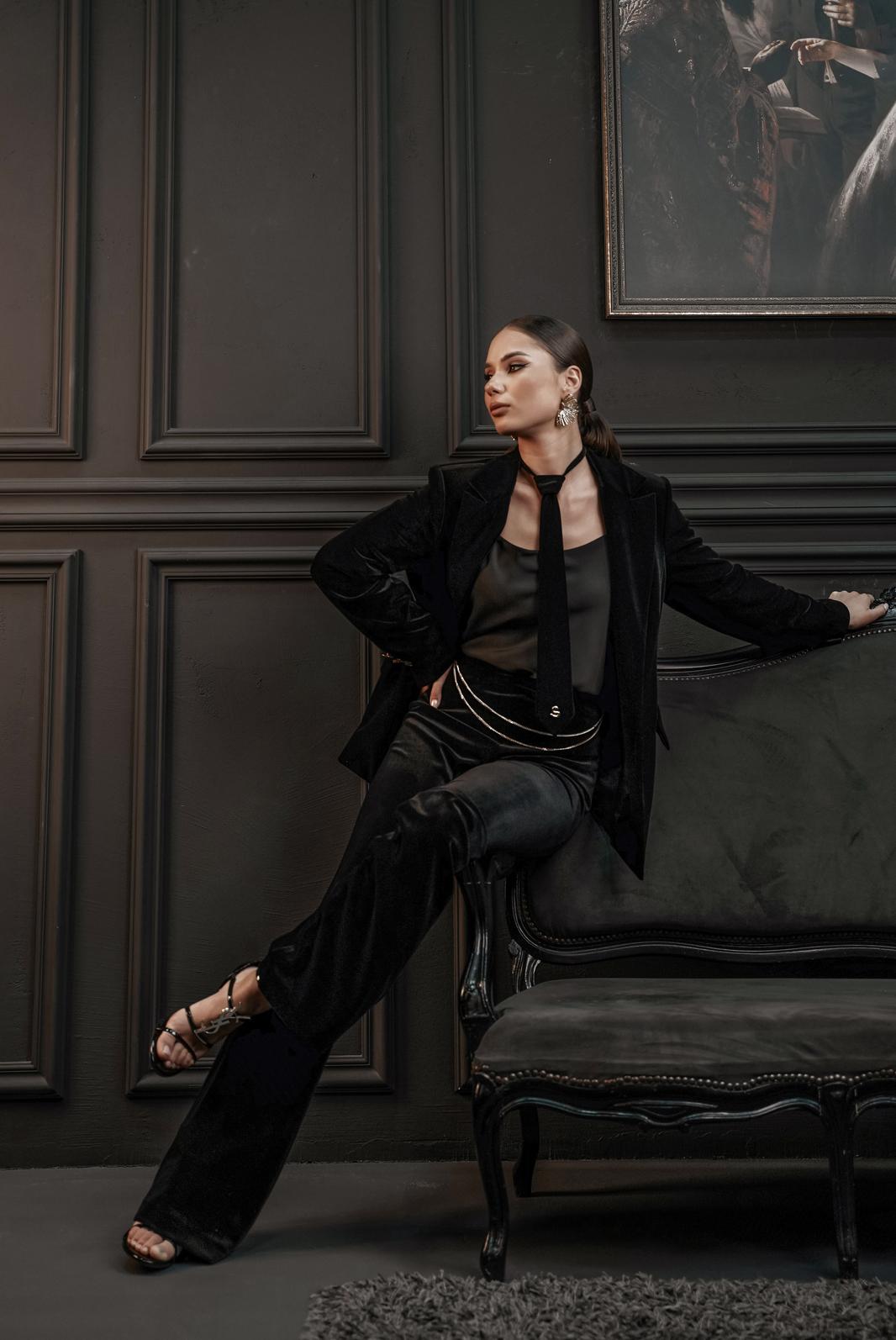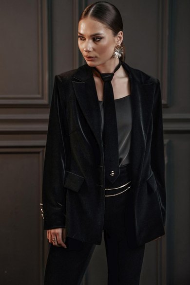 Жакет из полотна «бархат», полуприлегающего силуэта, с центральной застежкой на три петли и декоративные пуговицы. Перед с нагрудной вытачкой, отрезным бочком, с настрочным клапаном. Спинка с отрезным бочком, средний шов заканчивается открытой шлицей. Шлица длинного рукава украшена декоративными пуговицами. Воротник пиджачный.