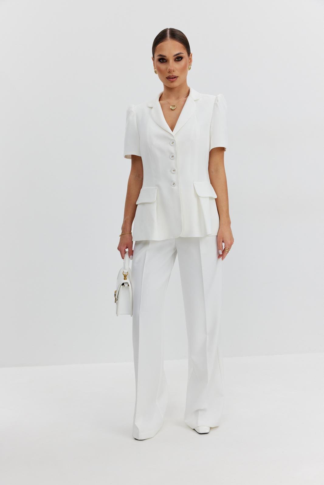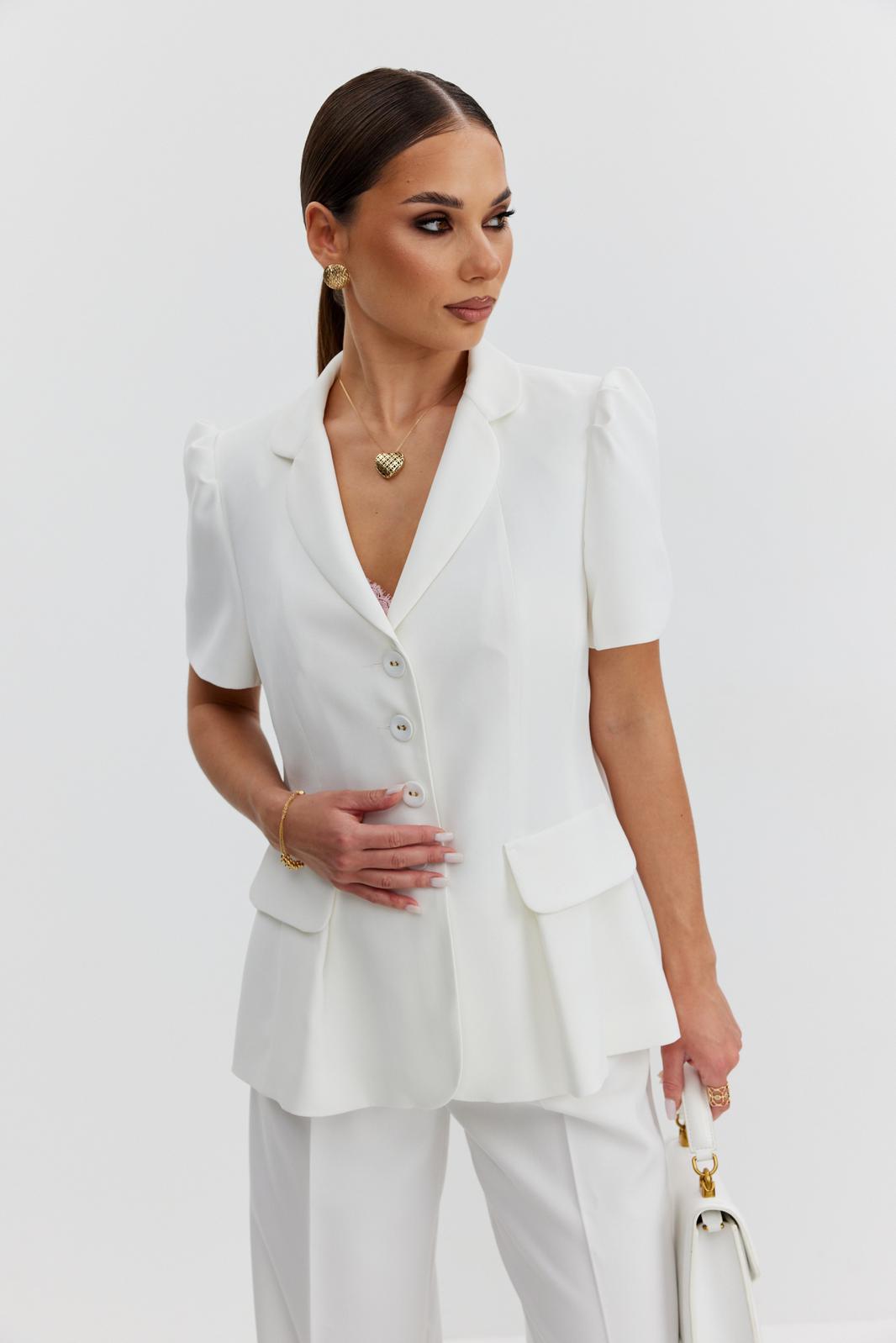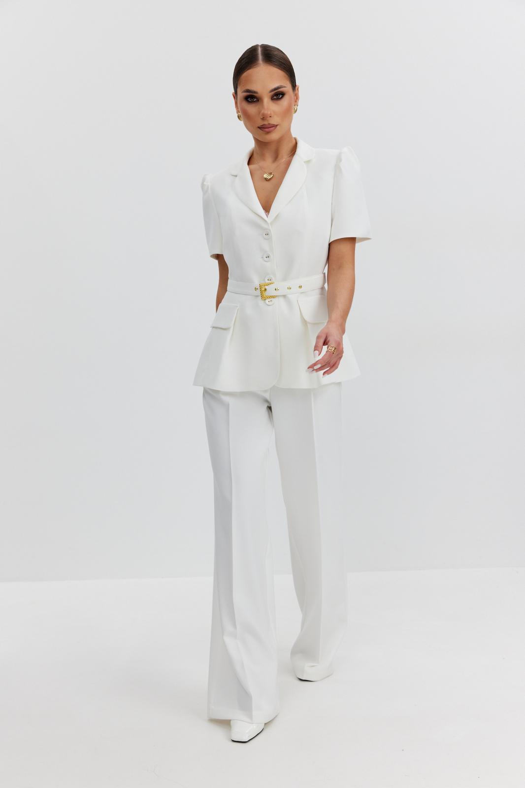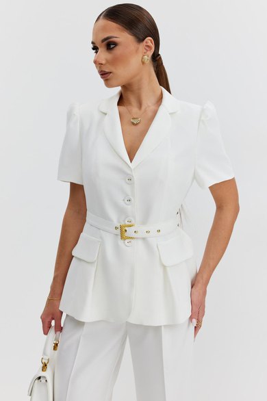 Жакет из костюмно-плательной ткани полуприлегающего силуэта, с центральной застежкой на четыре петли и обтяжные пуговицы. Перед с отрезным бочком и клапаном, центральный рельеф переходит в складку. Спинка с отрезным бочком и средним швом. Рукав втачной короткий, по окату заложены складки. Воротник пиджачный. В модели съемный пояс с декоративной пряжкой. Жакет на подкладке с плечевыми накладками.