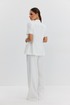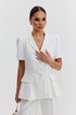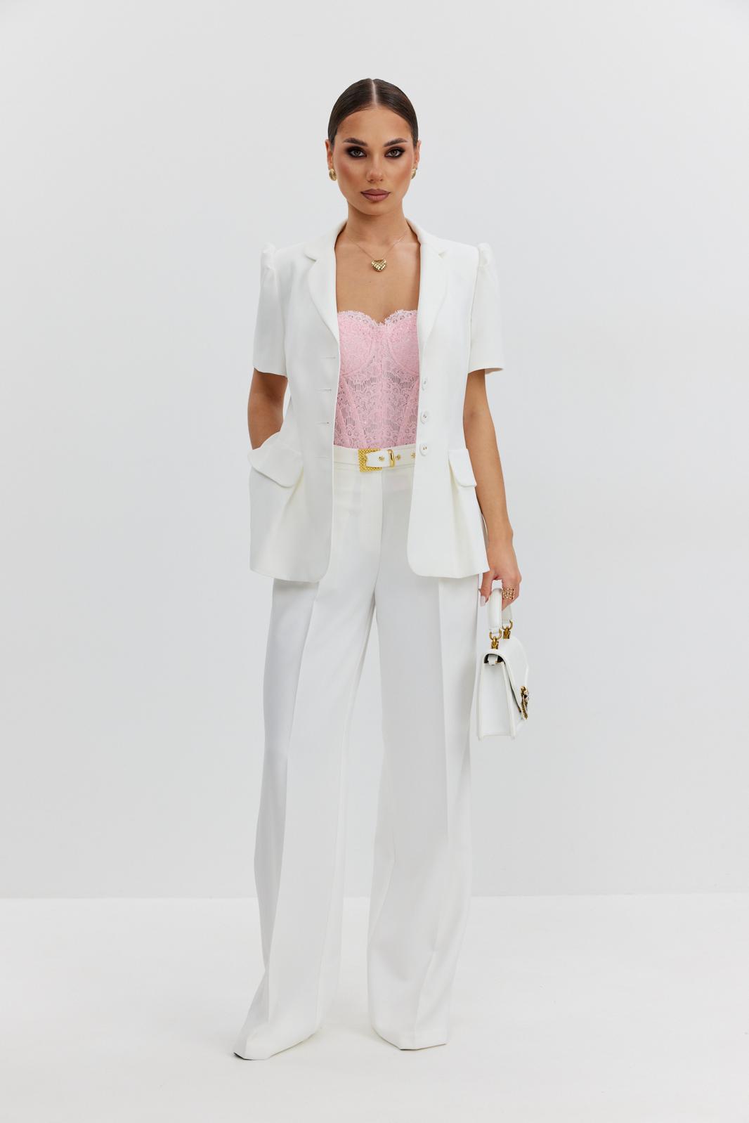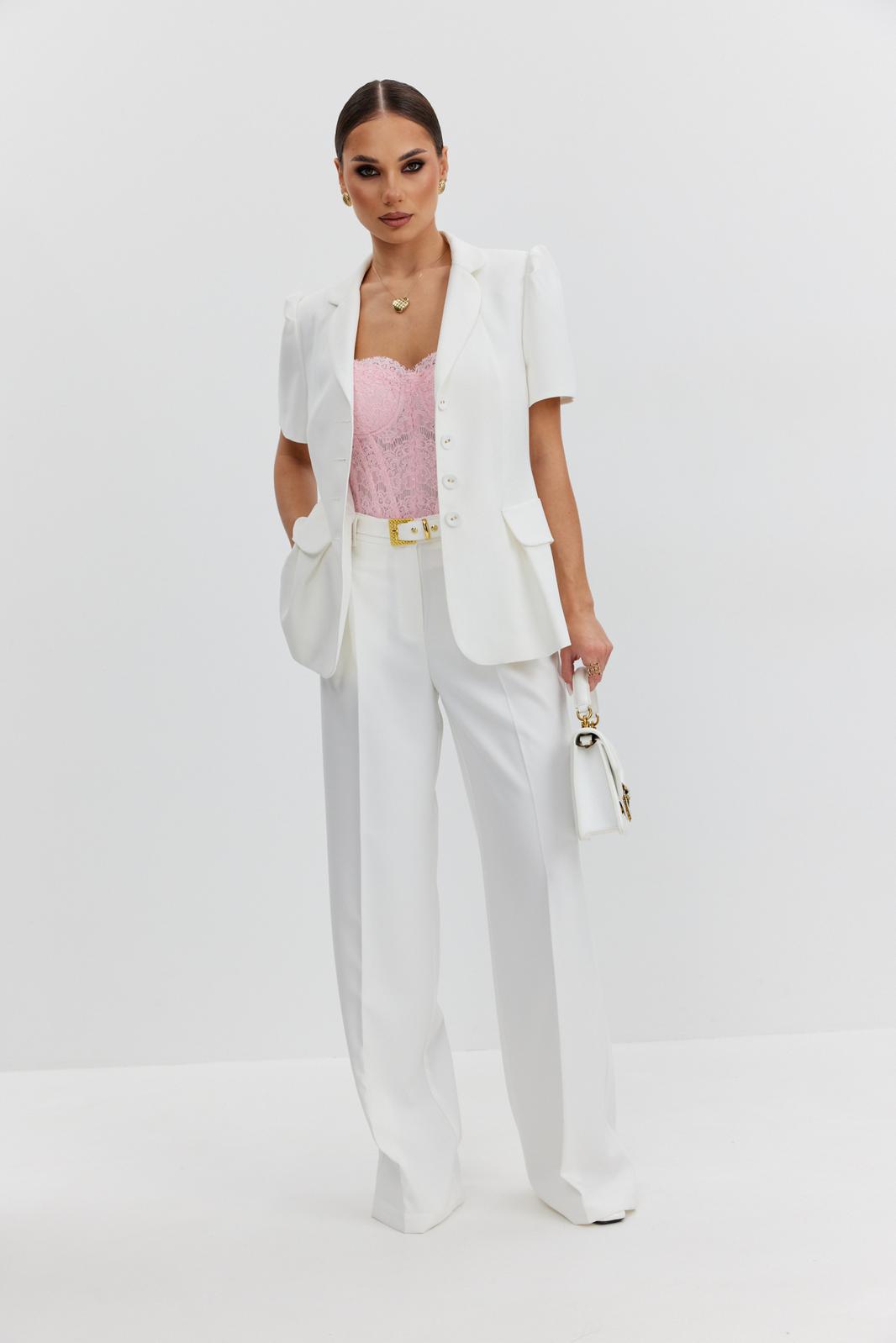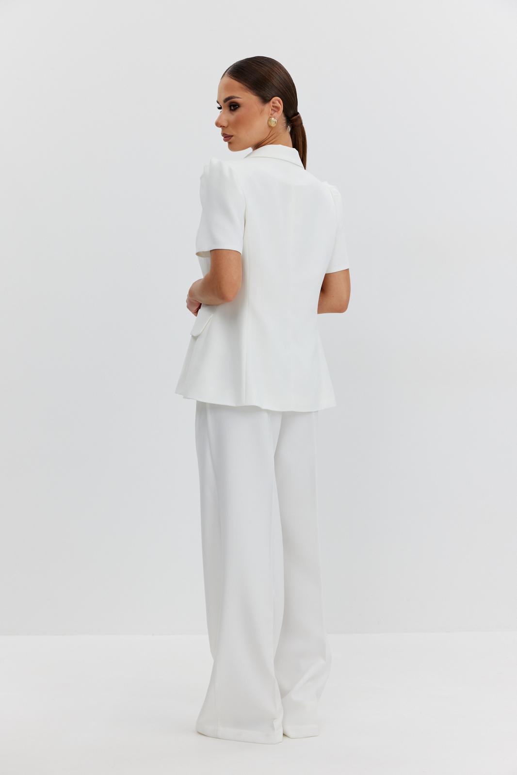 Жакет из костюмно-плательной ткани полуприлегающего силуэта, с центральной застежкой на четыре петли и обтяжные пуговицы. Перед с отрезным бочком и клапаном, центральный рельеф переходит в складку. Спинка с отрезным бочком и средним швом. Рукав втачной короткий, по окату заложены складки. Воротник пиджачный. В модели съемный пояс с декоративной пряжкой. Жакет на подкладке с плечевыми накладками.