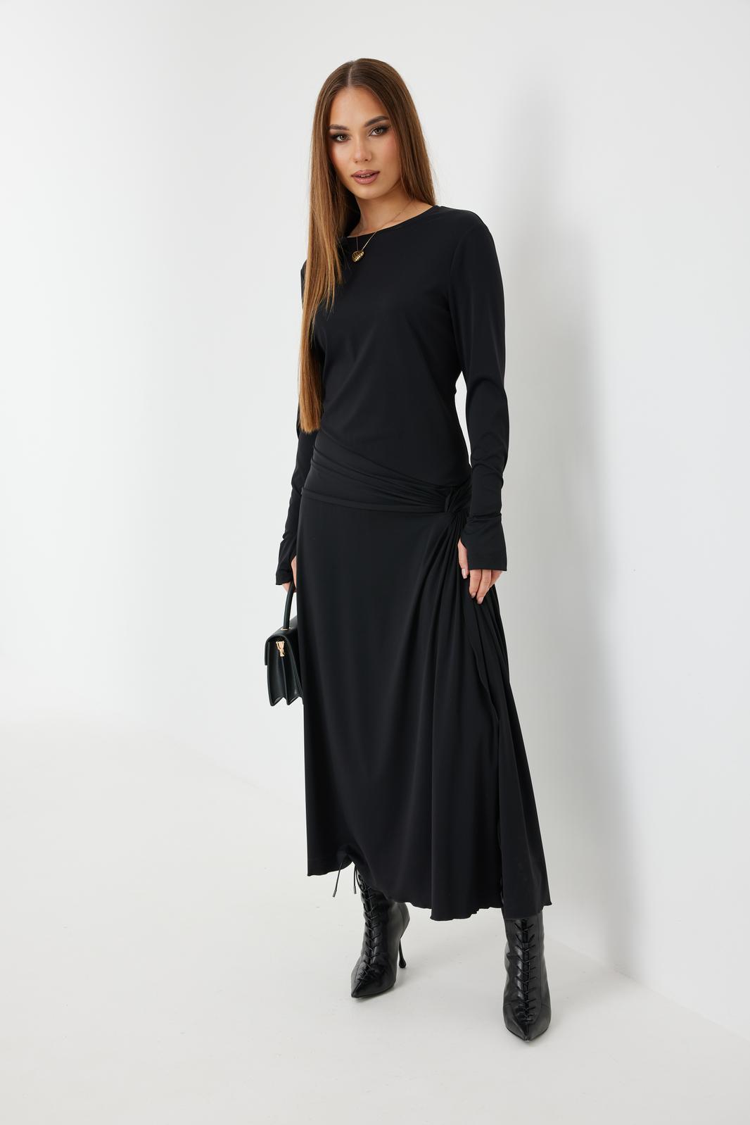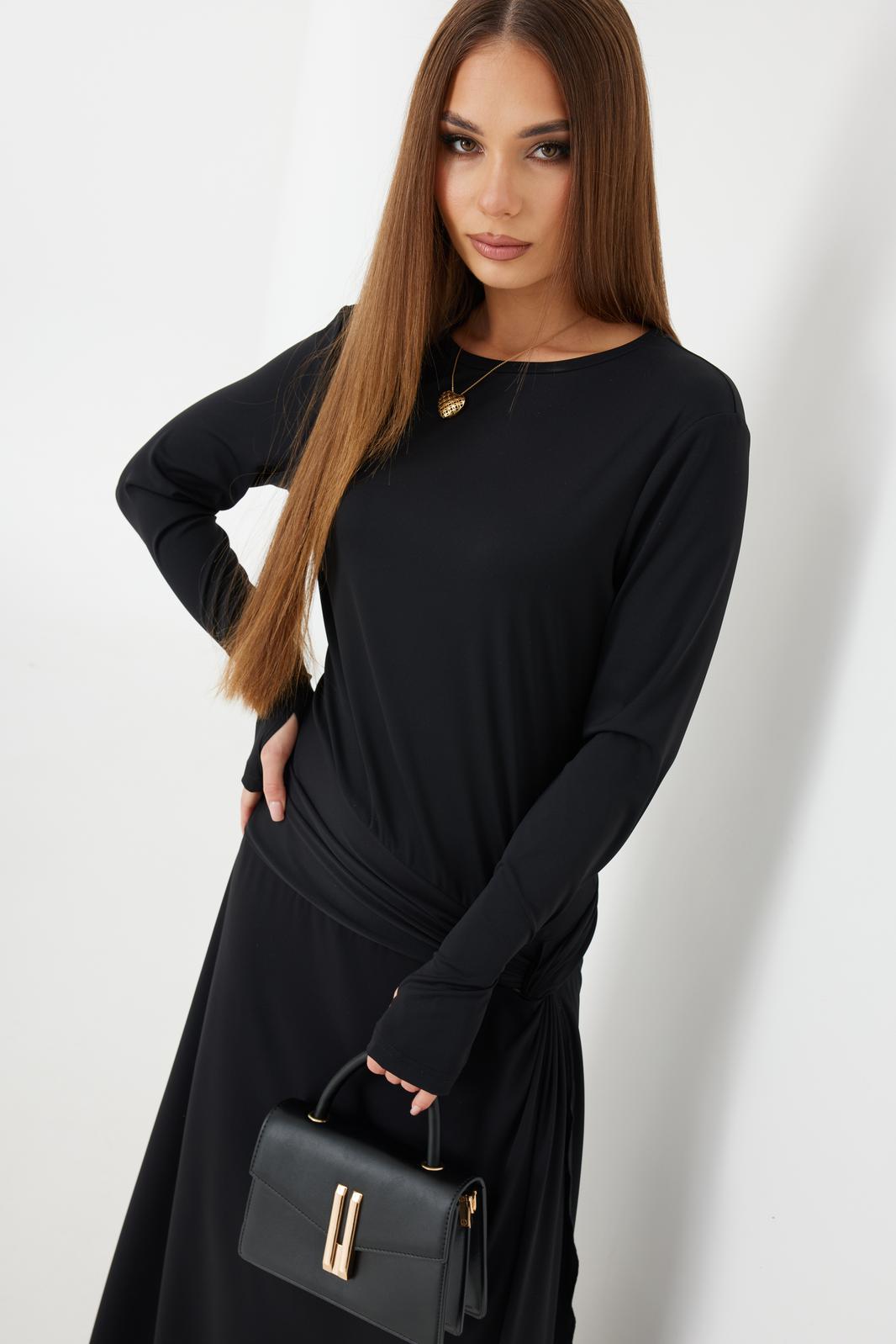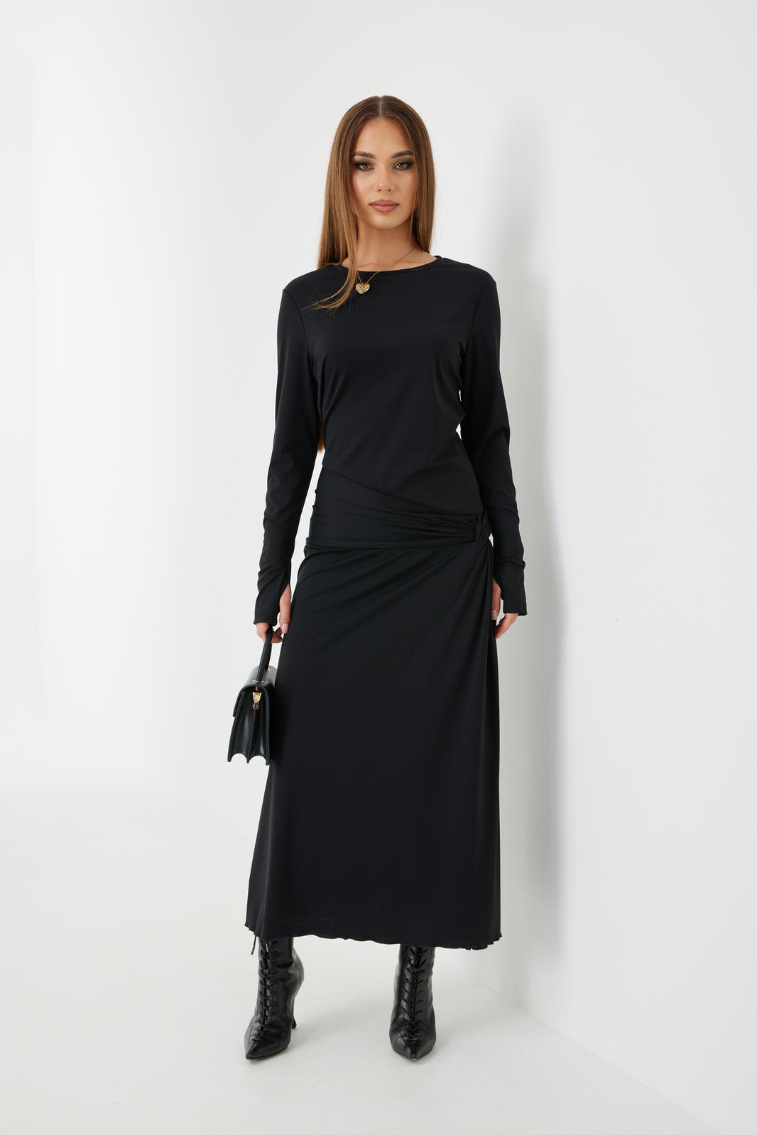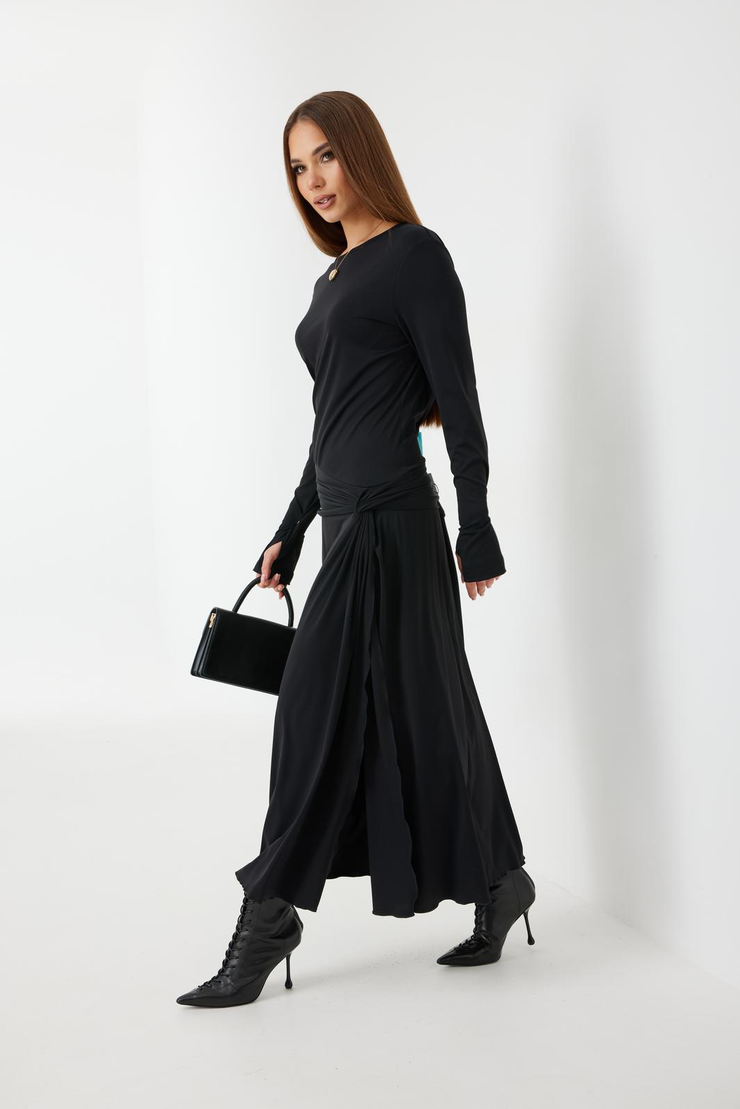 Платье трикотажное полуприлегающего силуэта, длины «макси» расширенное к низу. Втачной удлиненный рукав, зауженный к низу, с прорезью для пальца. По линии бедер вставлена драпировка с перекрутом, который переходит в разрез.