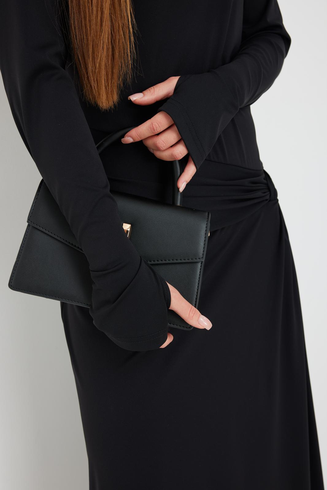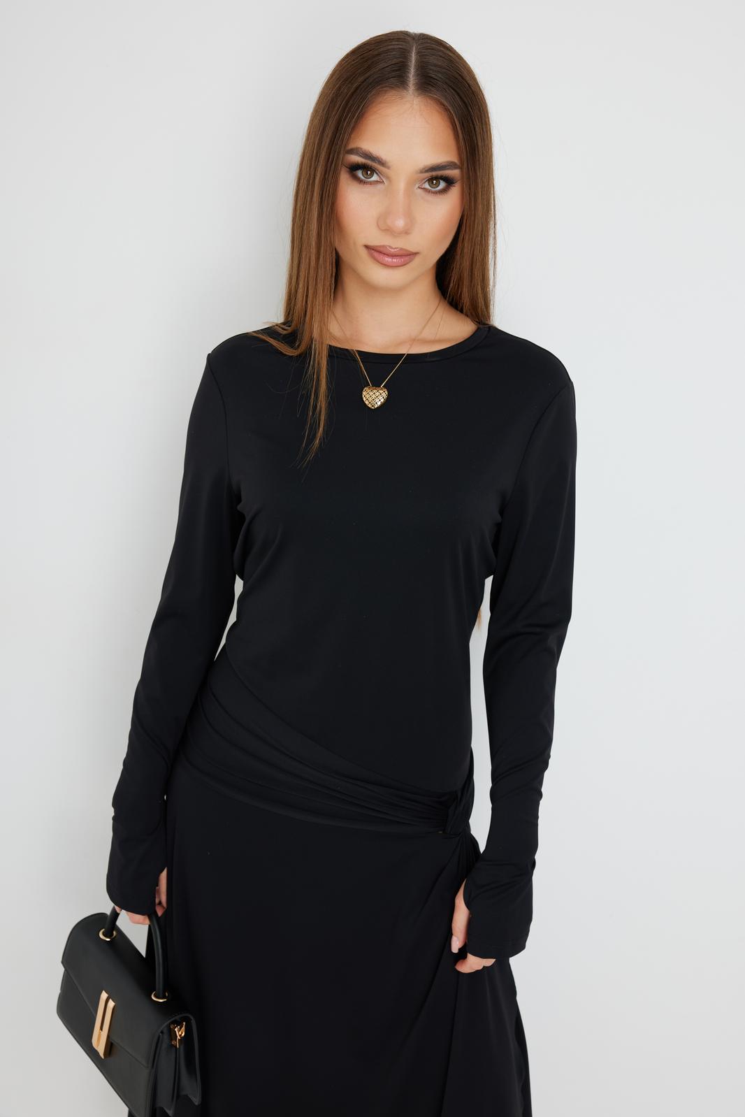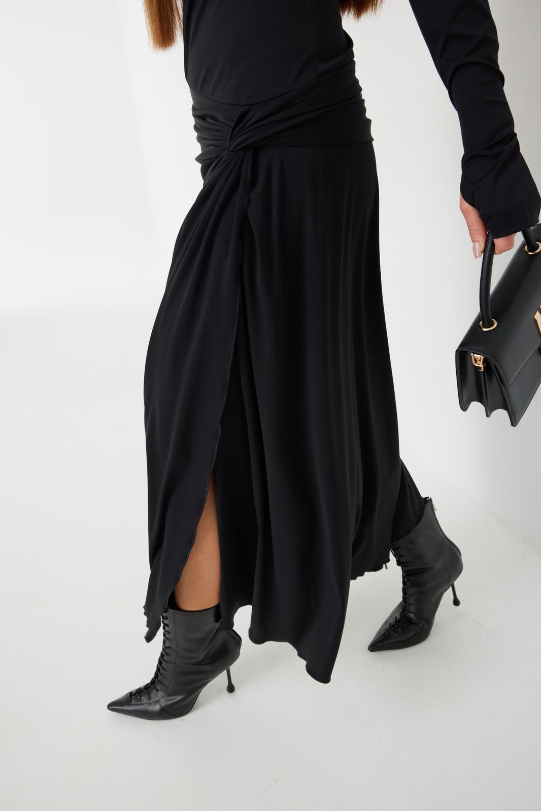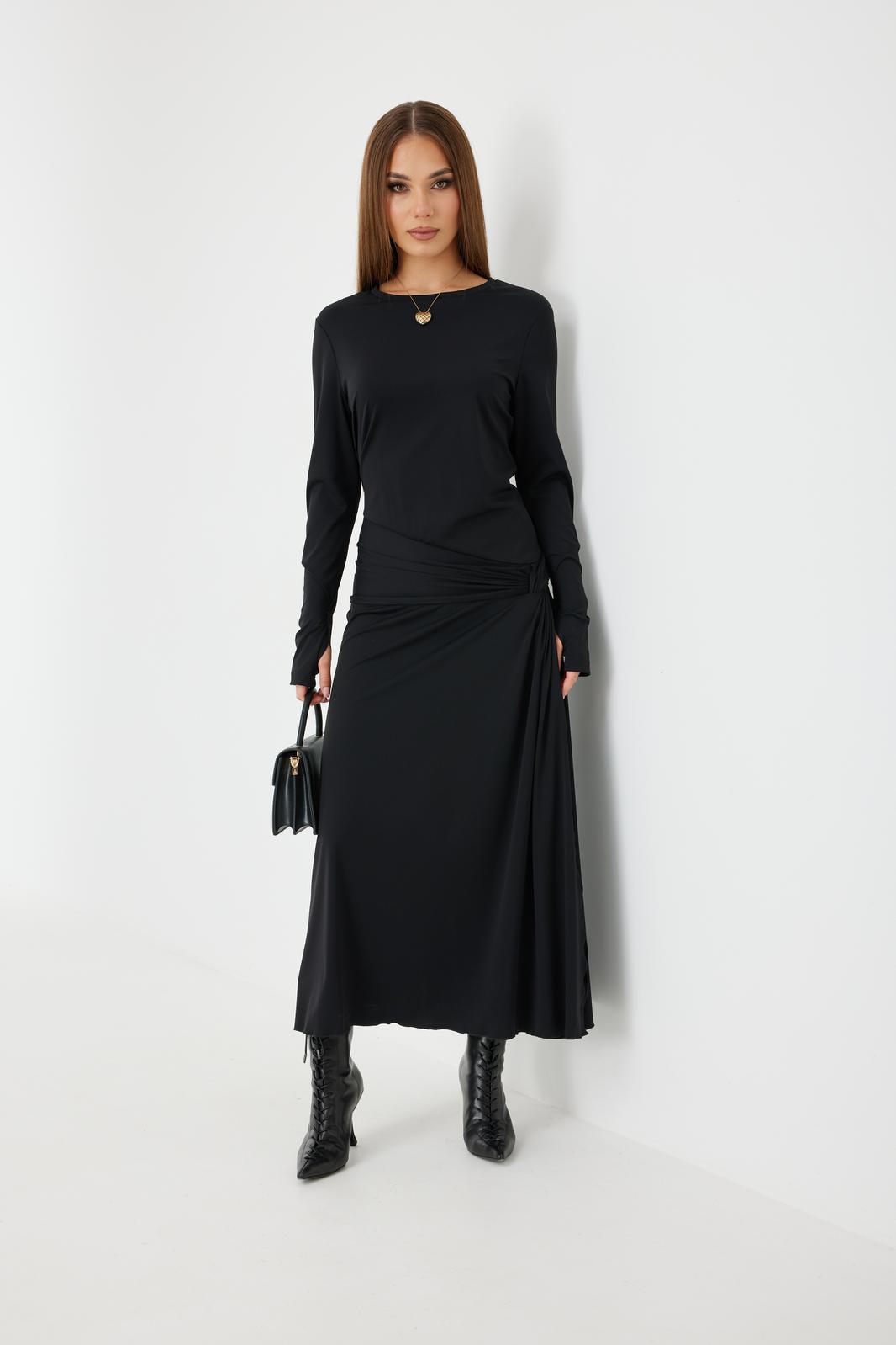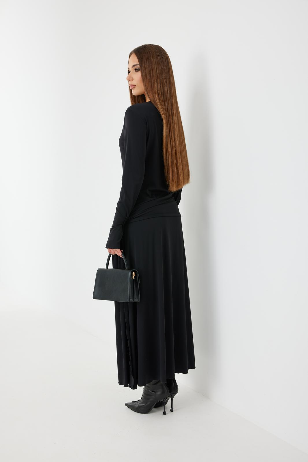 Платье трикотажное полуприлегающего силуэта, длины «макси» расширенное к низу. Втачной удлиненный рукав, зауженный к низу, с прорезью для пальца. По линии бедер вставлена драпировка с перекрутом, который переходит в разрез.