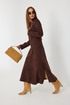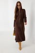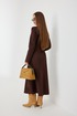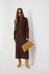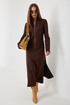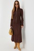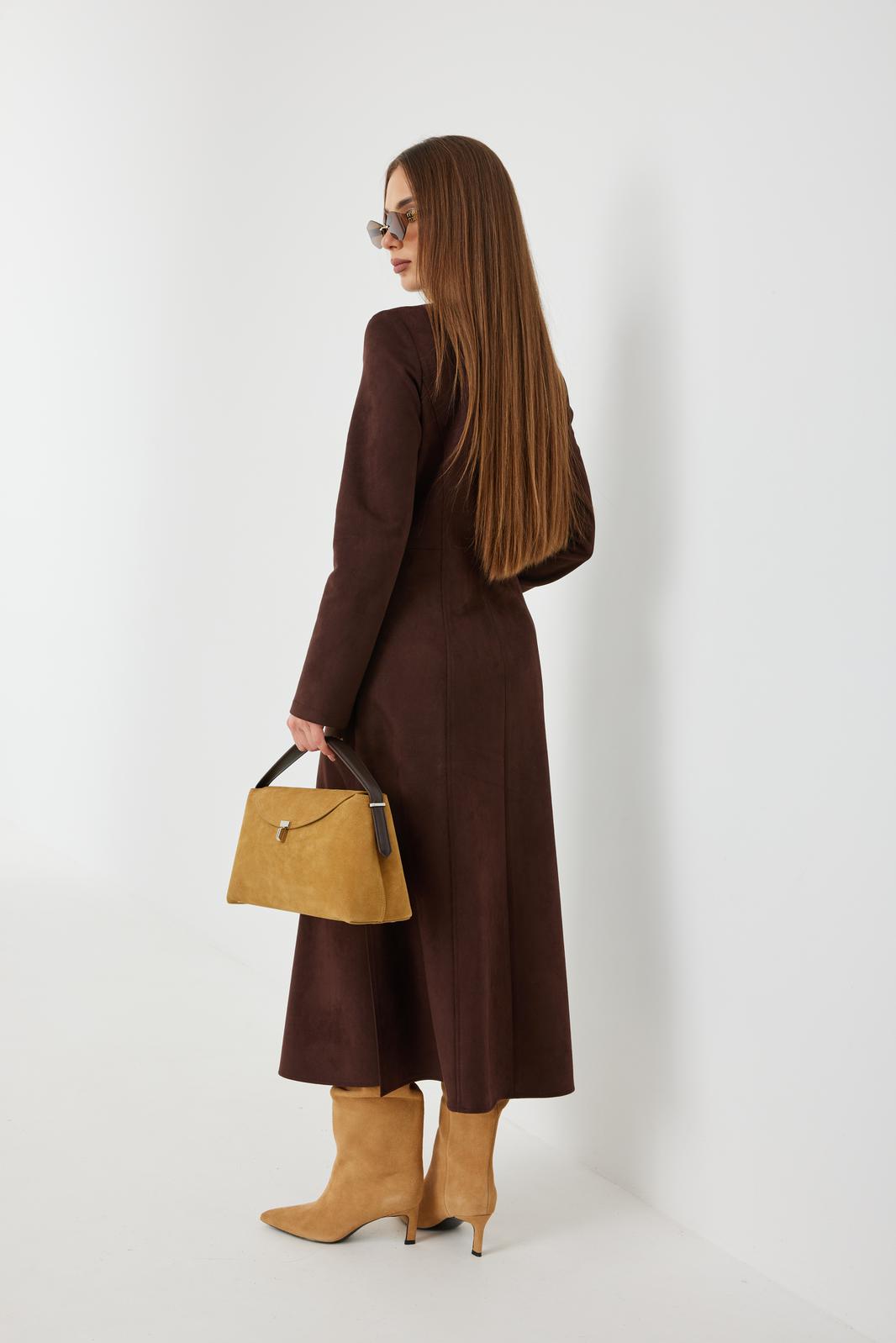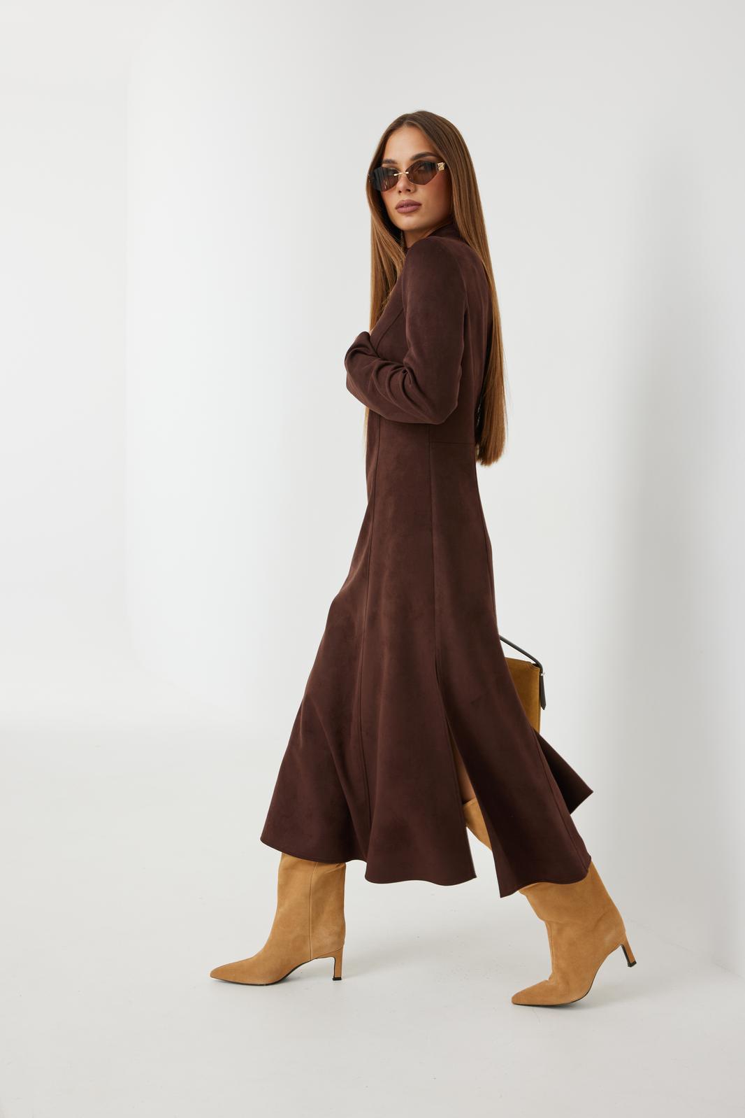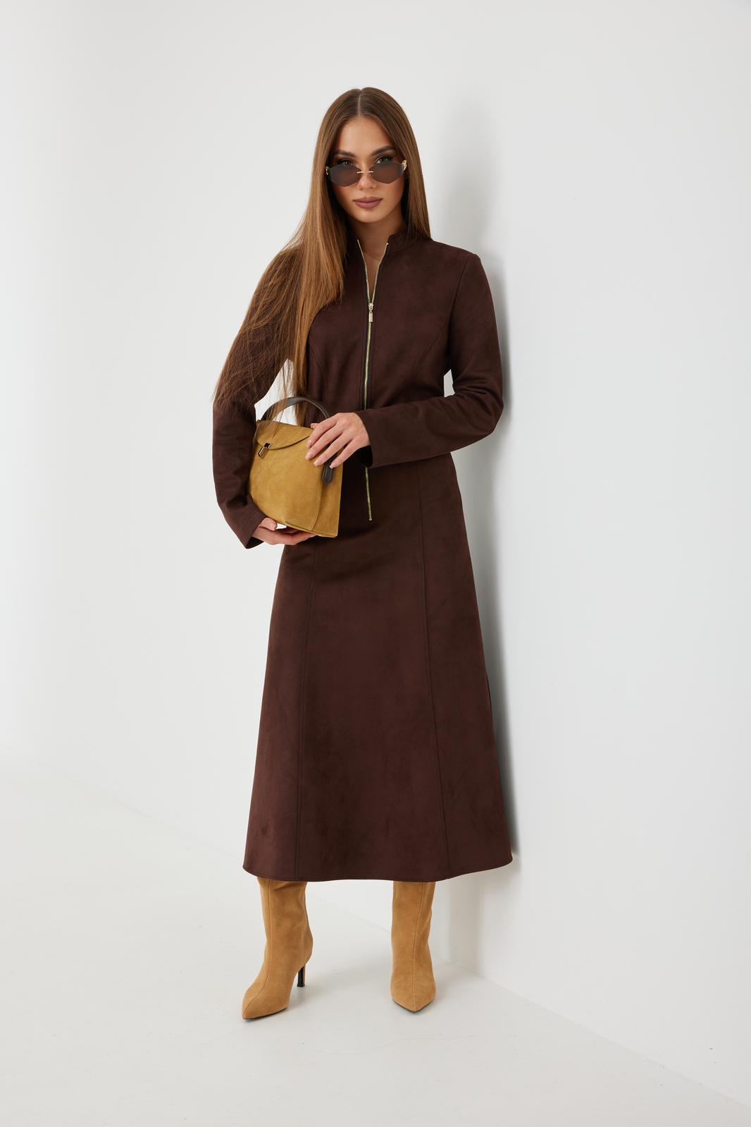 Платье женское полуприлегающего силуэта, из ткани под замшу, длиной миди, с высокими разрезами по бокам. По переду и спинке вертикальные рельефные швы. Застежка спереди на декоративную молнию длиной ниже уровня талии. Воротник – невысокая стойка прилегающая к шее. Рукав втачной, немного расширенный книзу.