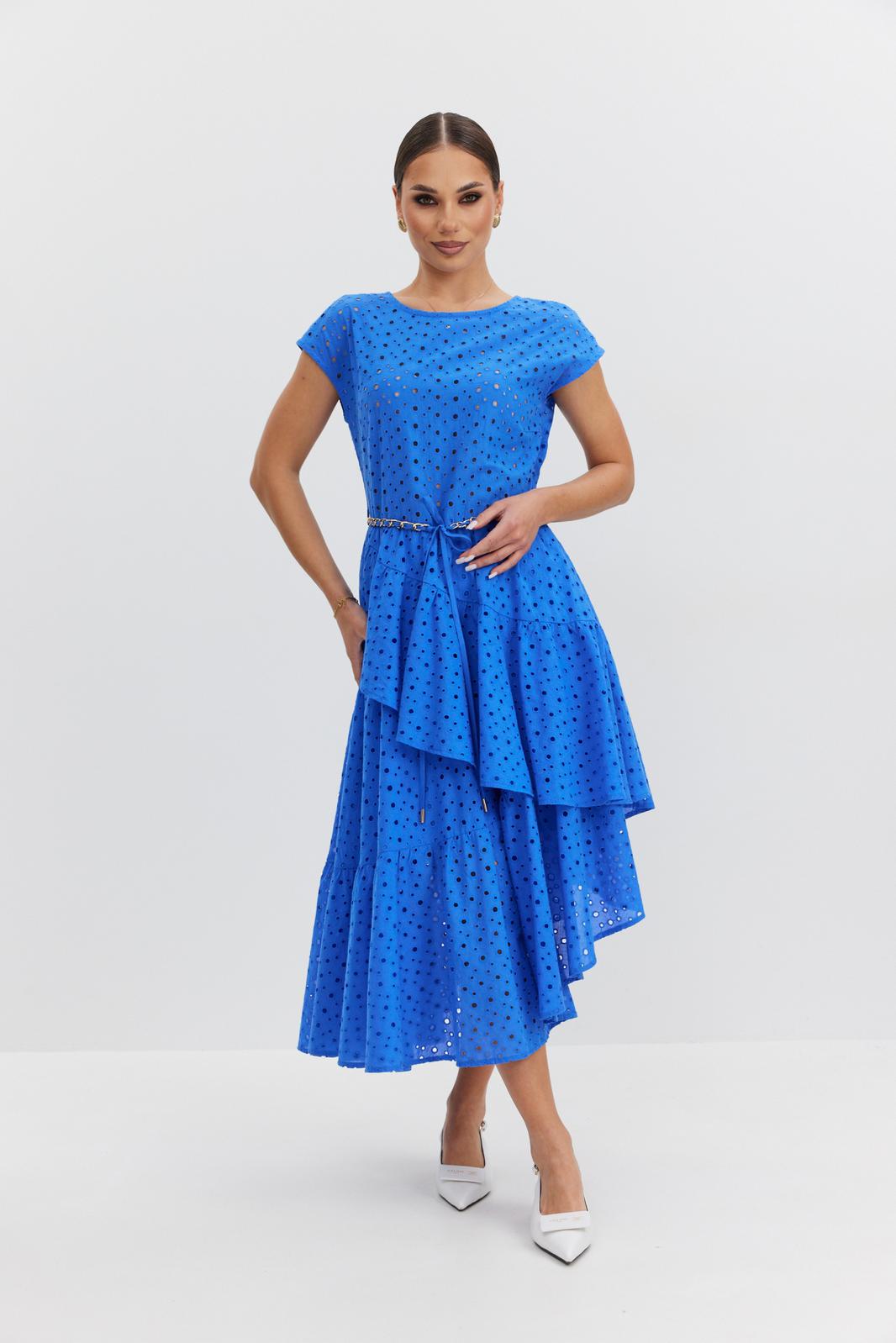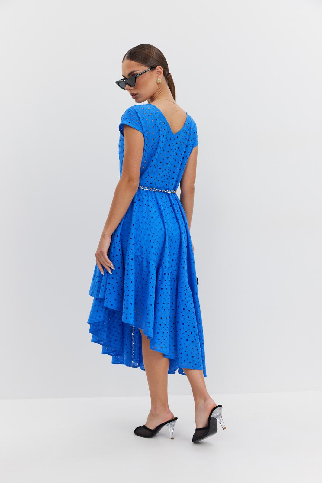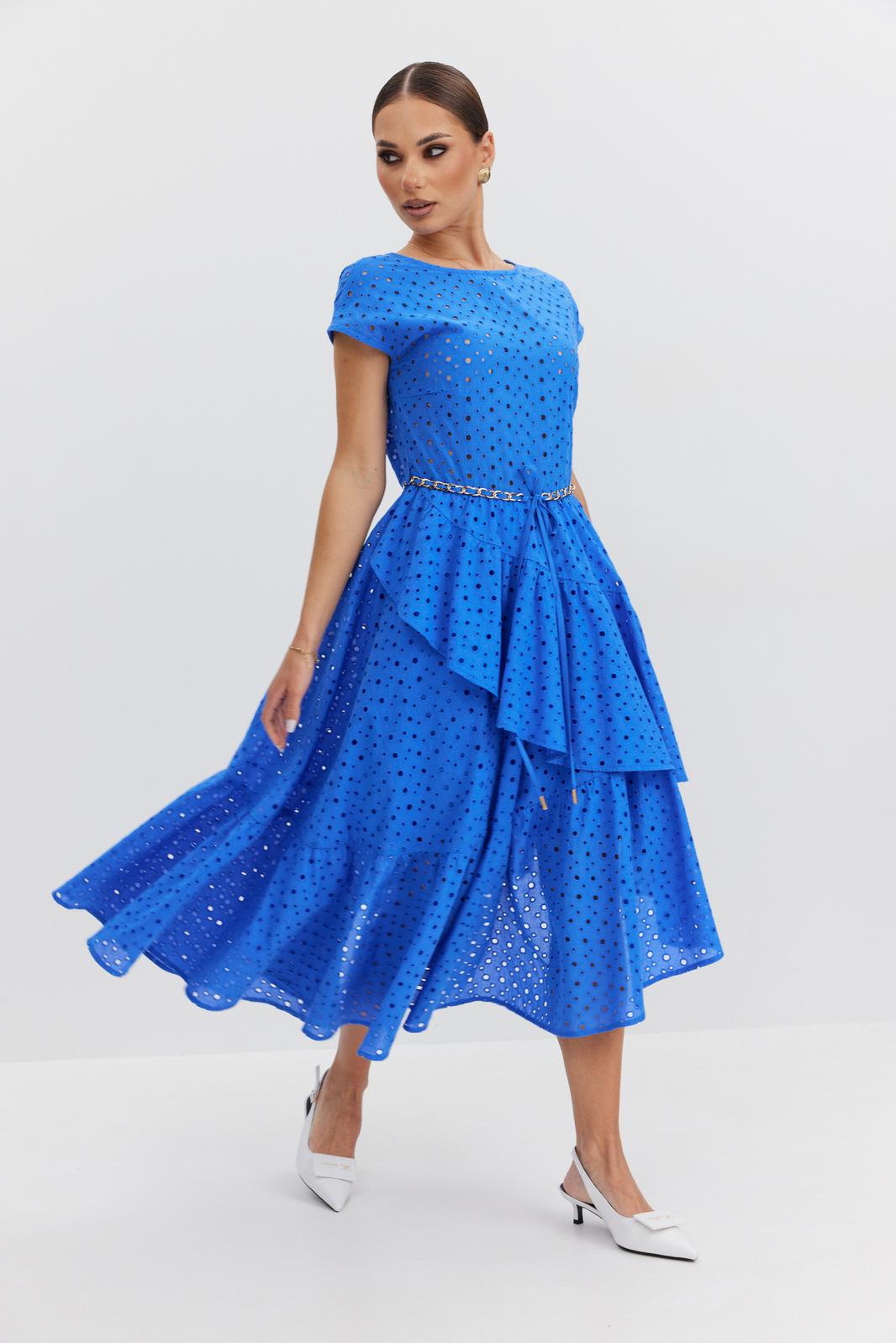 Платье женское полуприлегающего силуэта, отрезное по линии талии, юбка на подкладке. Лиф платья без подкладки, по переду вырез горловины округлой формы, по спинке – V-образной, линия плеча спущена. Юбка платья сложного асимметричного кроя с запахом, с воланами и небольшой сборкой по талии. Застежка на потайную молнию в боковом шве. По талии шлевки, в которые протянута декоративная цепочка-пояс.