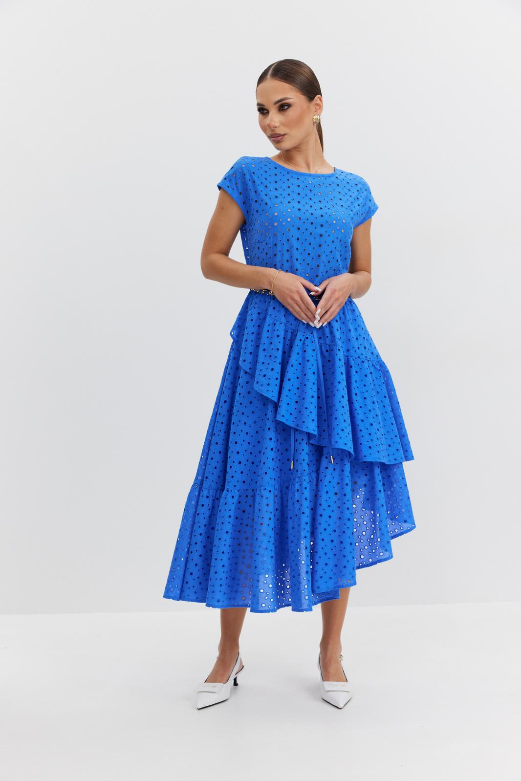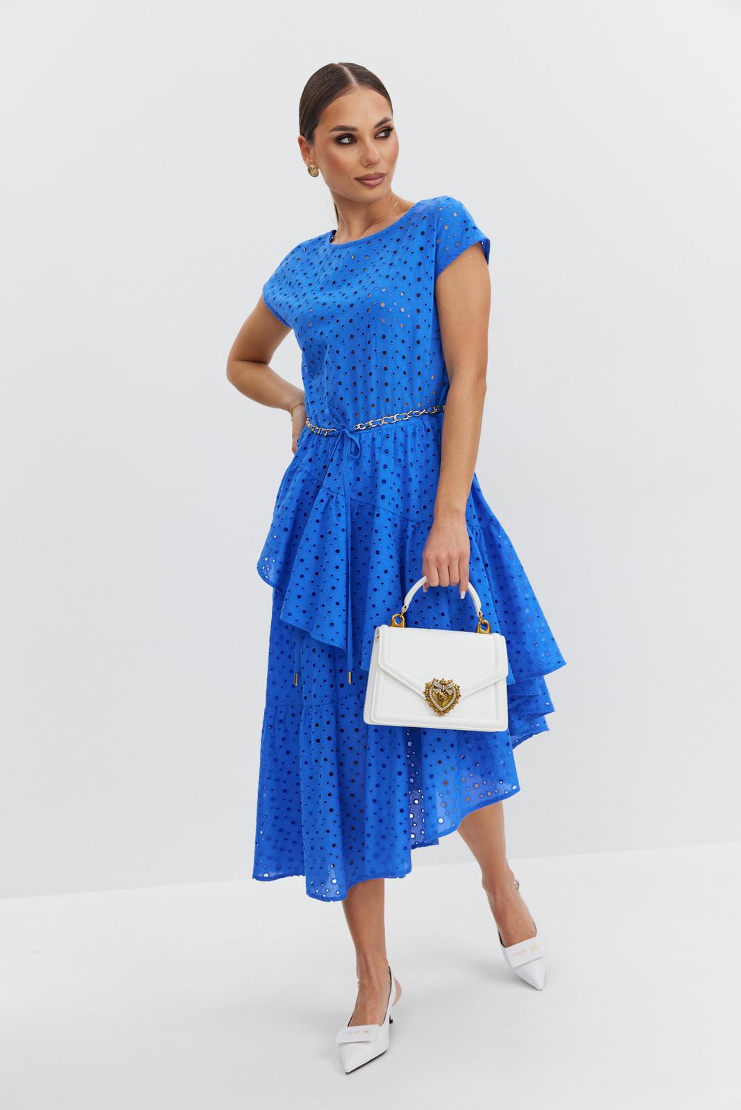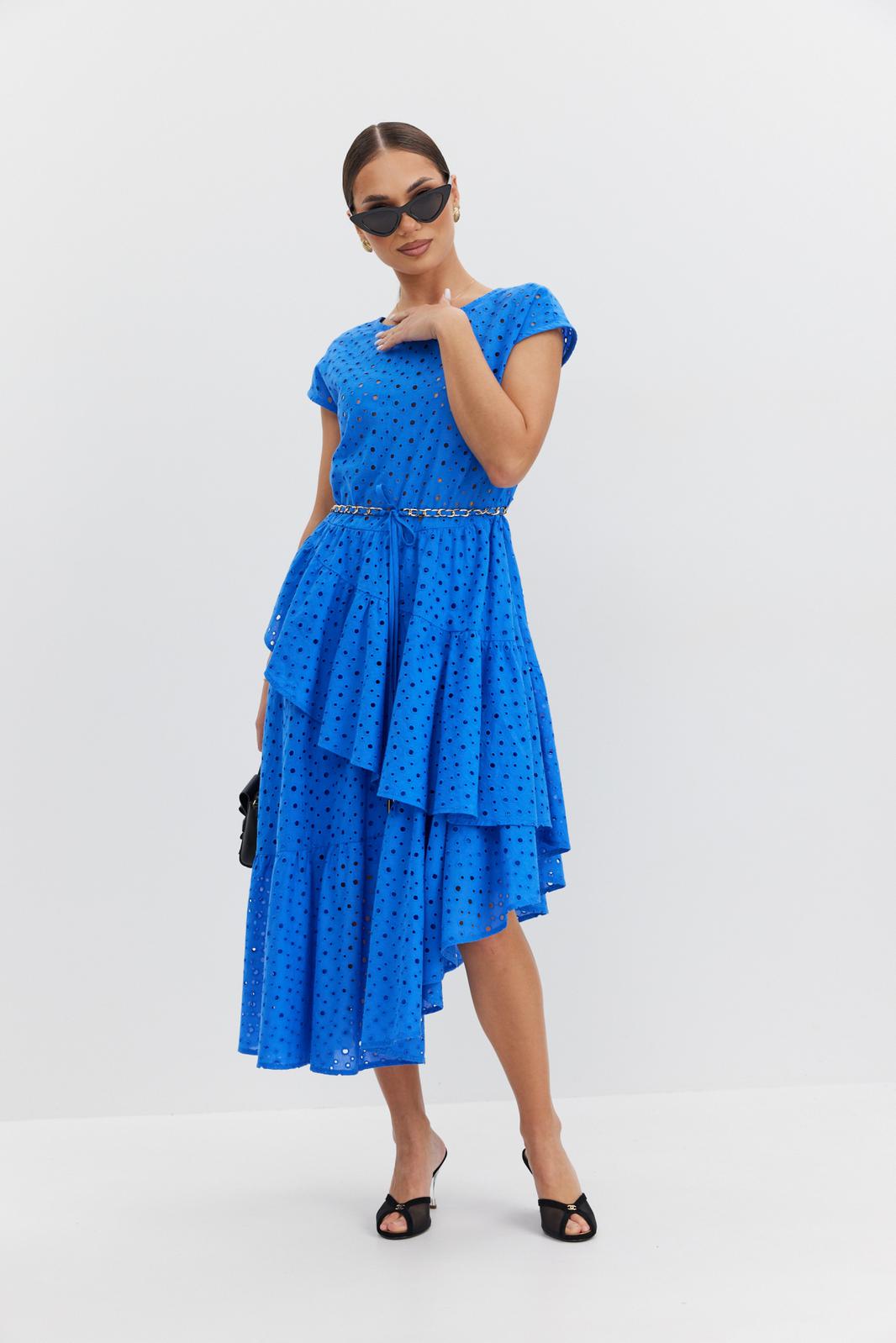 Платье женское полуприлегающего силуэта, отрезное по линии талии, юбка на подкладке. Лиф платья без подкладки, по переду вырез горловины округлой формы, по спинке – V-образной, линия плеча спущена. Юбка платья сложного асимметричного кроя с запахом, с воланами и небольшой сборкой по талии. Застежка на потайную молнию в боковом шве. По талии шлевки, в которые протянута декоративная цепочка-пояс.