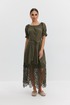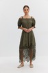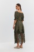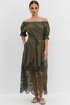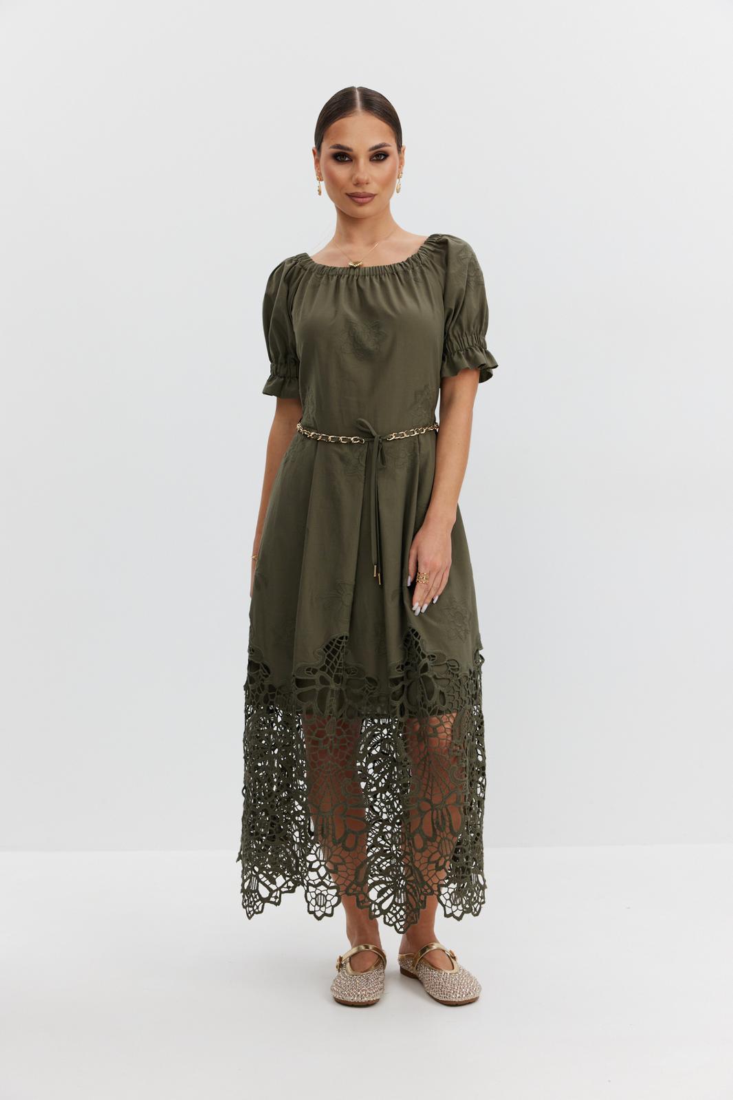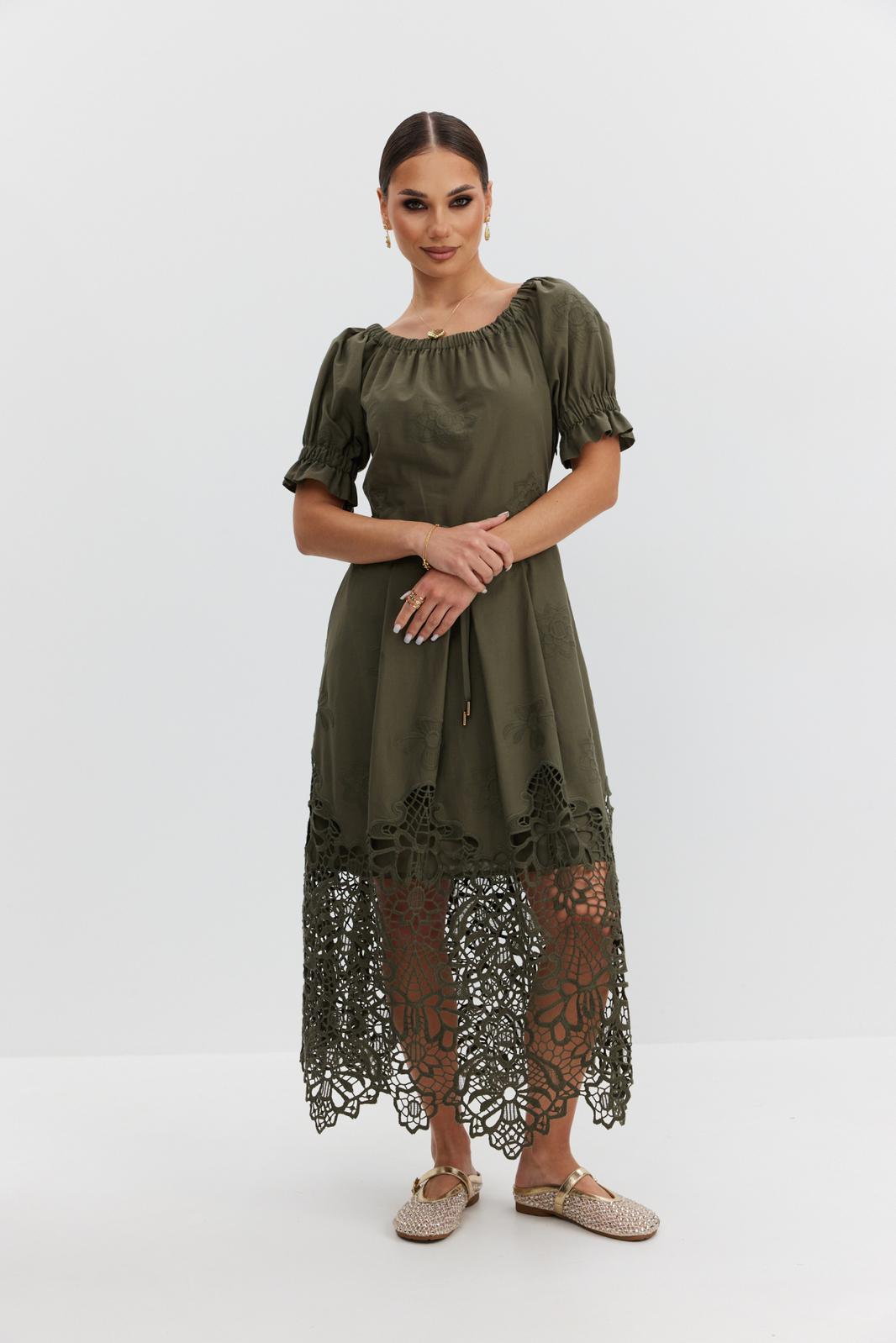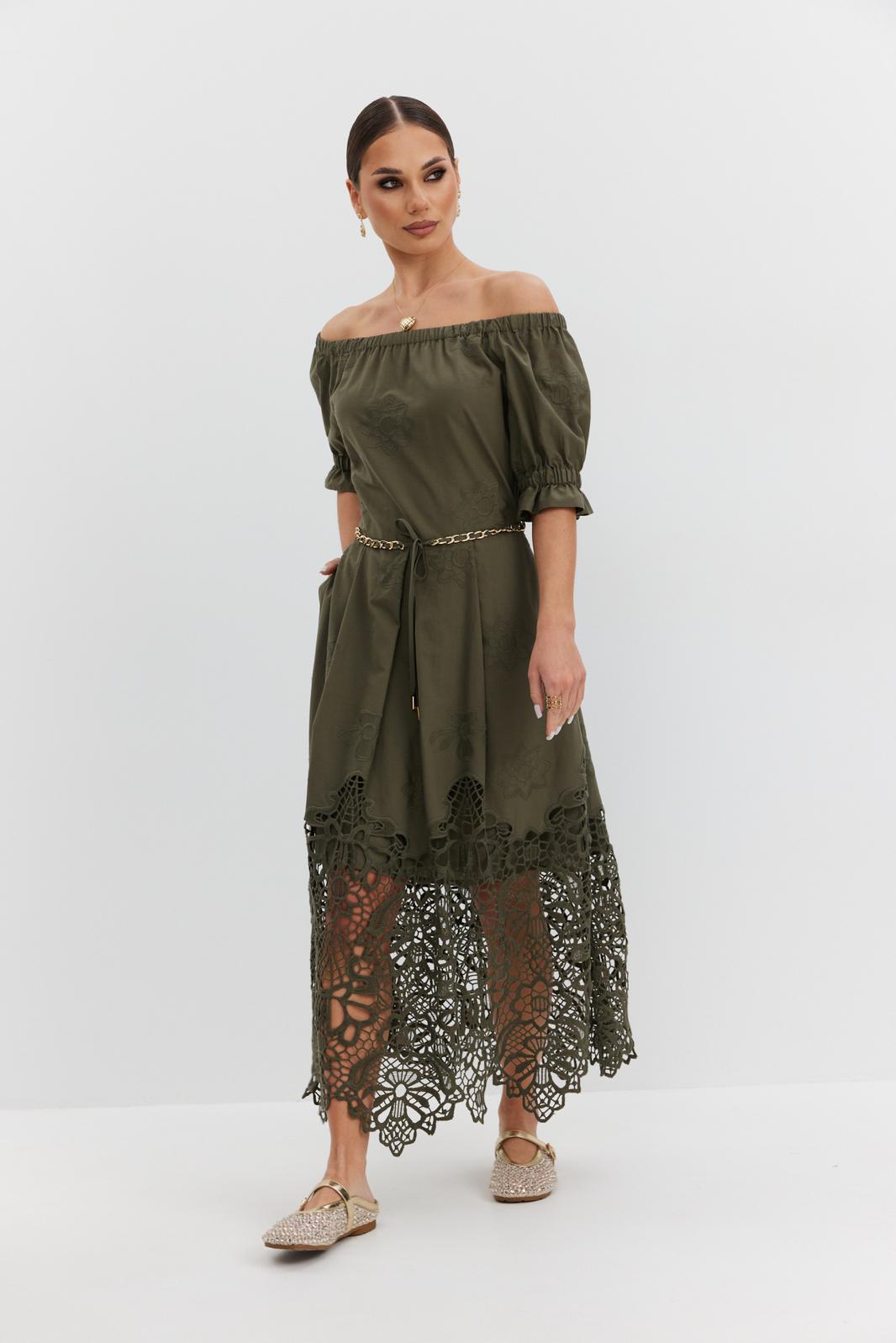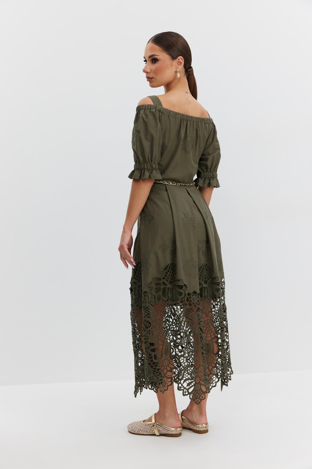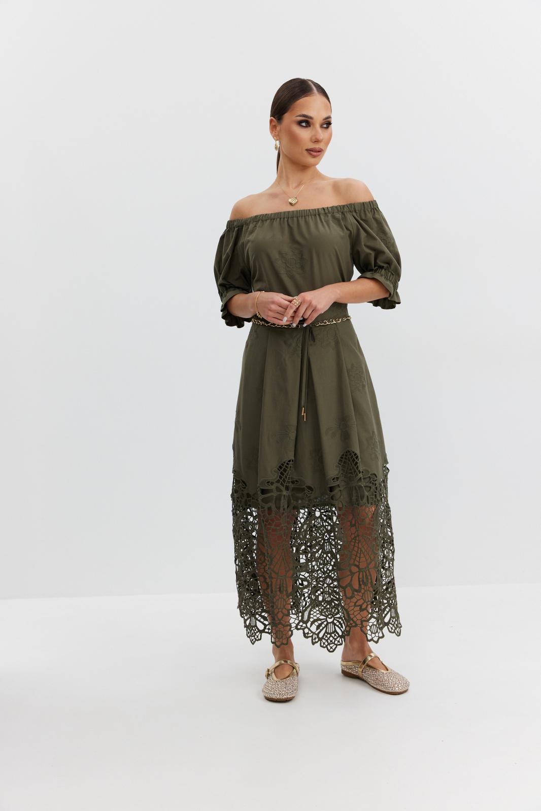 Платье из хлопковой ткани «ришелье». Длина макси. Платье отрезное по талии, юбка со складками. Верх с открытыми плечами и съемными бретелями. Застежка в боковом шве на потайную молнию. Рукав «фонарик». В боковых швах карманы. В комплекте декоративный пояс-завязка. Платье на подкладке.