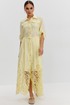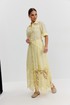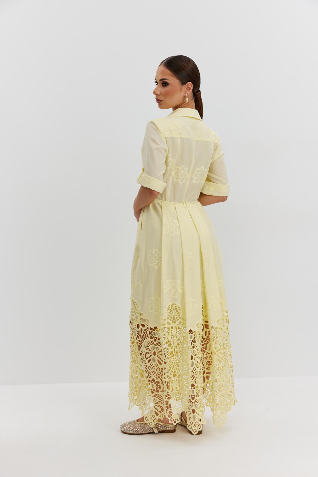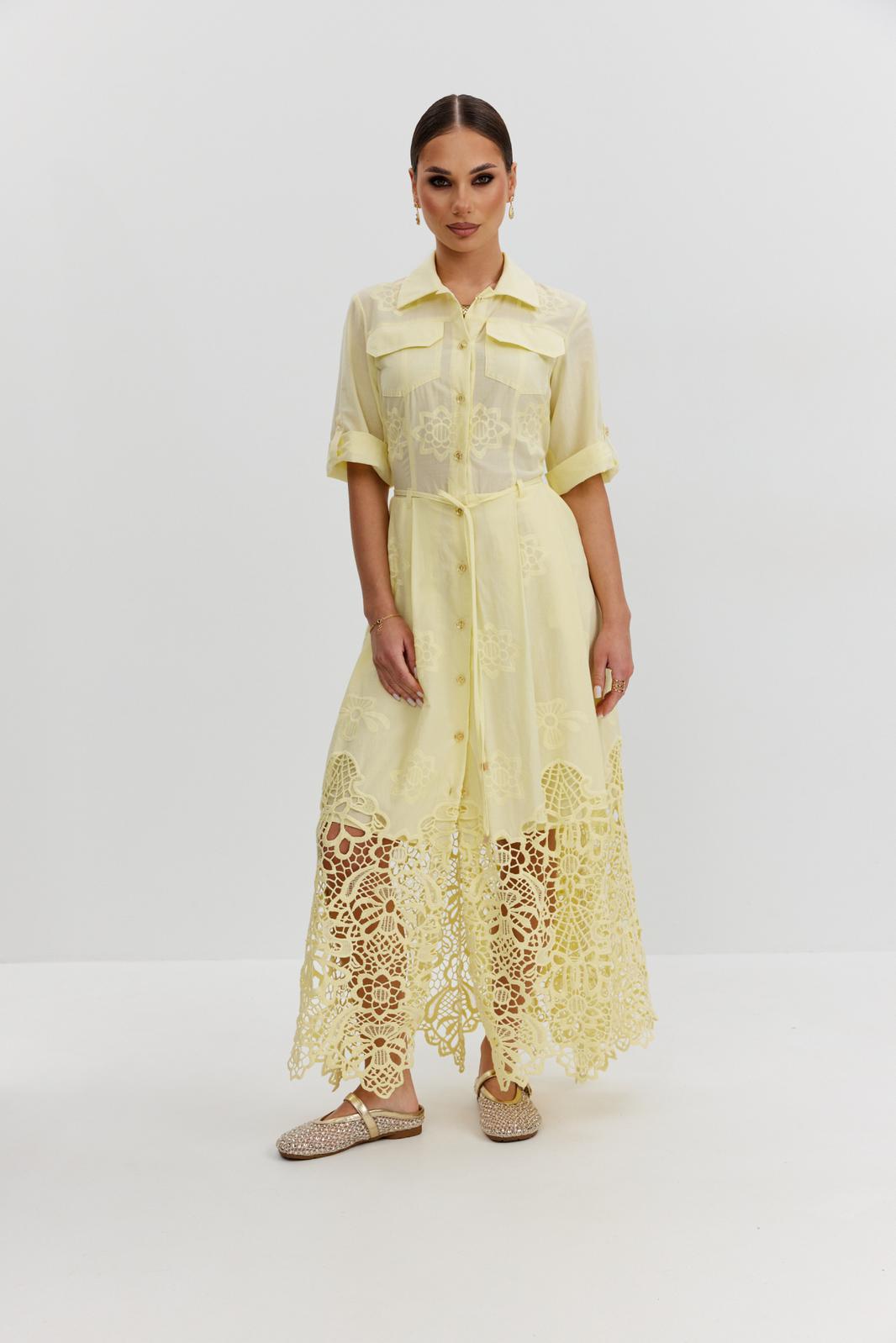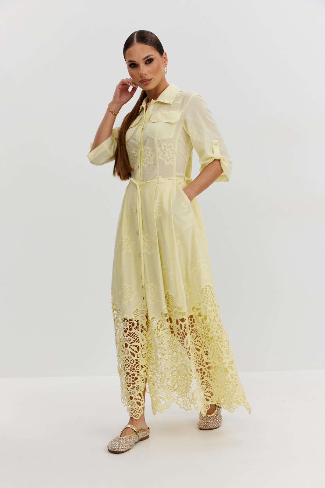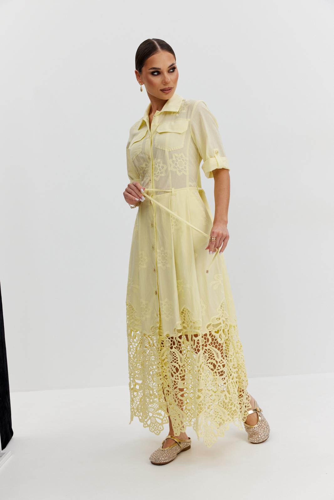Платье из ажурной хлопковой ткани. Длина макси. Застежка на петли и пуговицы. Платье отрезное по талии. Воротник рубашечный. По переду накладные карманы с клапаном. Рукав прямой ¾ с регулируемой патой. По юбке платья складки. В боковых швах карманы. В комплекте съемный пояс-завязка. Юбка платья на хлопковой подкладке.