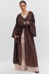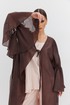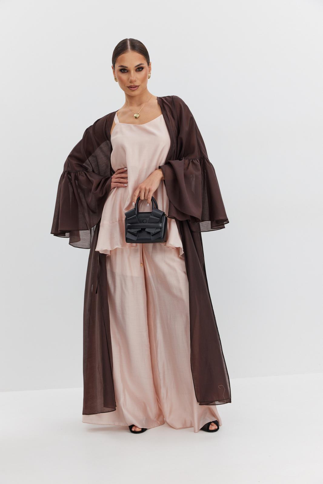 Туника женская объёмного силуэта, длиной миди, без застежки. Вырез горловины плавной формы, обработан окантовками, переходящими в завязки по переду. Рукав спущенный, с широким собранным воланом по низу. По боковым швам выполнены высокие разрезы.
