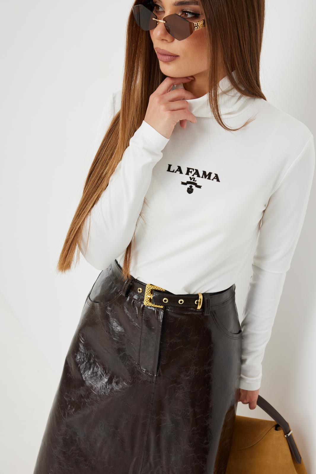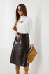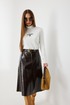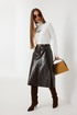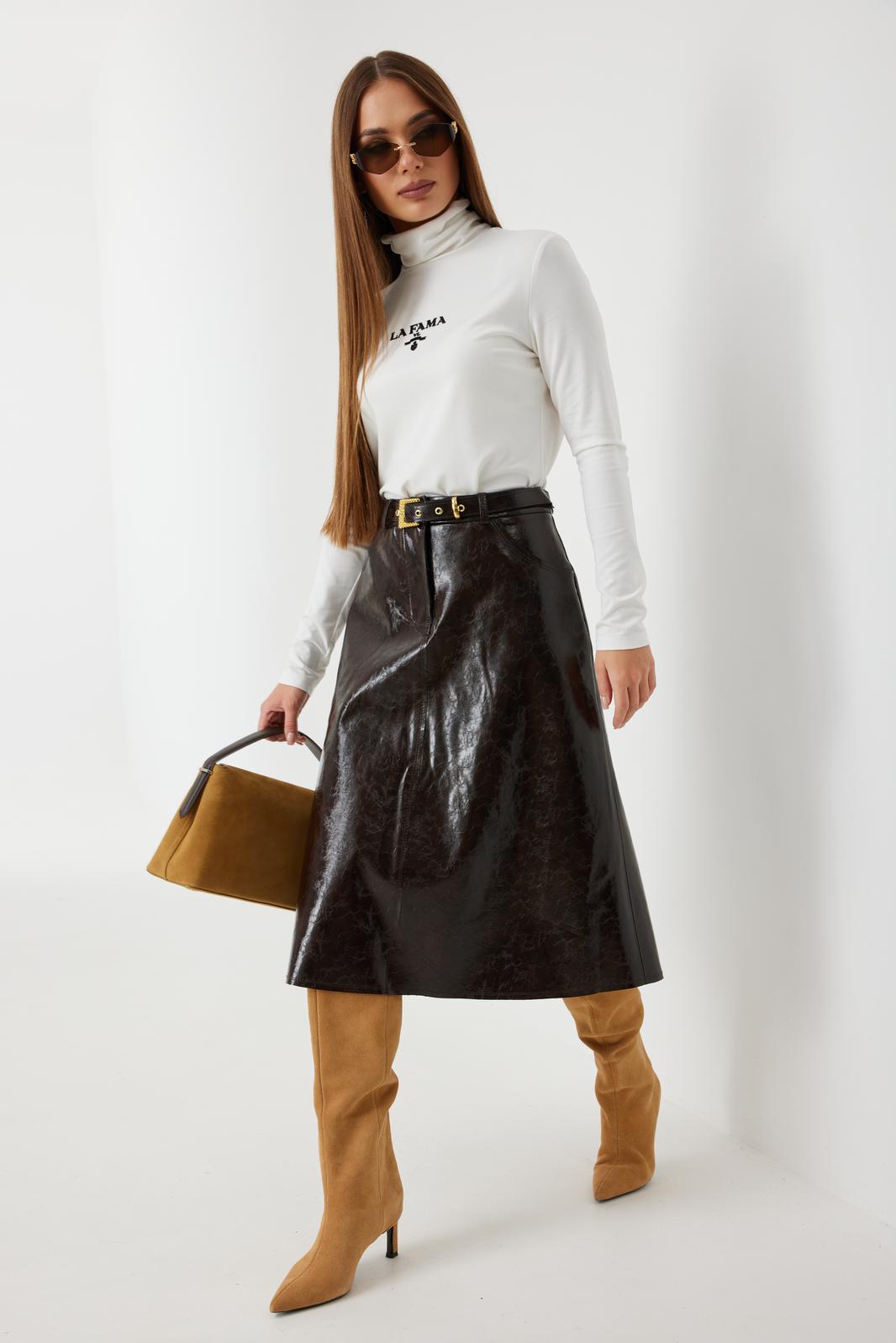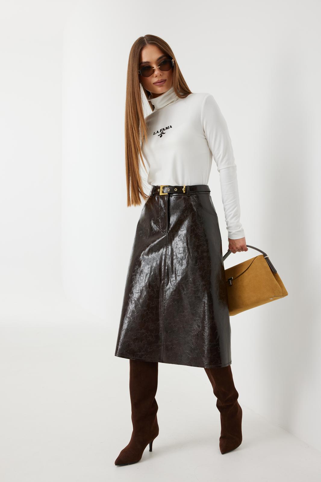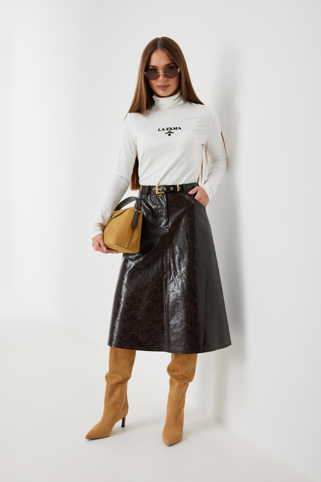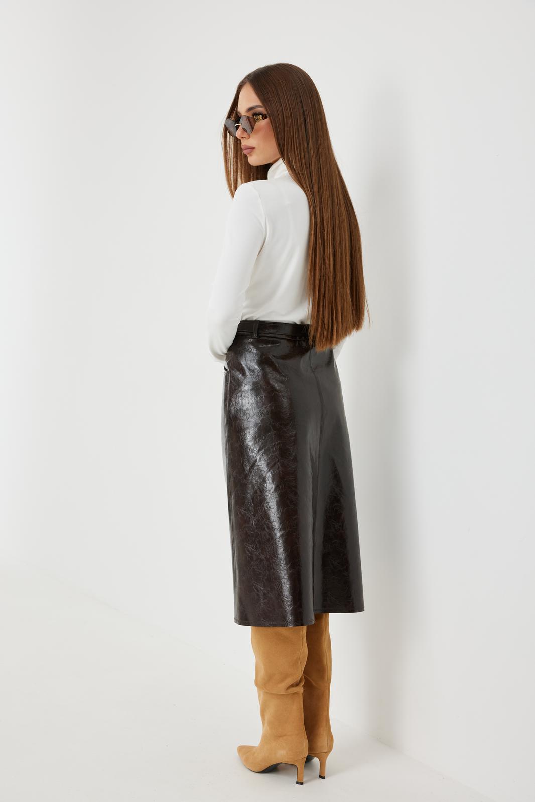 Юбка женская из трендовой фактурной экокожи на подкладке, длиной чуть ниже колена, пояс притачной, спереди застежка на молнию и кнопку и боковые карманы, в комплекте ремень из оригинальной ткани с декоративной пряжкой. Вертикальные швы, карманы и низ юбки обработаны «открытым» швом.