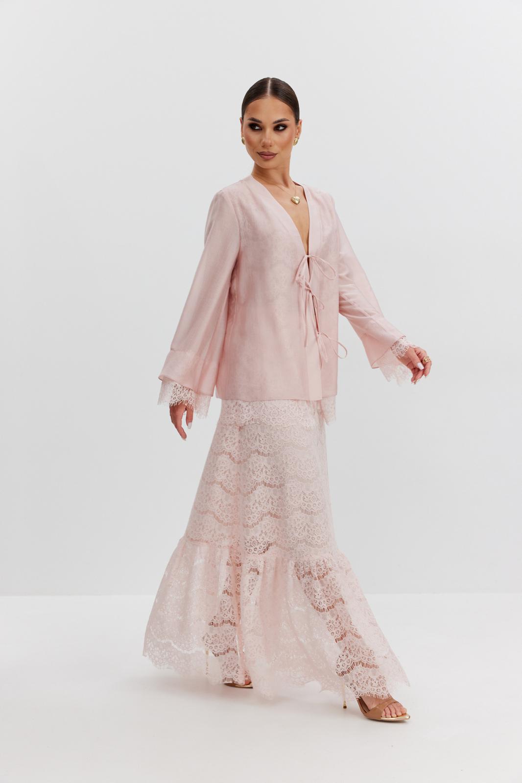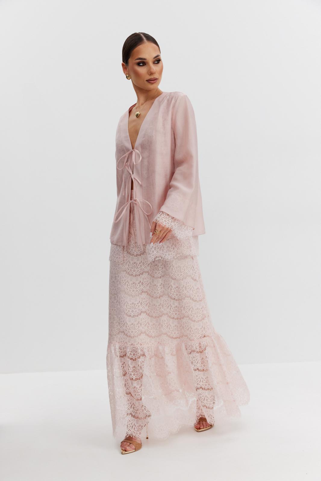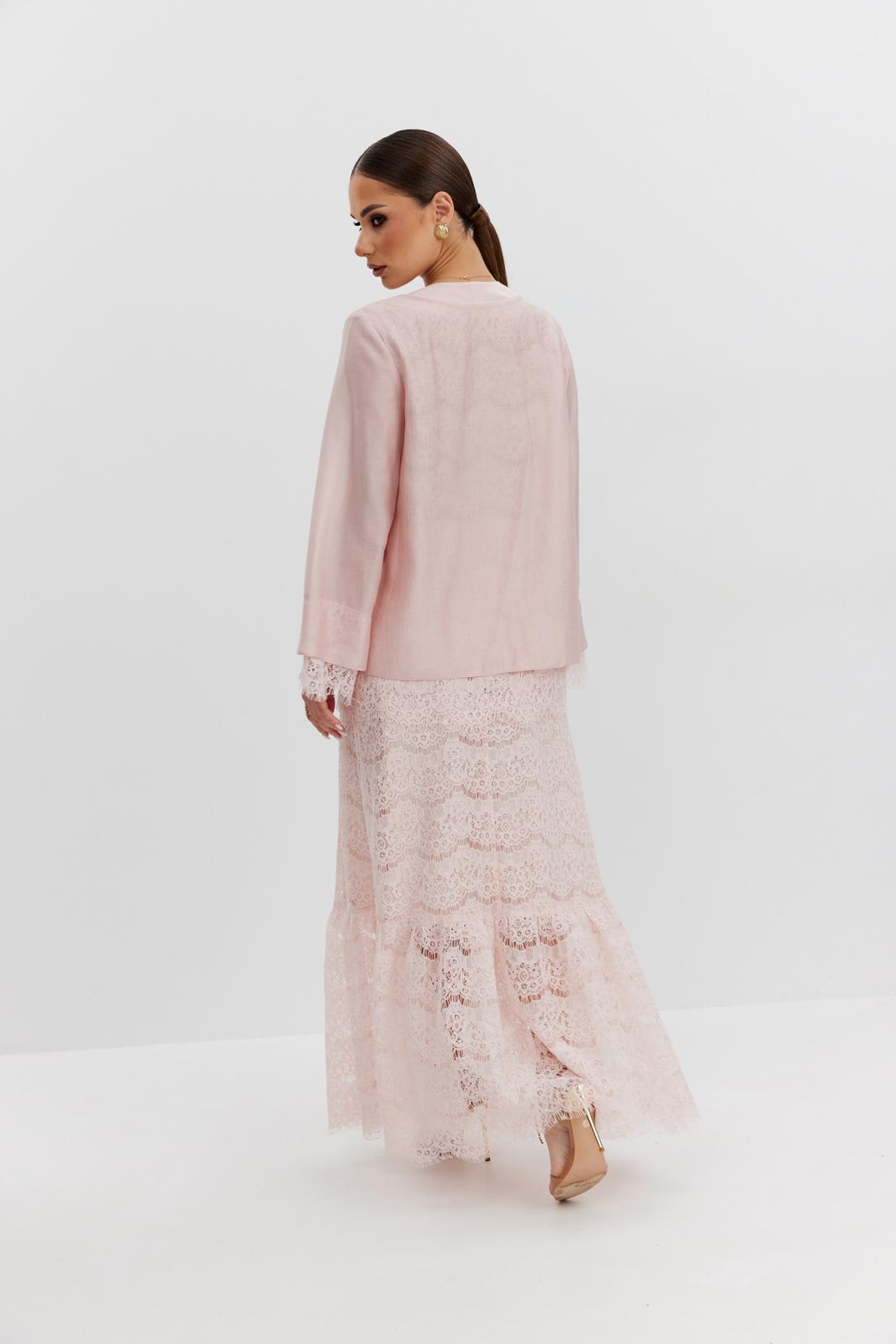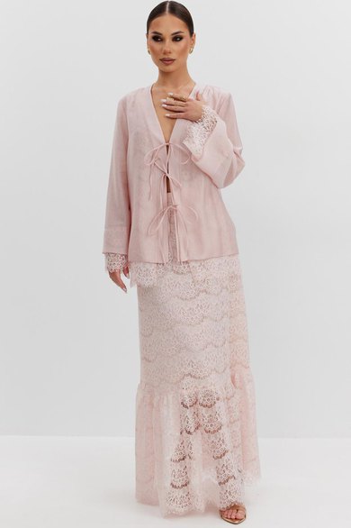 Юбка женская из кружевной ткани, имеет А-образный расширенный силуэт, с широким воланом со сборкой по низу, длина макси, юбка на подкладке. Верх юбки на поясе, со шлевками под ремень, застежка на потайную молнию по среднему шву сзади.