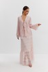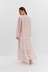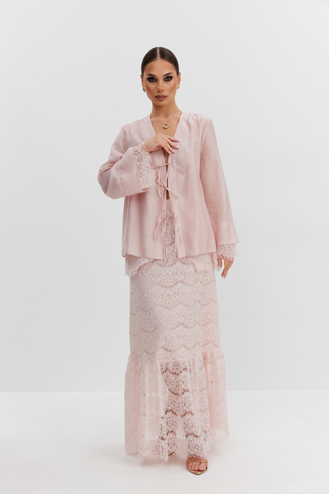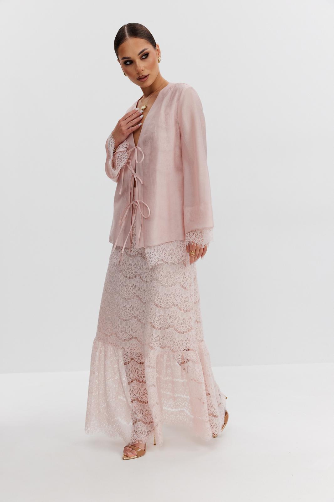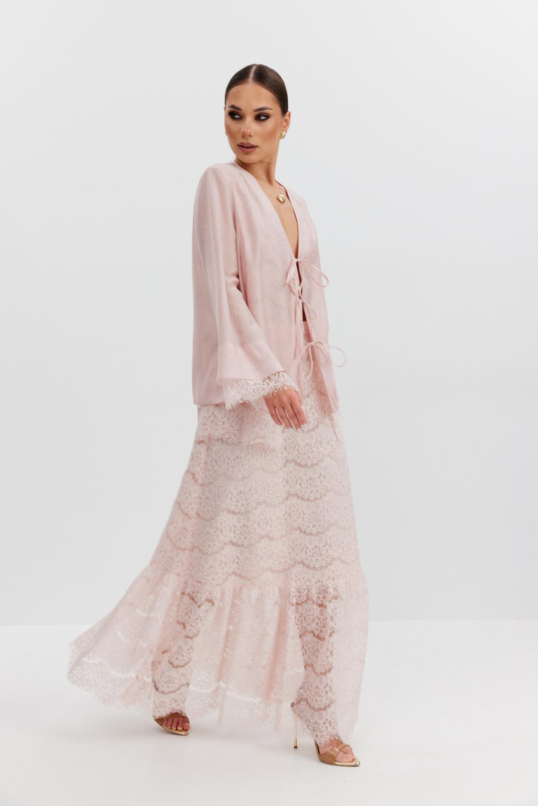 Юбка женская из кружевной ткани, имеет А-образный расширенный силуэт, с широким воланом со сборкой по низу, длина макси, юбка на подкладке. Верх юбки на поясе, со шлевками под ремень, застежка на потайную молнию по среднему шву сзади.