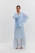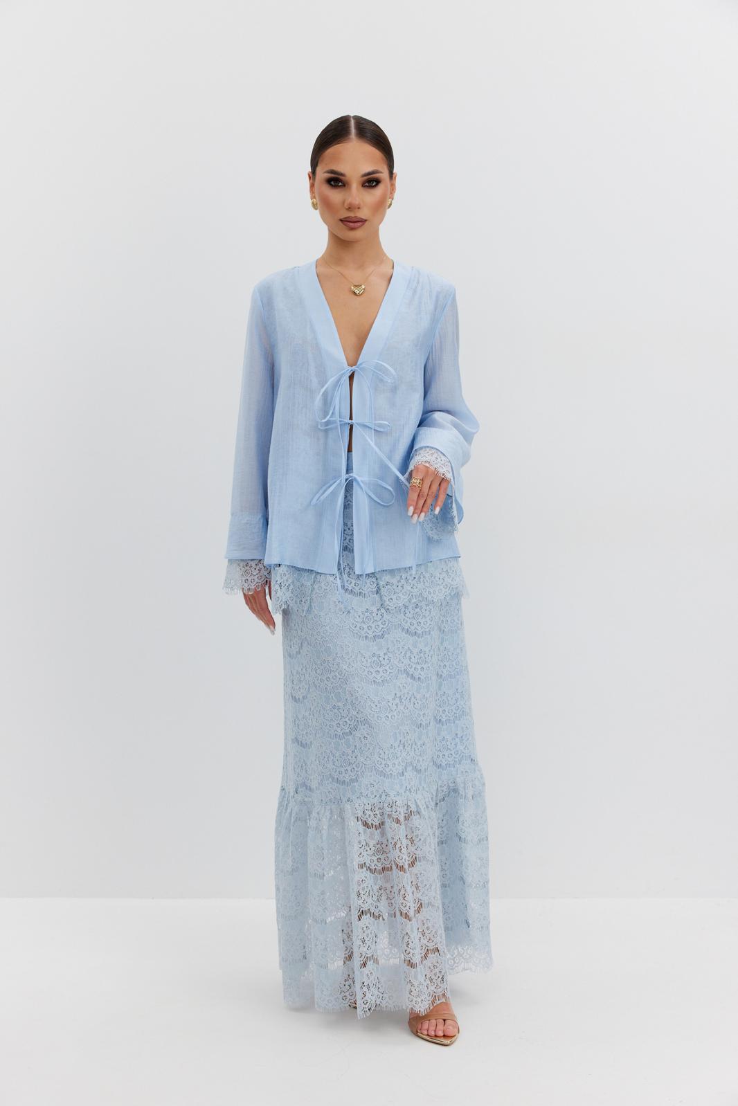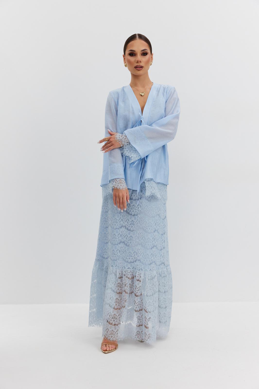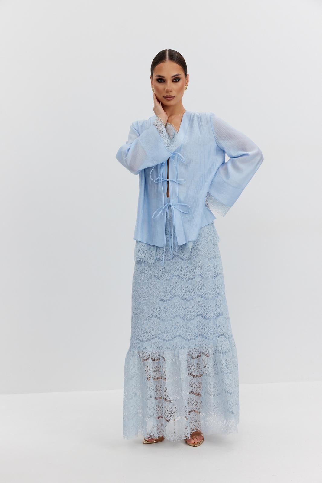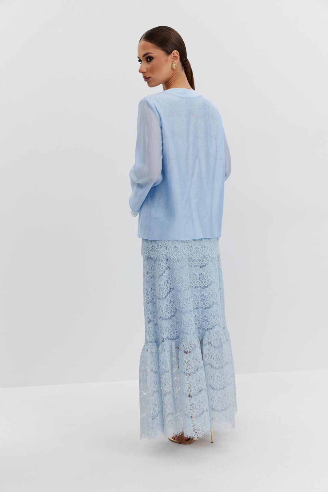 Юбка женская из кружевной ткани, имеет А-образный расширенный силуэт, с широким воланом со сборкой по низу, длина макси, юбка на подкладке. Верх юбки на поясе, со шлевками под ремень, застежка на потайную молнию по среднему шву сзади.