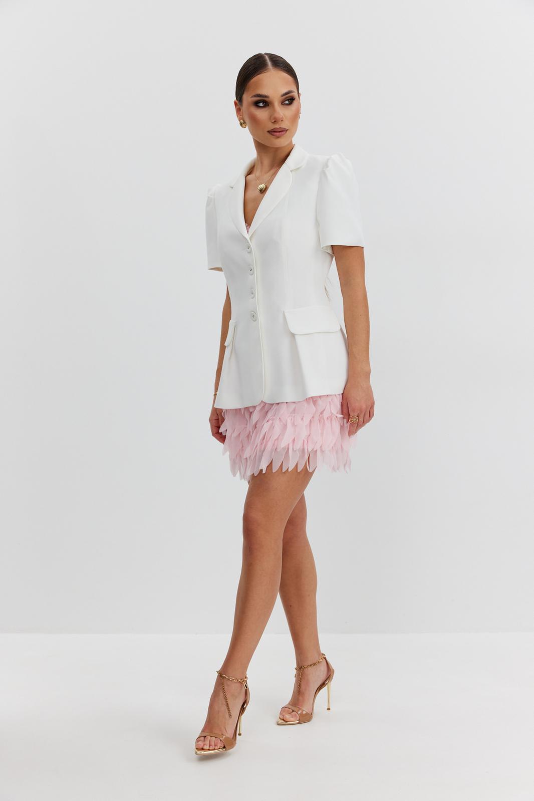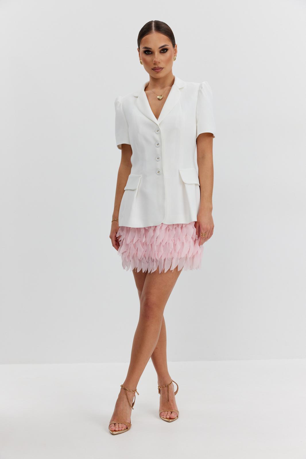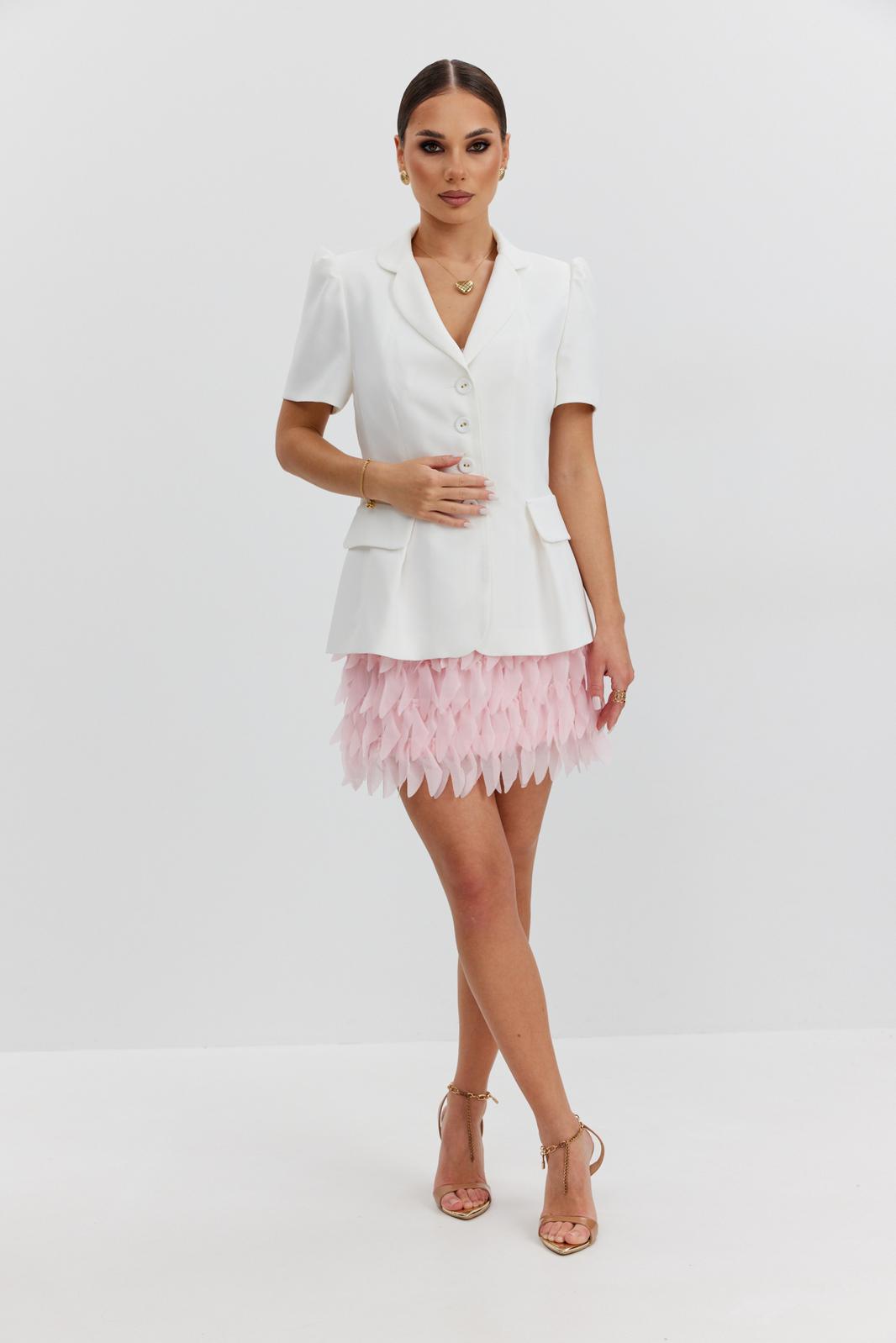 Юбка прямая из костюмно-плательной фактурной ткани, длины «мини». Пояс цельнокроеный, собран на резинку. Юбка на подкладке.