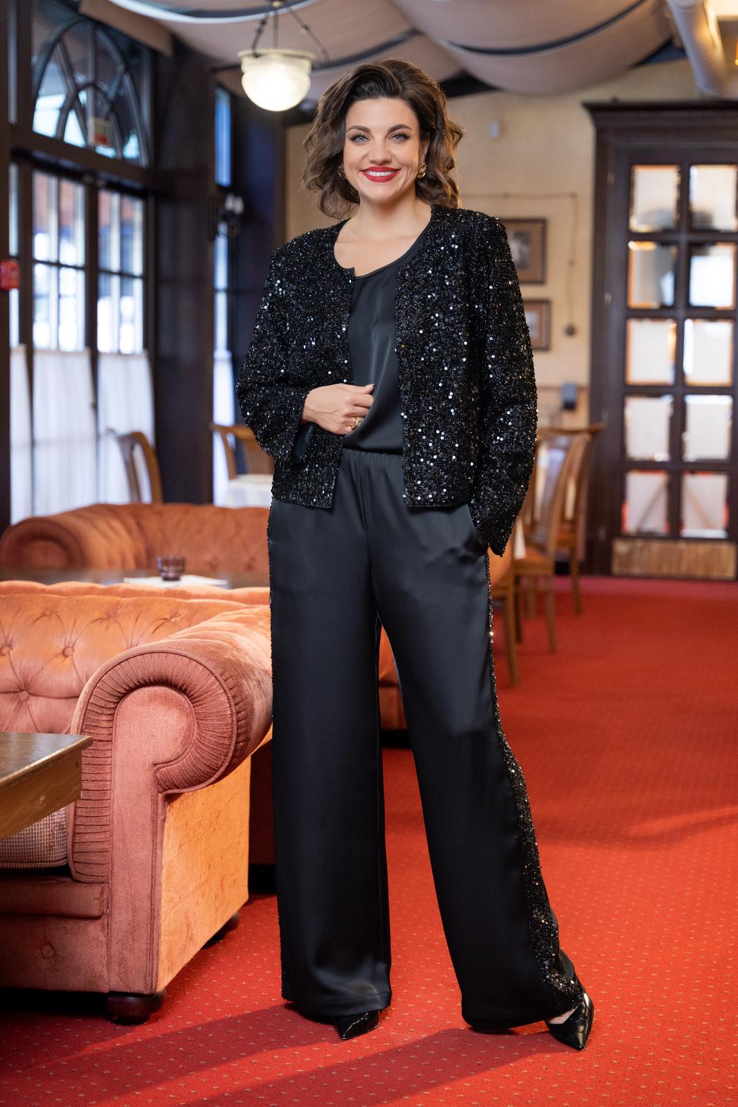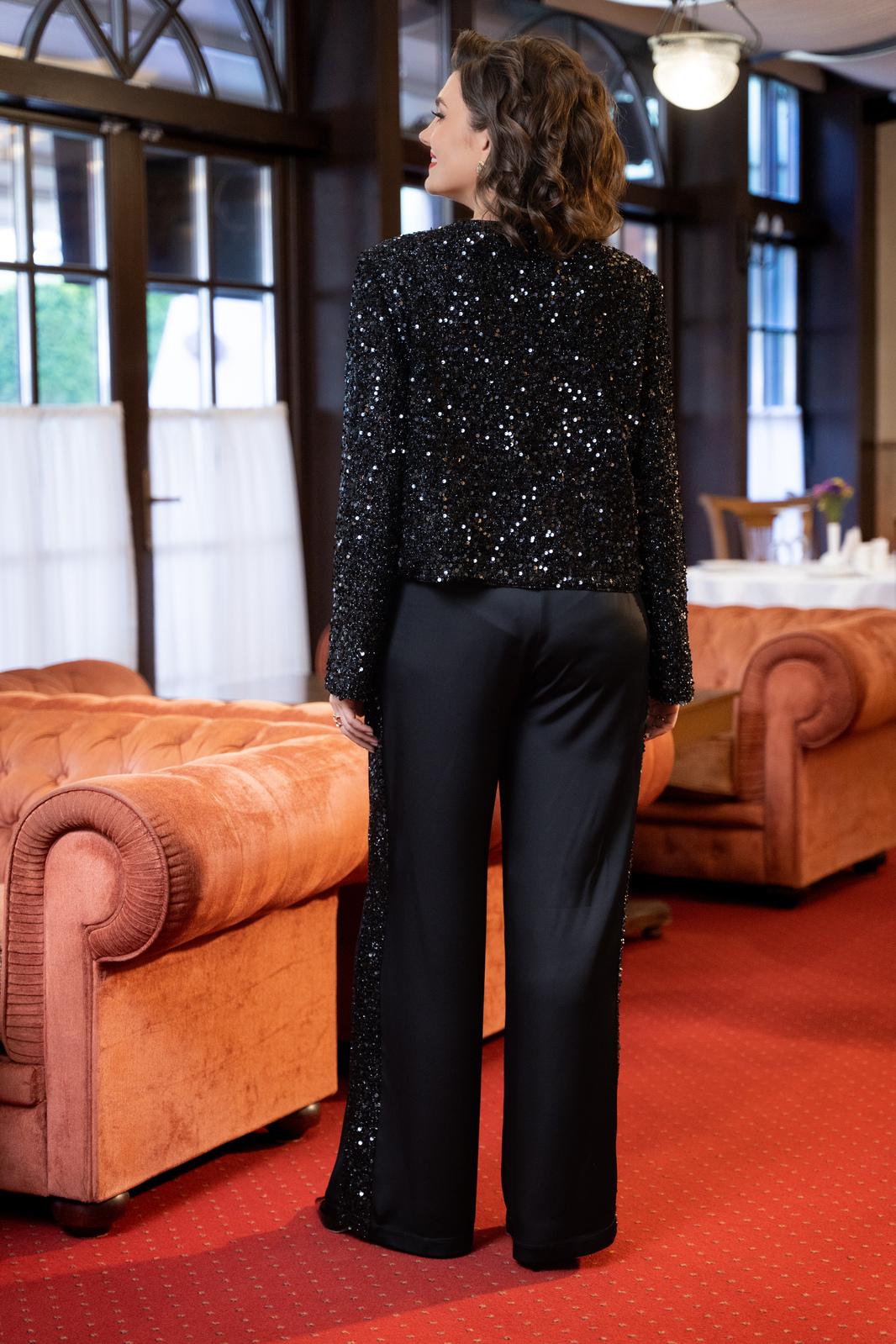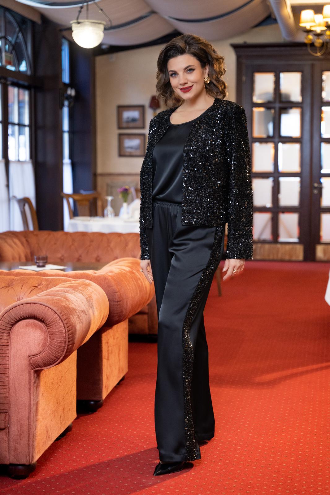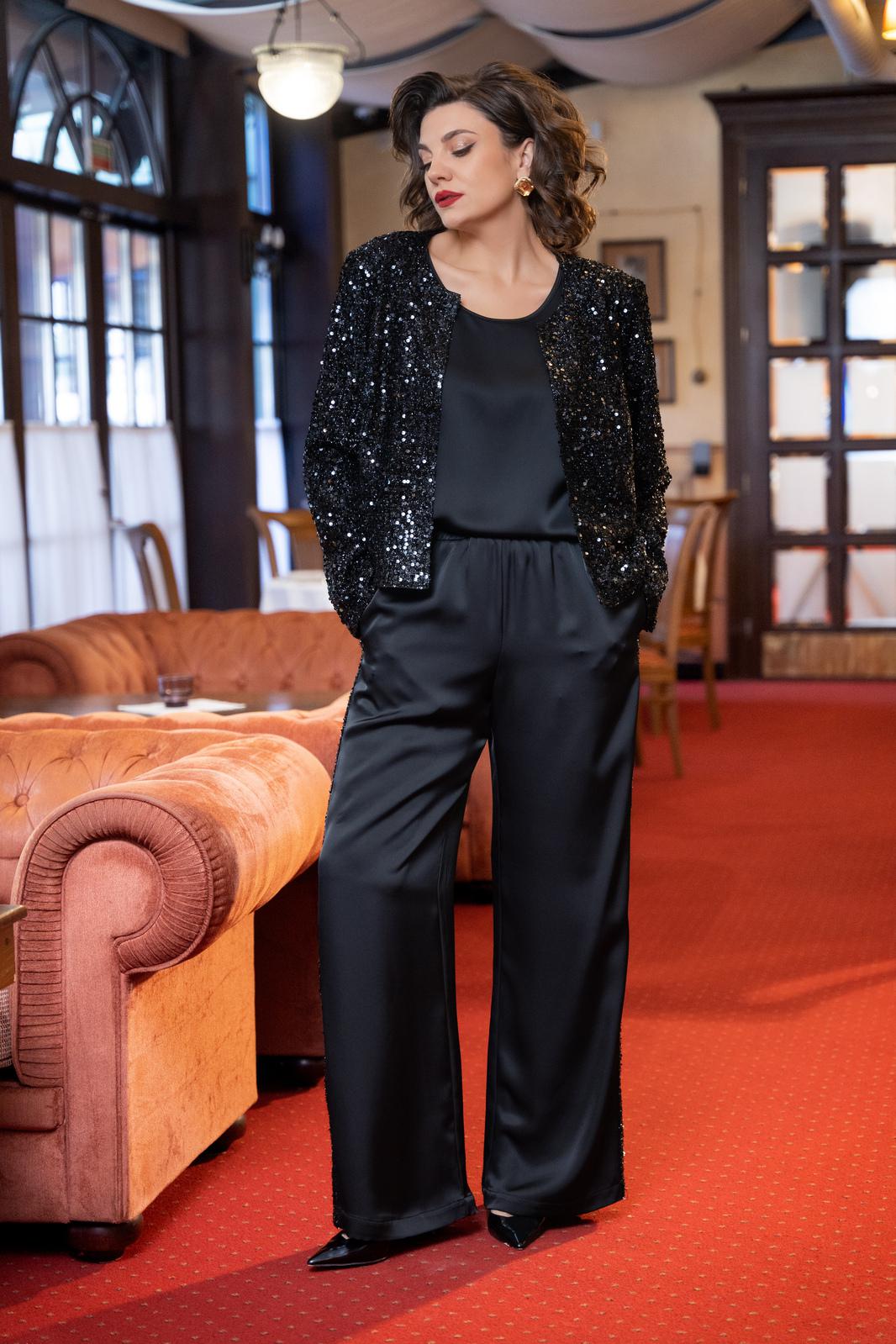 Комплект женский состоит из жакета, топа и брюк.Жакет прямого силуэта свободного покроя с естественной линией плеча на подкладке из атласной ткани.Горловина округлой формы.Застежка на съемные декоративные авторские банты с применением потайного крепления на небольшие кнопки, для возможности создания различных образов, как с бантами, так и без них.Топ свободного покроя.Горловина округлой формы.Проймы и горловина окантованы.Брюки свободные расширенного силуэта.По бокам выполнены лампасы из полотна с пайетками.Пояс притачной на резинке.В боковых швах карманы.