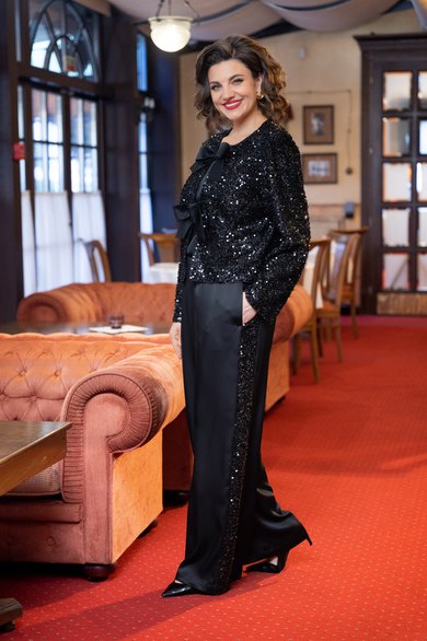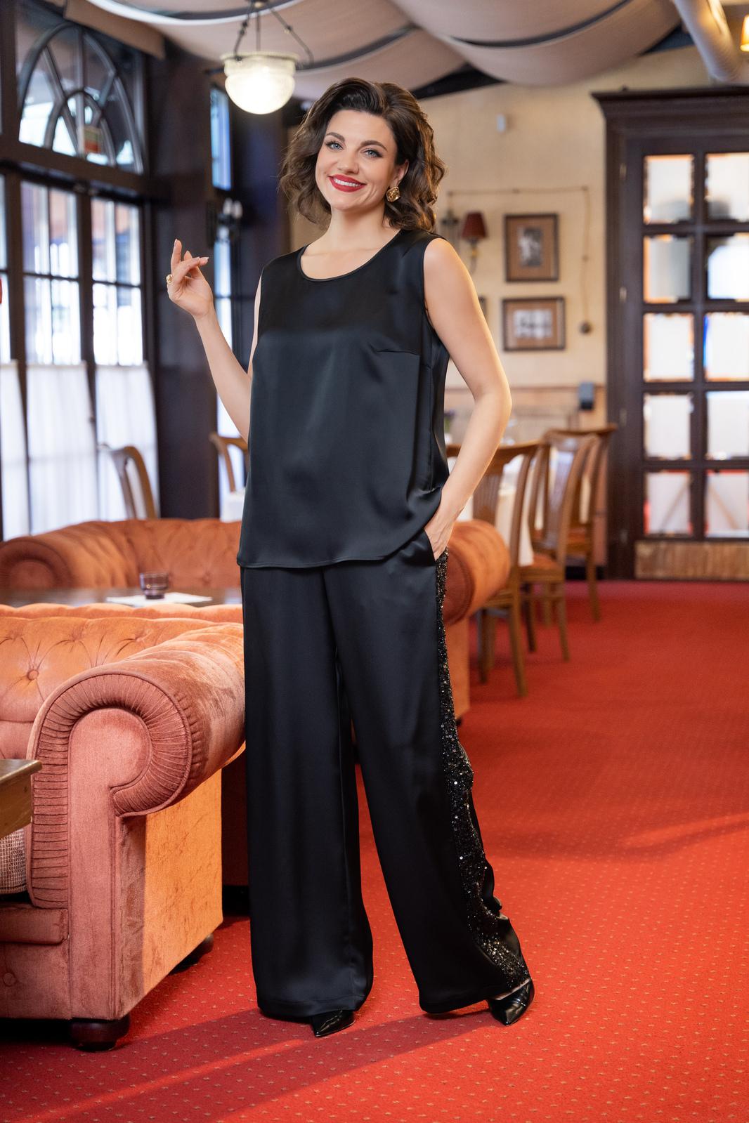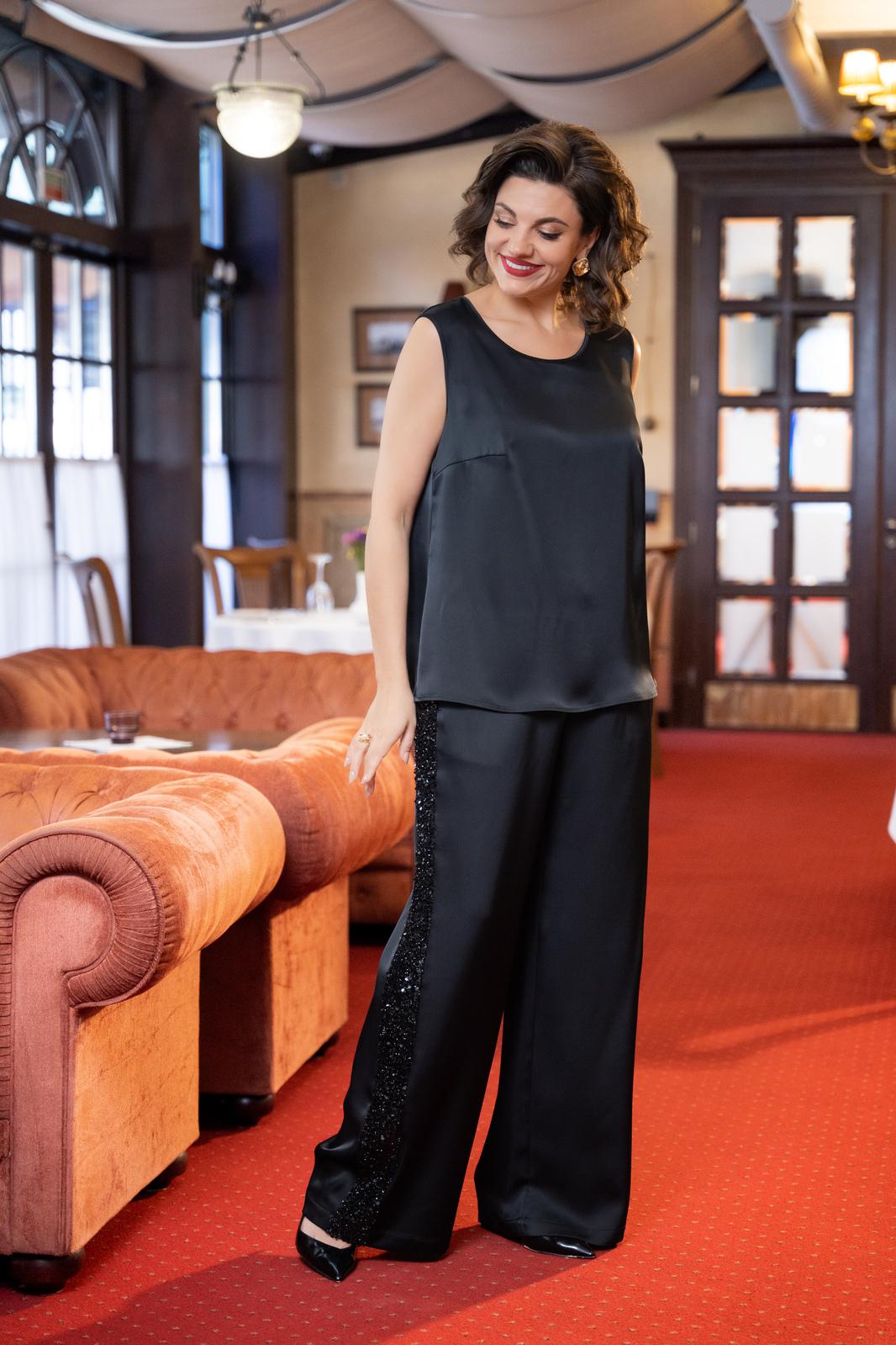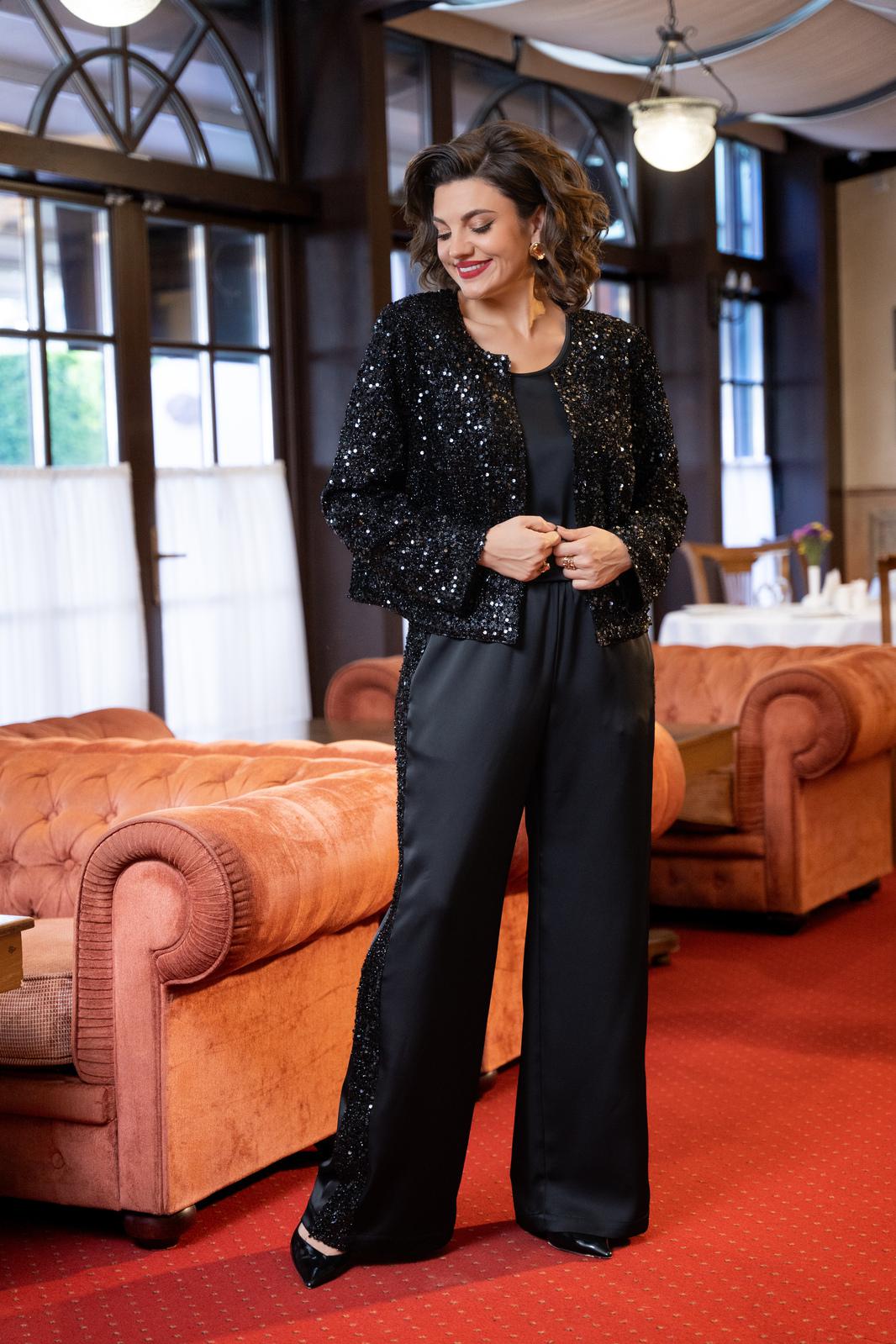 Комплект женский состоит из жакета, топа и брюк.Жакет прямого силуэта свободного покроя с естественной линией плеча на подкладке из атласной ткани.Горловина округлой формы.Застежка на съемные декоративные авторские банты с применением потайного крепления на небольшие кнопки, для возможности создания различных образов, как с бантами, так и без них.Топ свободного покроя.Горловина округлой формы.Проймы и горловина окантованы.Брюки свободные расширенного силуэта.По бокам выполнены лампасы из полотна с пайетками.Пояс притачной на резинке.В боковых швах карманы.