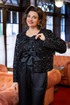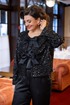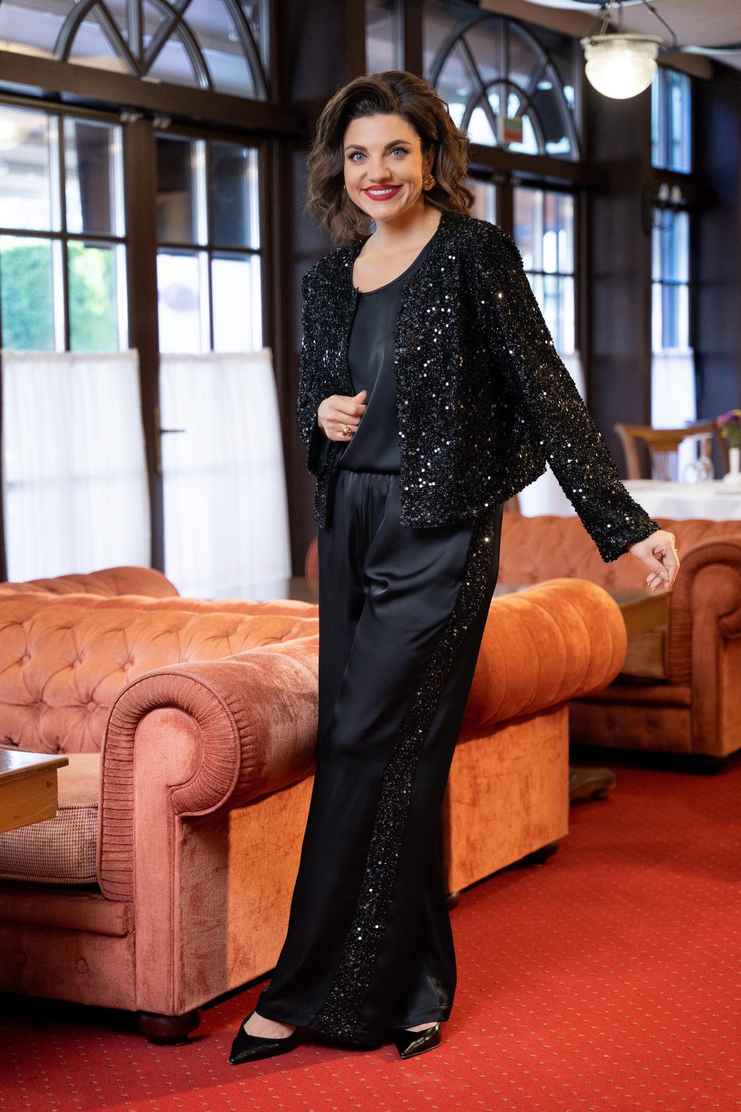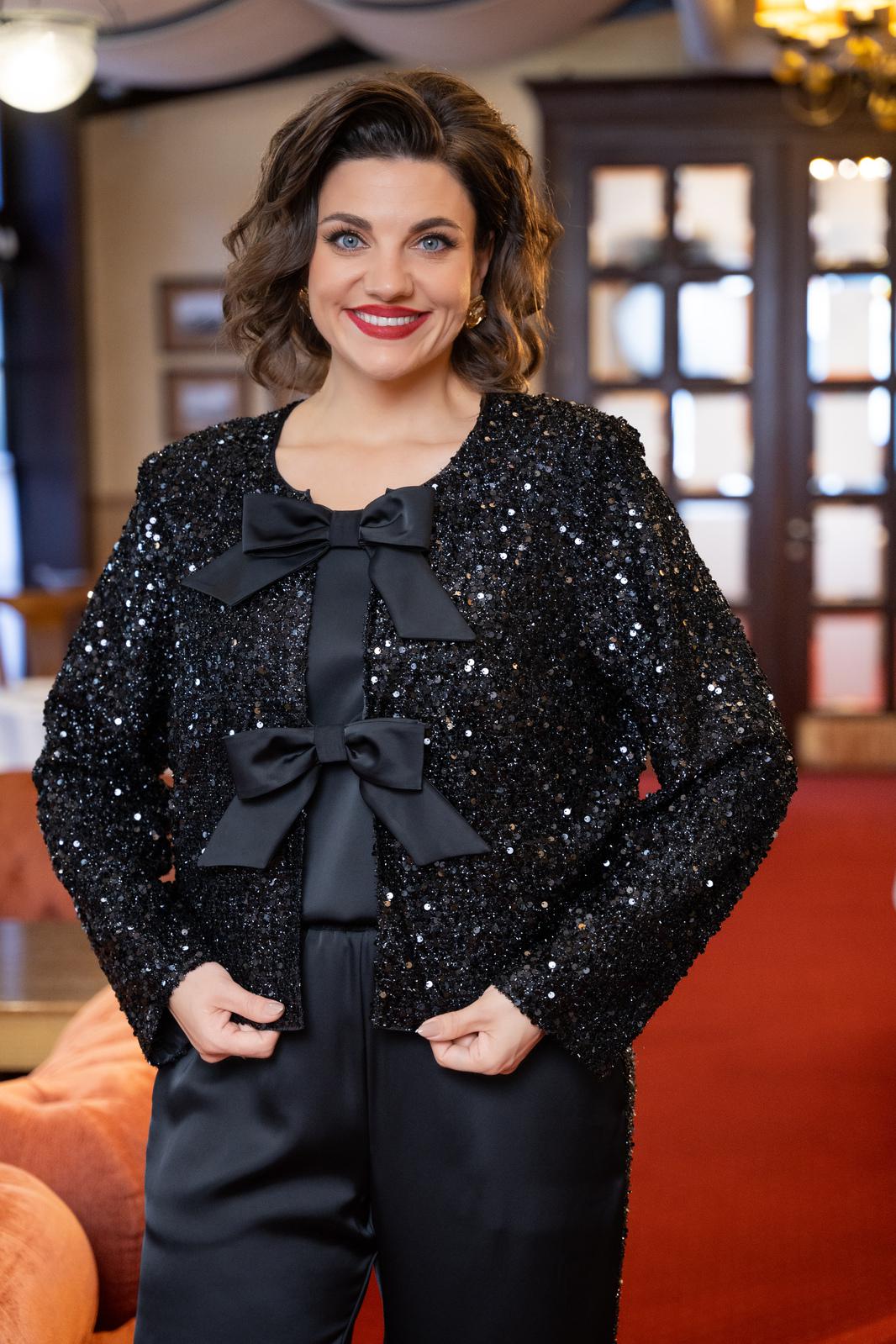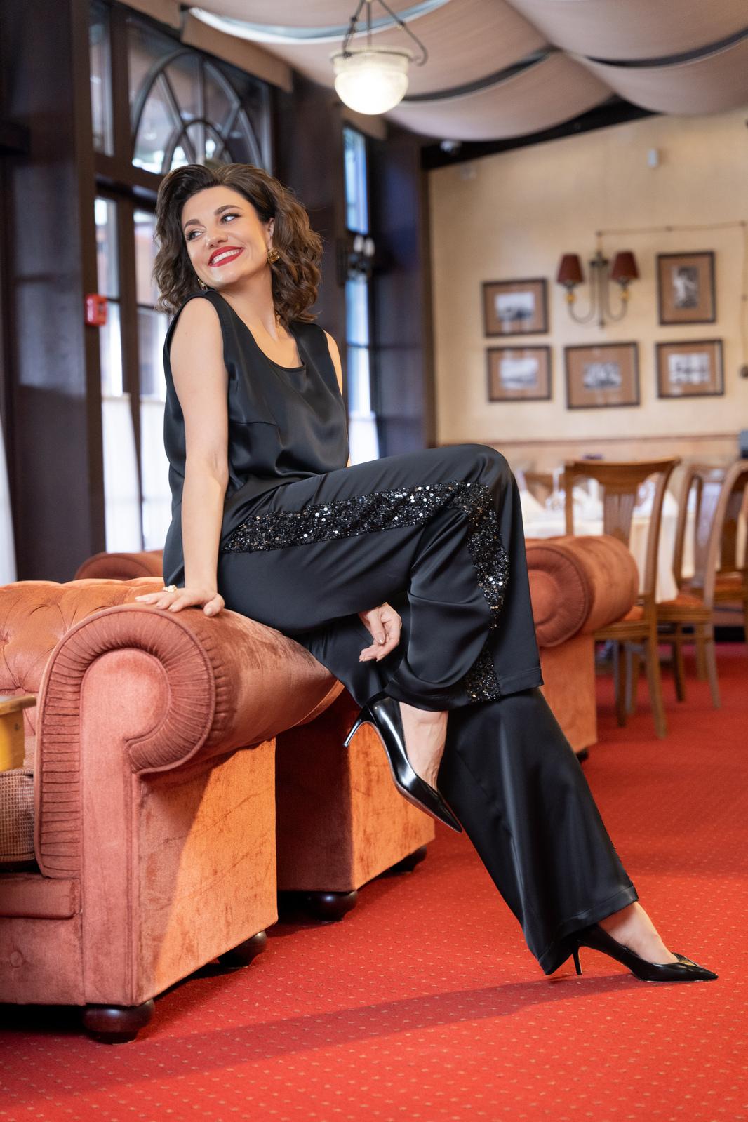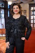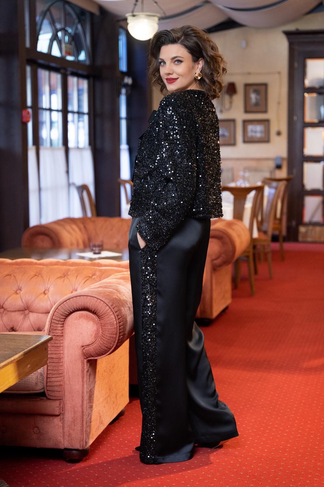 Комплект женский состоит из жакета, топа и брюк.Жакет прямого силуэта свободного покроя с естественной линией плеча на подкладке из атласной ткани.Горловина округлой формы.Застежка на съемные декоративные авторские банты с применением потайного крепления на небольшие кнопки, для возможности создания различных образов, как с бантами, так и без них.Топ свободного покроя.Горловина округлой формы.Проймы и горловина окантованы.Брюки свободные расширенного силуэта.По бокам выполнены лампасы из полотна с пайетками.Пояс притачной на резинке.В боковых швах карманы.