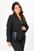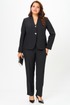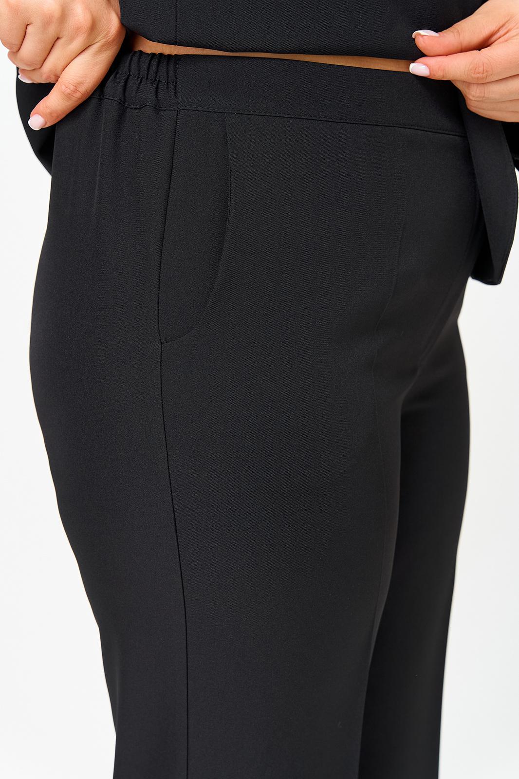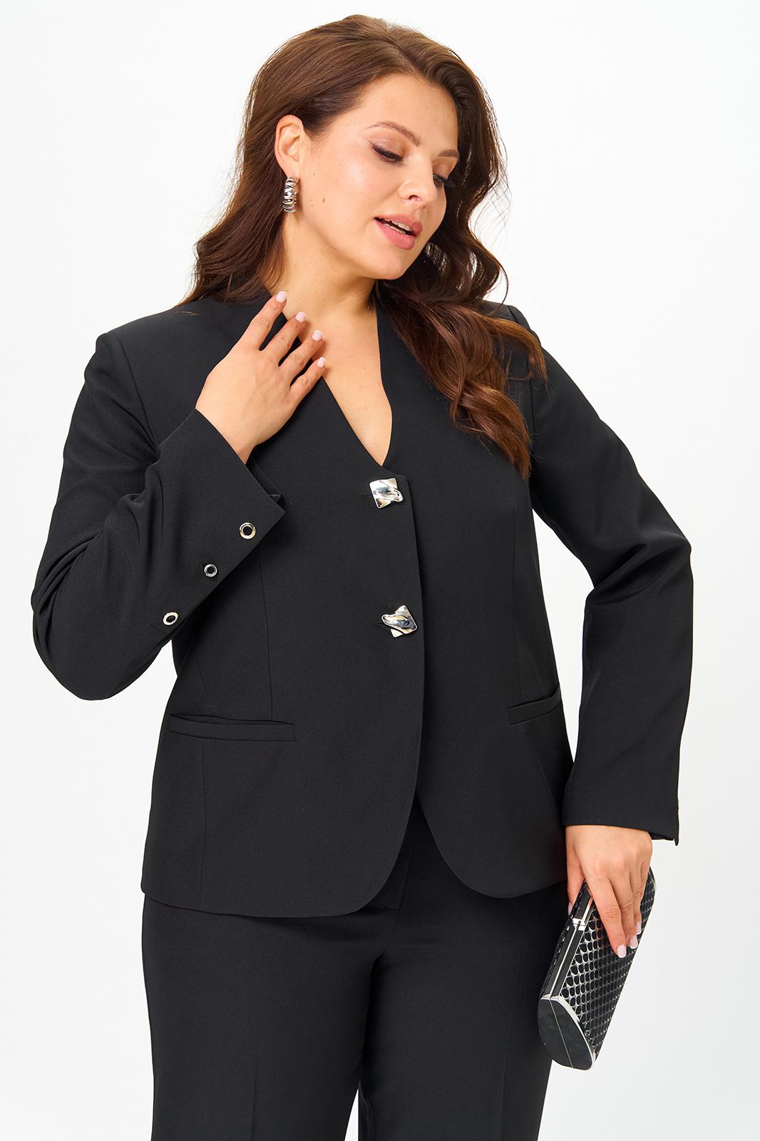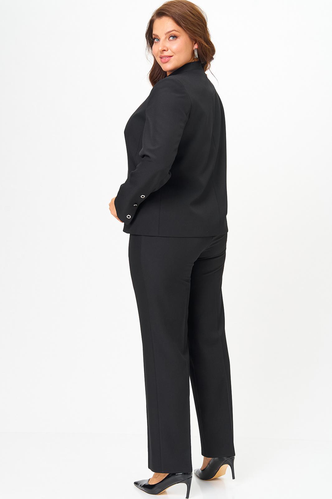 Костюм женский двухпредметный, состоящий из жакета и брюк. Жакет полуприлегающего силуэта на подкладке с центральной бортовой застежкой на 2 декоративные петли-пуговицы. Перед с талиевой вытачкой, отрезным бочком и карманом с листочкой. Борт имеет закругленную форму. Горловина оформлена фигурно с цельнокроенной стойкой по переду и с отрезной по спинке. Спинка со средним швом. Рукава втачные двухшовные с отлетной шлицей, открытой с настрочной декоративной тесьмой, двумя блочками и одной петлей-пуговицей. Брюки классического кроя, слегка зауженные к низу, с притачным поясом сзади на резинке. Застежка на тесьму-молнию и одну петлю-пуговицу по поясу. Карман фигурной формы, с отрезным бочком. На изделии заутюжены стрелки.