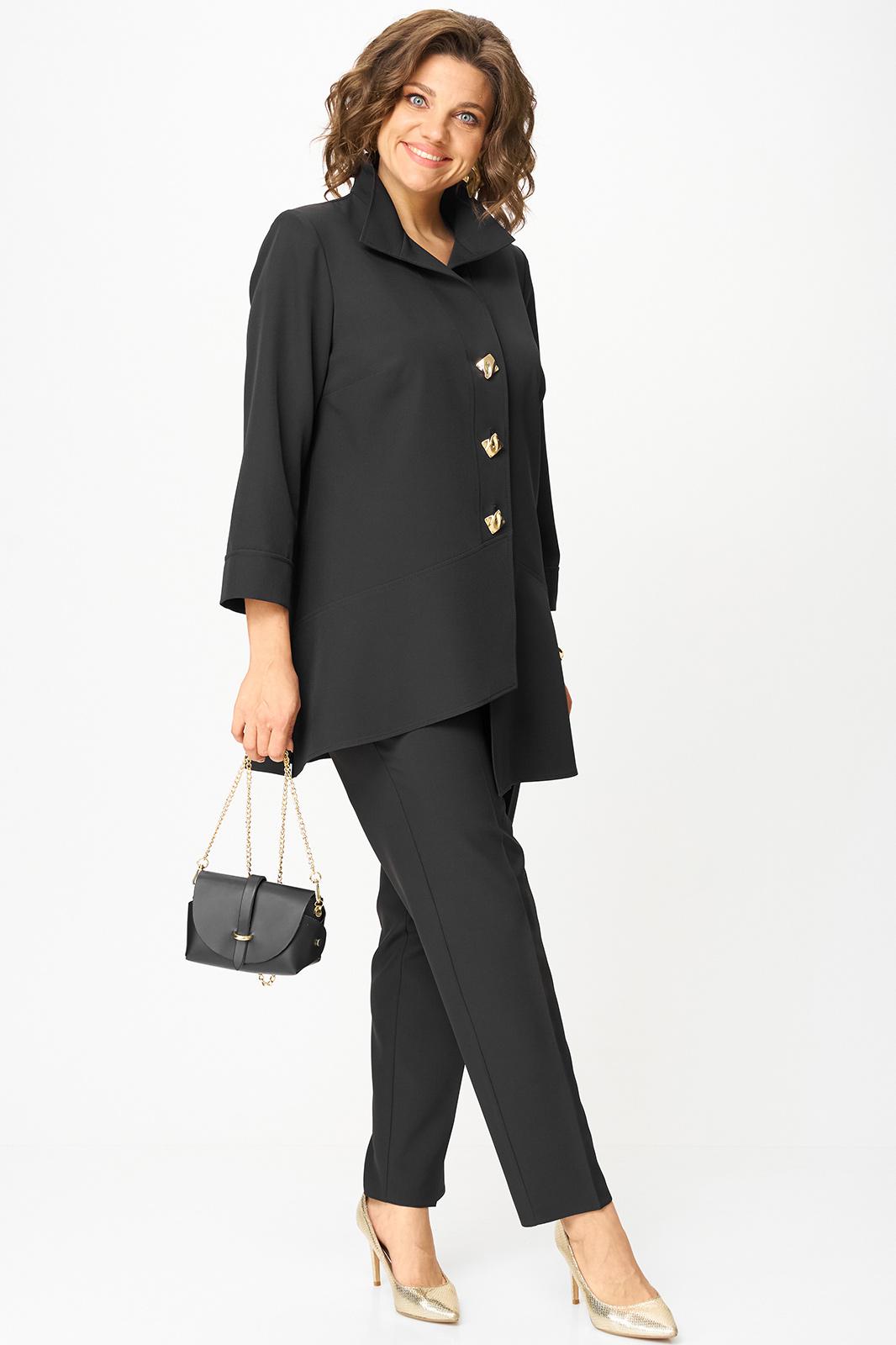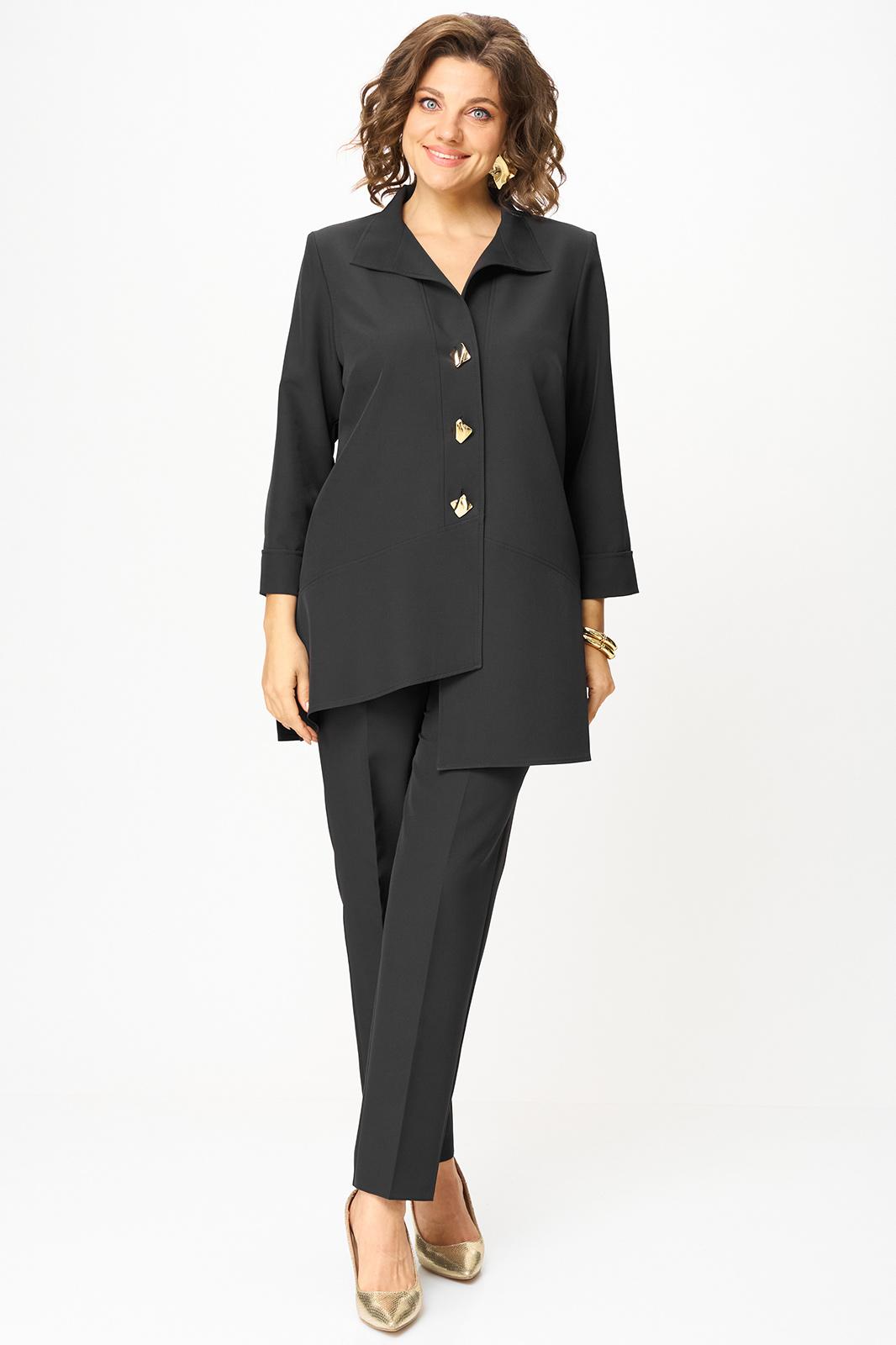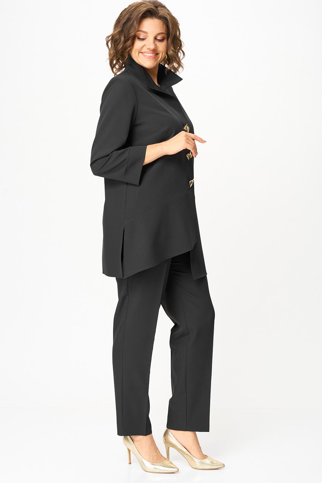 Комплект женский, состоящий из туники и брюк. Туника А-образного силуэта с центральной застежкой на планку до подреза на 3 декоративные петли-пуговицы. Перед с нагрудной вытачкой и фигурными подрезами. Спинка с горизонтальной кокеткой и двумя складками. В боковых швах обработаны разрезы. Низ переда ассиметричен и слегка разведен. Рукава втачные одношовные длиной 3/4 с защипом, имитирующим манжет. Воротник-стойка. Брюки классического кроя, зауженные к низу с притачным поясом сзади на резинке. Застежка на тесьму-молнию в среднем шве передних половинок и 1 петлю-пуговицу по поясу. На брюках заутюжены канты.