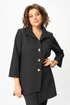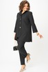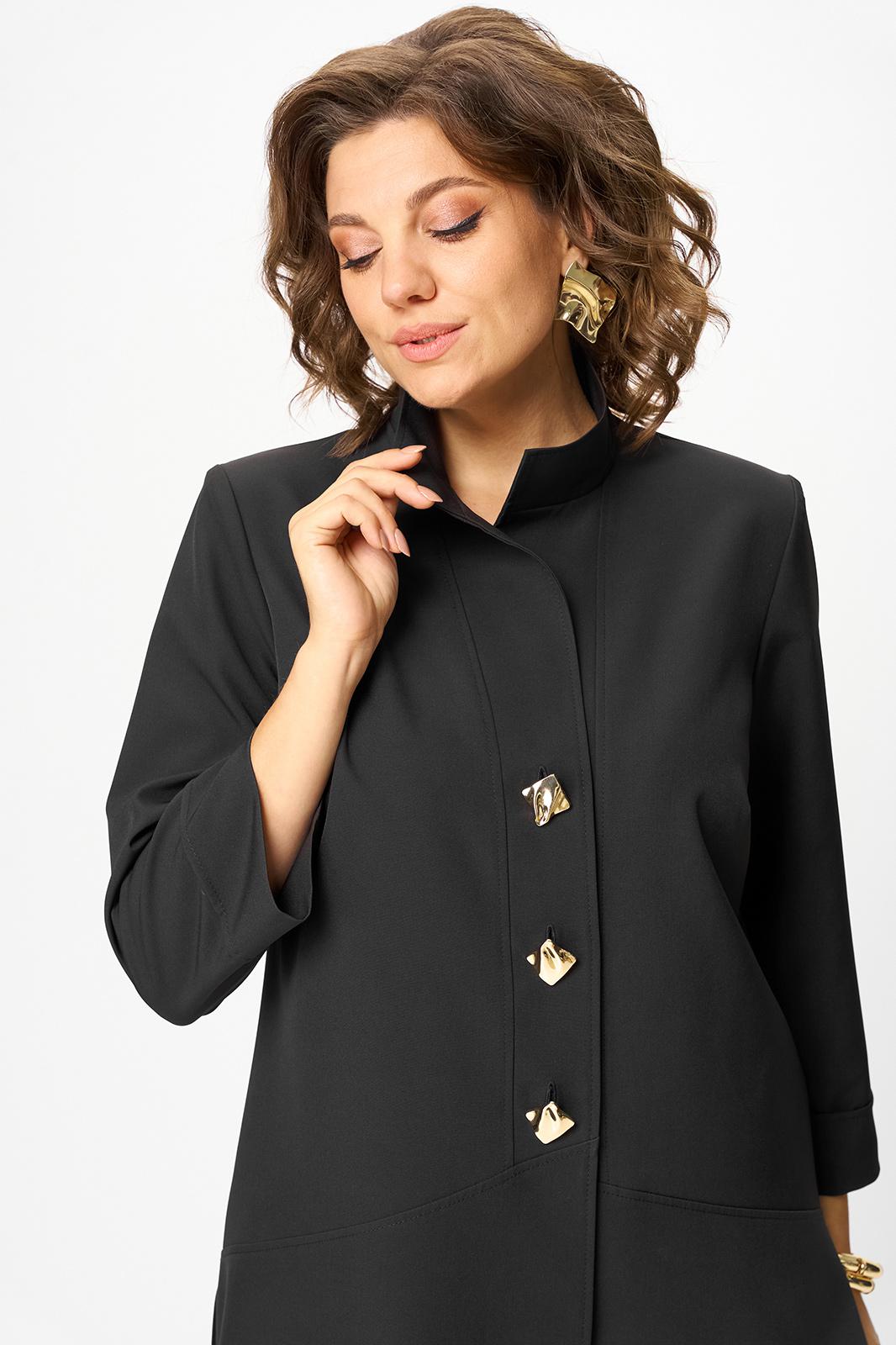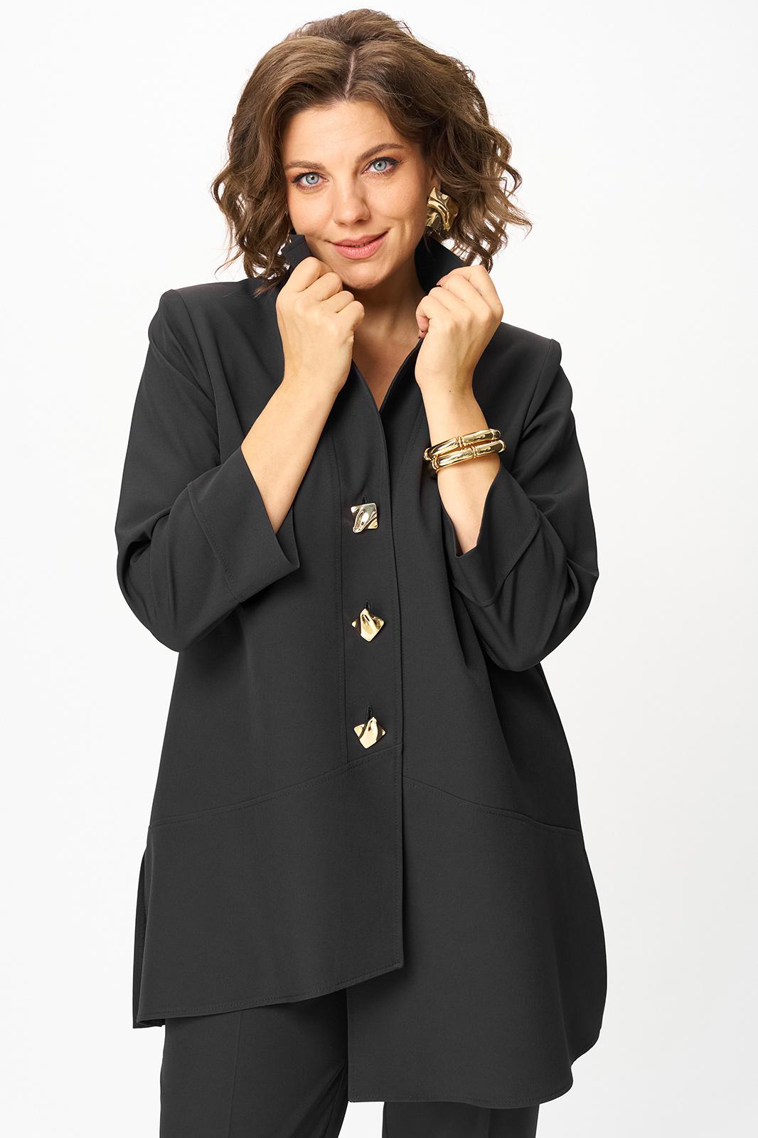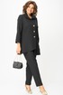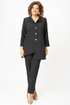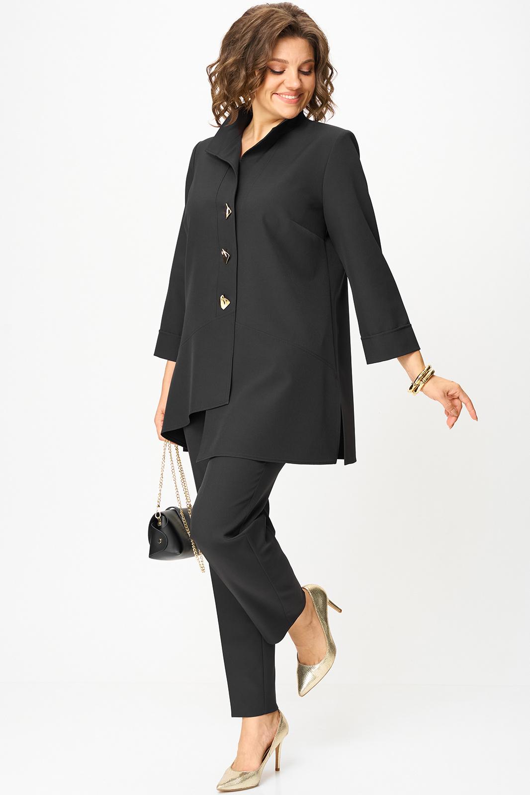 Комплект женский, состоящий из туники и брюк. Туника А-образного силуэта с центральной застежкой на планку до подреза на 3 декоративные петли-пуговицы. Перед с нагрудной вытачкой и фигурными подрезами. Спинка с горизонтальной кокеткой и двумя складками. В боковых швах обработаны разрезы. Низ переда ассиметричен и слегка разведен. Рукава втачные одношовные длиной 3/4 с защипом, имитирующим манжет. Воротник-стойка. Брюки классического кроя, зауженные к низу с притачным поясом сзади на резинке. Застежка на тесьму-молнию в среднем шве передних половинок и 1 петлю-пуговицу по поясу. На брюках заутюжены канты.