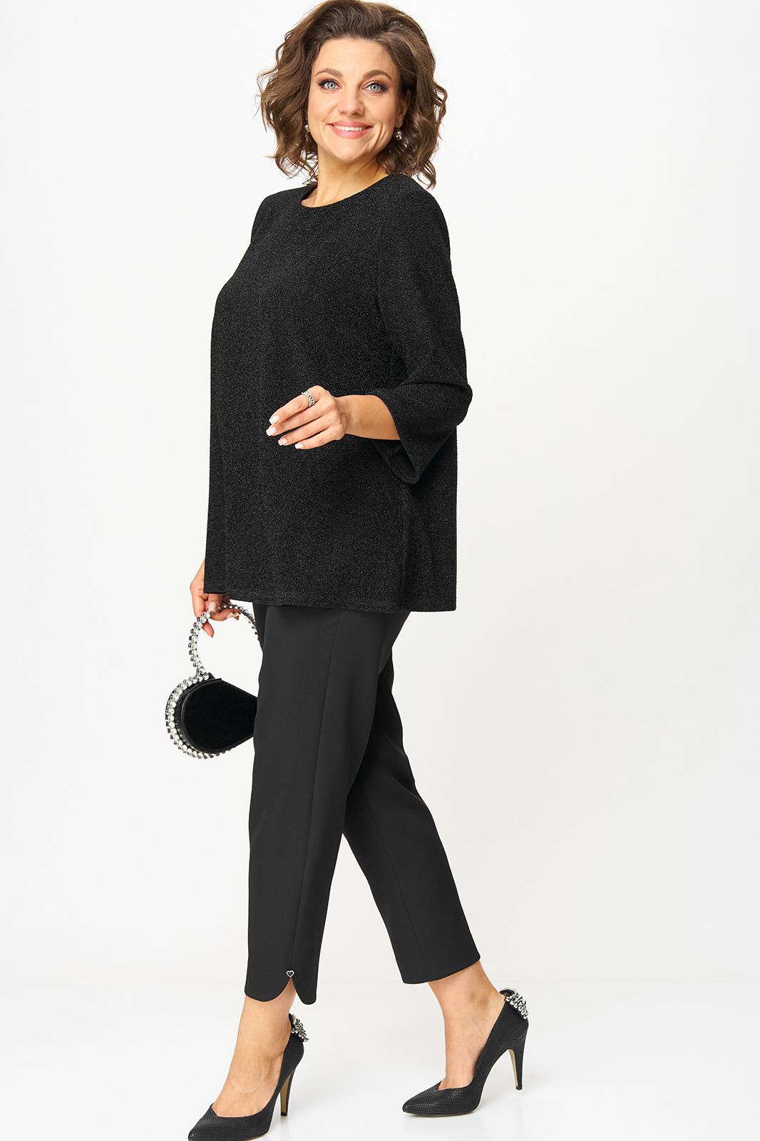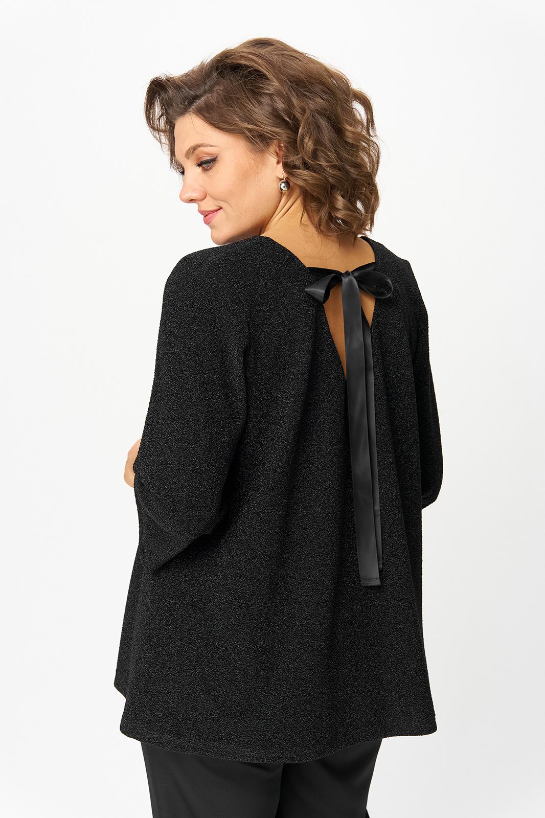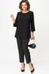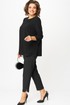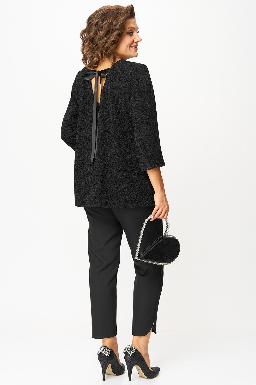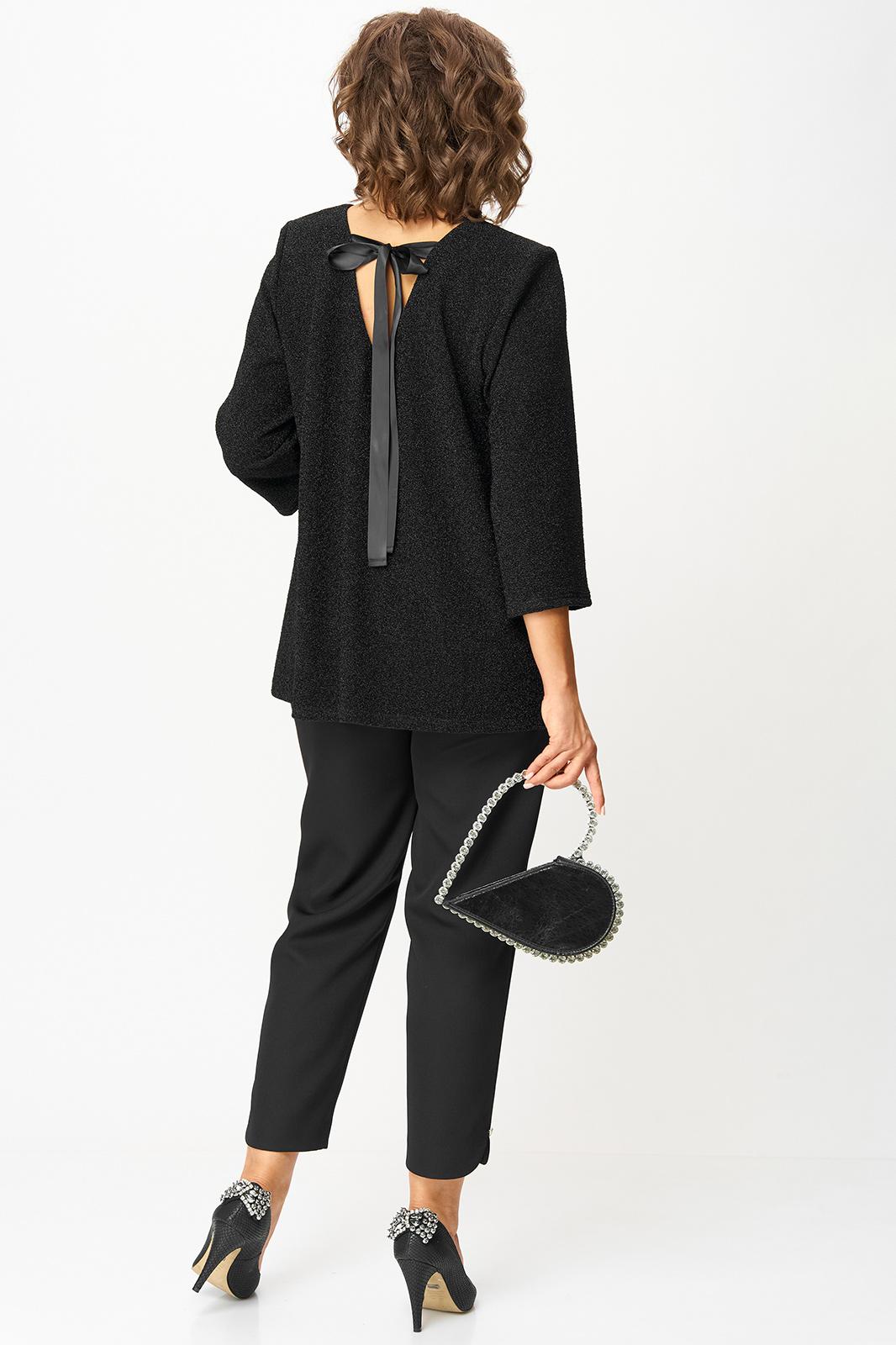 Костюм женский двухпредметный, состоящий из блузки и брюк. Блузка А-образного силуэта с нагрудными вытачками, выходящими из боковых швов. Горловина овальной формы. Спинка с V-образным вырезом по горловине, в который вставлена атласная лента для завязывания банта. Рукава втачные одношовные прямые длиной 3/4. Брюки классического кроя, заутюженные к низу с притачным поясом сзади на резинке. Застежка на тесьму-молнию в средних срезах передних половинок и одну петлю-пуговицу по поясу. По поясу передних половинок настрочено декоративное кружево с завязками. Низ брюк в районе боковых швов фигурно обработан и декорирован пуговицей.