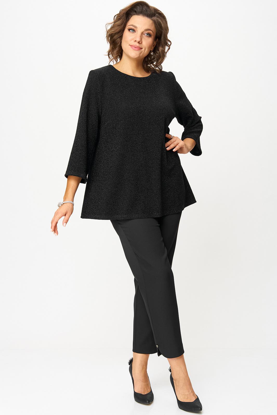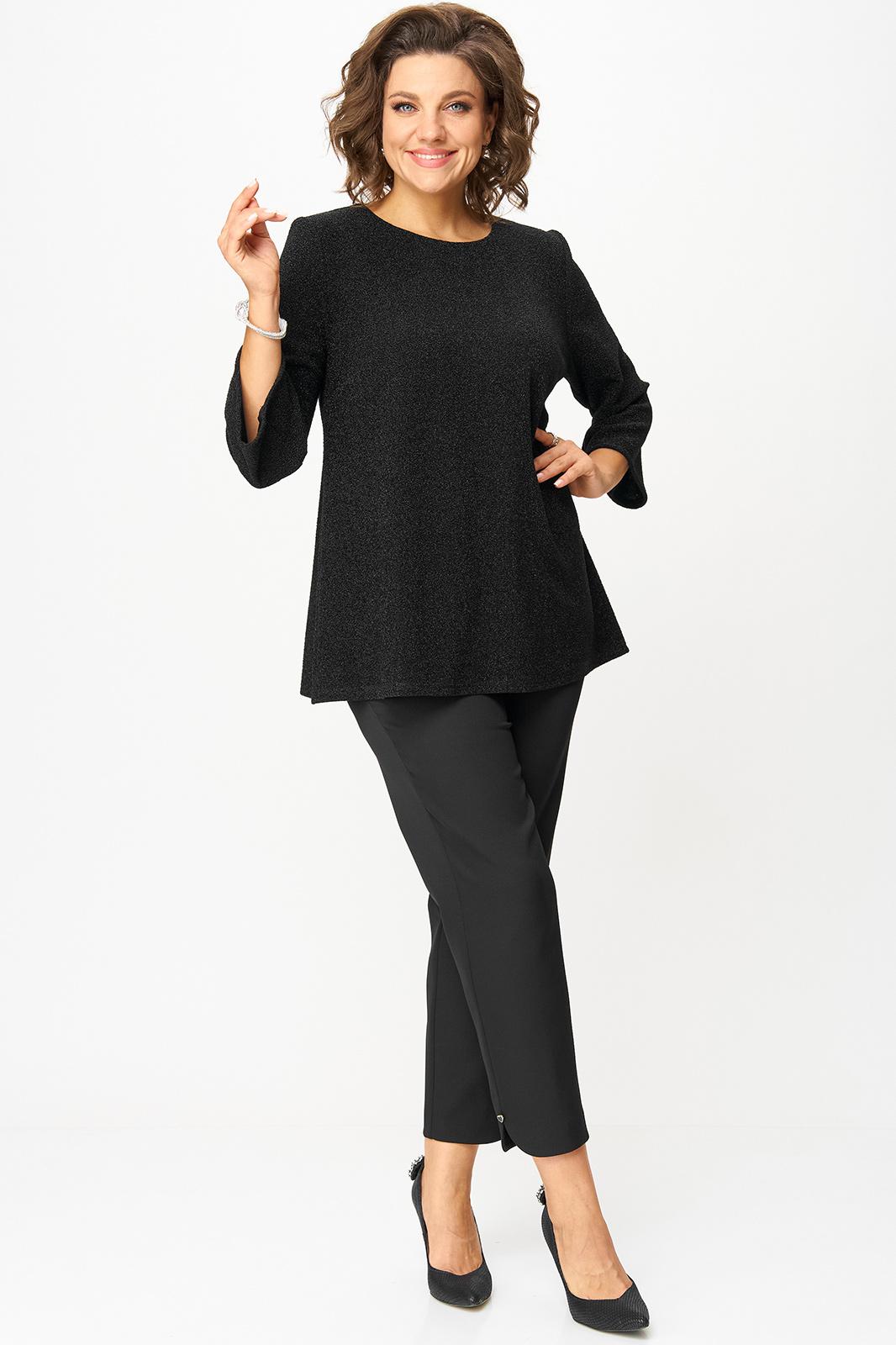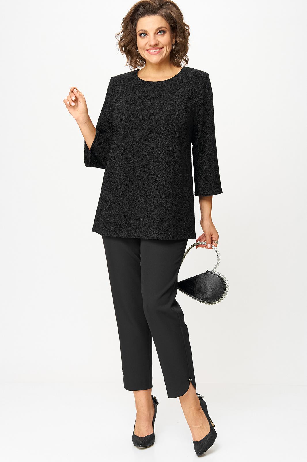 Костюм женский двухпредметный, состоящий из блузки и брюк. Блузка А-образного силуэта с нагрудными вытачками, выходящими из боковых швов. Горловина овальной формы. Спинка с V-образным вырезом по горловине, в который вставлена атласная лента для завязывания банта. Рукава втачные одношовные прямые длиной 3/4. Брюки классического кроя, заутюженные к низу с притачным поясом сзади на резинке. Застежка на тесьму-молнию в средних срезах передних половинок и одну петлю-пуговицу по поясу. По поясу передних половинок настрочено декоративное кружево с завязками. Низ брюк в районе боковых швов фигурно обработан и декорирован пуговицей.
