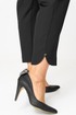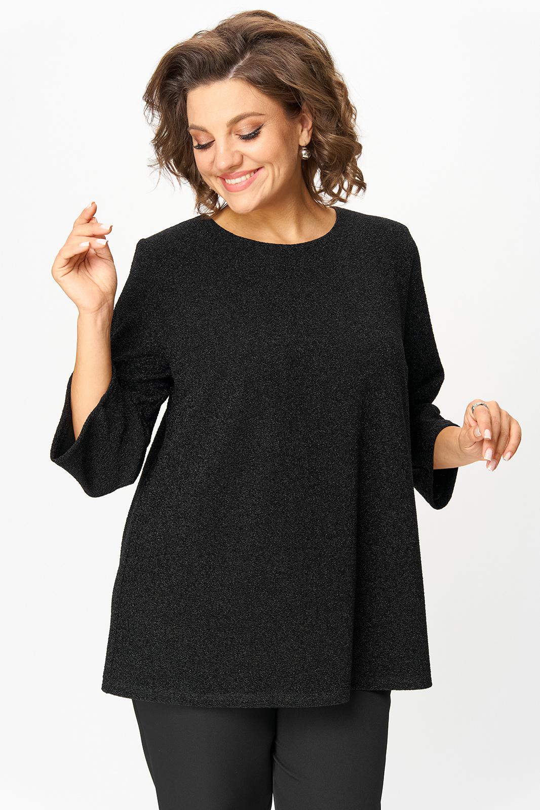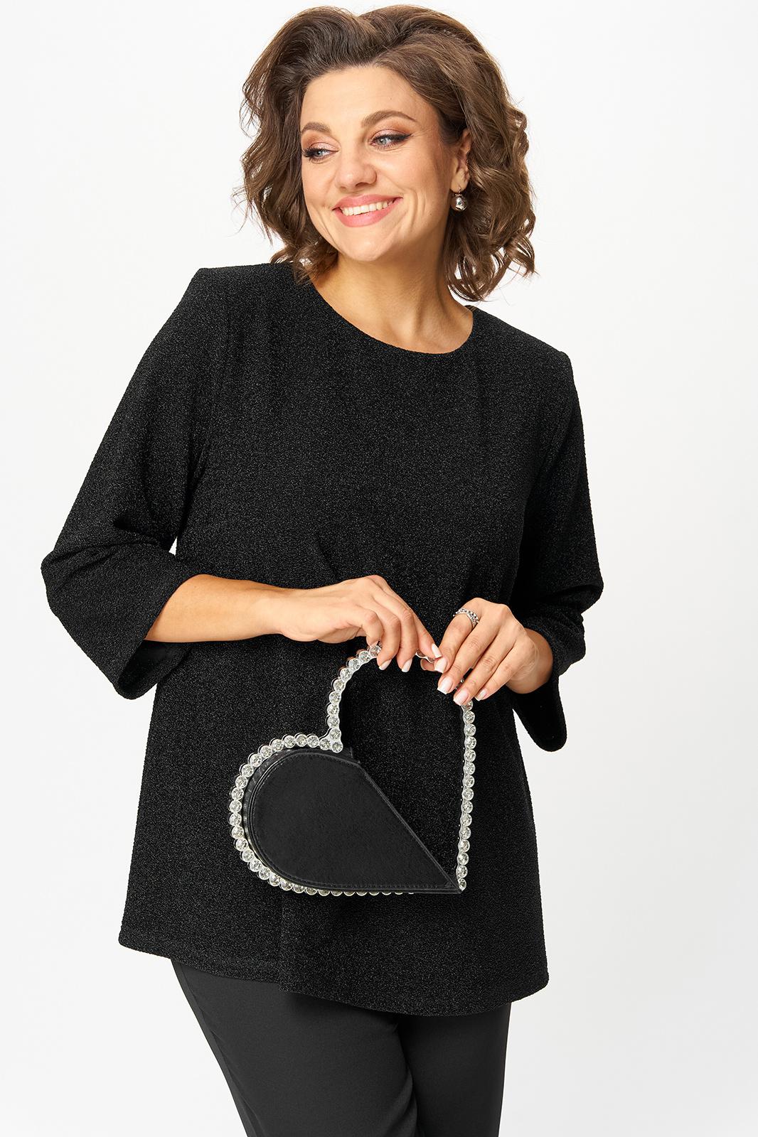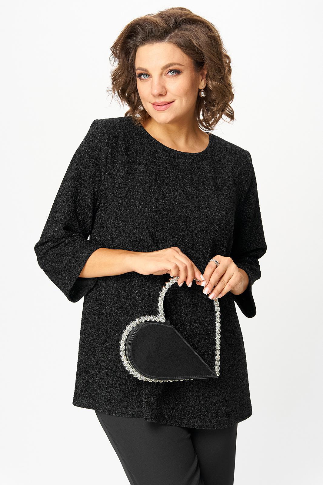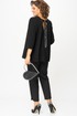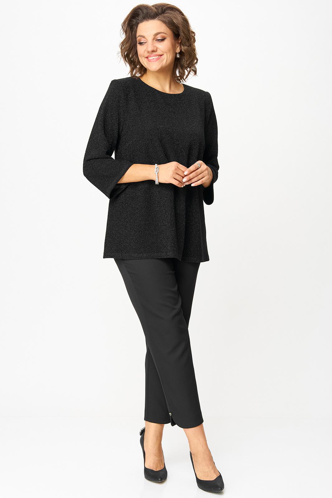 Костюм женский двухпредметный, состоящий из блузки и брюк. Блузка А-образного силуэта с нагрудными вытачками, выходящими из боковых швов. Горловина овальной формы. Спинка с V-образным вырезом по горловине, в который вставлена атласная лента для завязывания банта. Рукава втачные одношовные прямые длиной 3/4. Брюки классического кроя, заутюженные к низу с притачным поясом сзади на резинке. Застежка на тесьму-молнию в средних срезах передних половинок и одну петлю-пуговицу по поясу. По поясу передних половинок настрочено декоративное кружево с завязками. Низ брюк в районе боковых швов фигурно обработан и декорирован пуговицей.