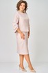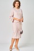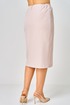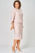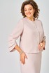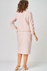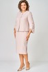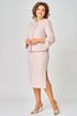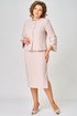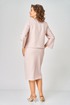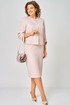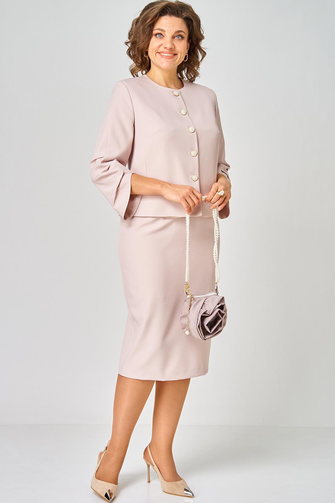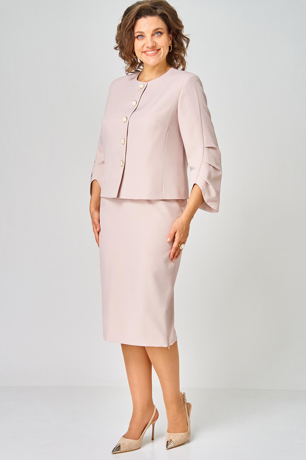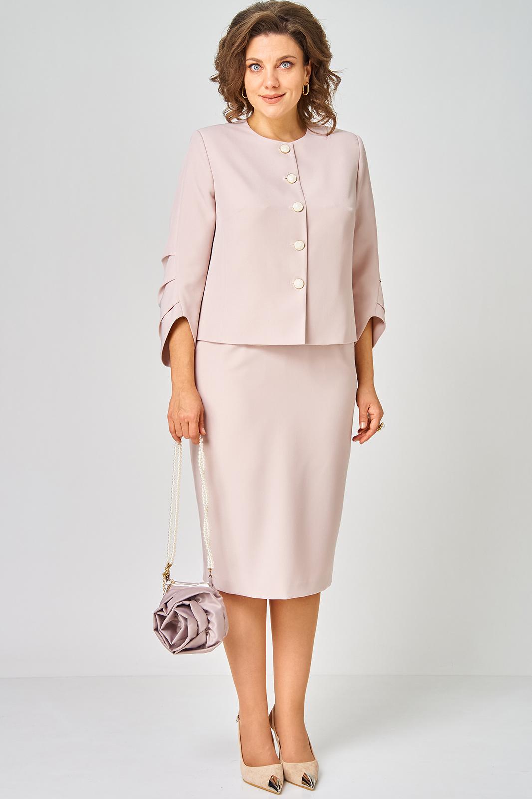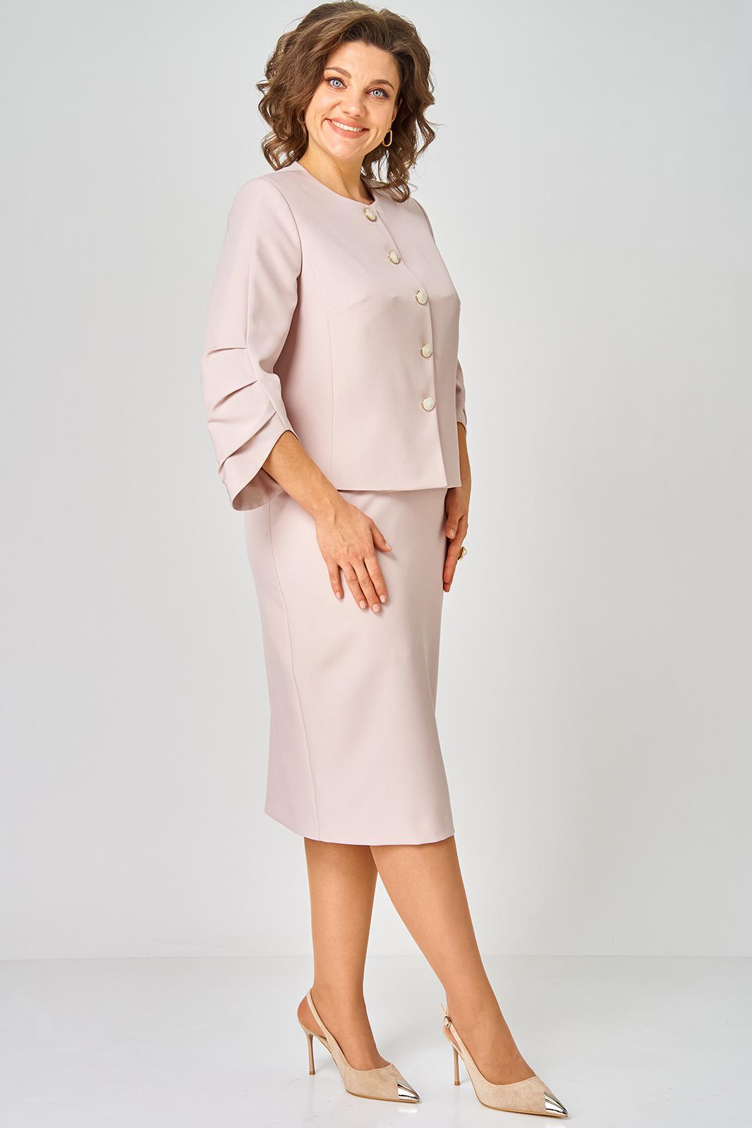 Костюм женский двухпредметный, состоящий из жакета и юбки. Жакет укороченный, на подкладке, с центральной бортовой застежкой на 5 петель-пуговиц. Перед с отрезным бочком и нагрудной вытачкой. Спинка со средним швом. Горловина овальной формы. Рукава 3-шовные с тремя складками по среднему шву рукава и фигурнооформленным низом, укороченные. Воротник объемный декоративный, с кружевом и бусинами. Юбка зауженная к низу длиной за колено с притачным поясом. На участках от вытачки переднего полотнища до вытачки заднего полотнища вставлена эластичная тесьма-резинка. В боковом шве по низу изделия обработана потайная тесьма-молния, для эффекта - разрез. Застежка в среднем шве заднего полотнища на петлю-пуговицу и потайную тесьму-молнию.