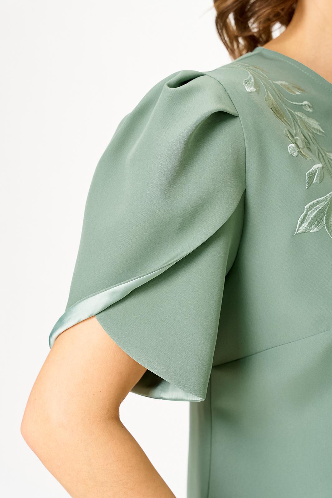 Костюм женский двухпредметный, состоящий из блузы и юбки. Блуза прямого силуэта, декорированная вышивкой, с нагрудными вытачками, выходящими из боковых швов, и с разрезами. Спинка со средним швом, в котором обработан разрез с навесной петлей и пуговицей. Горловина овальной формы. Рукава короткие фантазийной формы на запах со складками по окату. Рукав двойной, обтачен атласной тканью. Юбка-карандаш длиной до линии колена, с притачным поясом из атласа, на резинке между талиевыми вытачками. Заднее полотнище со средним швом, заканчивающимся шлицей. Застежка на одну петлю-пуговицу по поясу и тесьму-молнию в среднем шве.