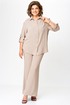 Костюм из легкой ткани идеально подойдет для расслабленного образа. Бежевый цвет никогда не потеряет актуальности. Модель понравится и поклонникам базового гардероба, и тем, кто готов дополнить такие классические комплекты акцентными аксессуарами и цветными топами. Ткань с легким эффектом крэш. Свободный крой не сковывает движений и дарит комфорт. Блузка прямого силуэта, центральной застежкой на петли и пуговицы по притачной планке. В верхней части левой полочки настрочен карман. Воротник рубашечного типа, на притачной стойке. Пройма углубленной формы. Рукав длинный, собирается на пату. В области бедер брюки полуприлегающие, в колене и по низу свободные. По передним половинкам выполнены наклонные карманы и застежка на молнию в среднем шве. По задней половине обработаны талевые вытачки. Брюки на притачном поясе с эластичной тесьмой и застежкой на петлю и пуговицу. Такой костюм – безусловный фаворит этого сезона!