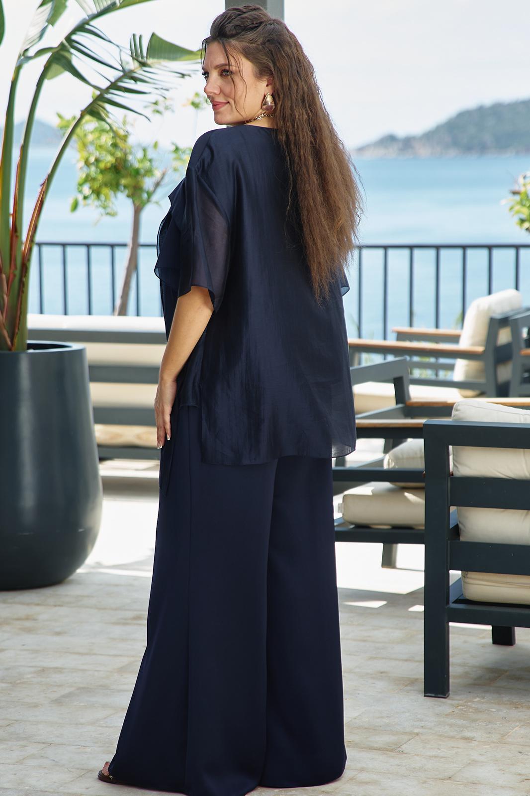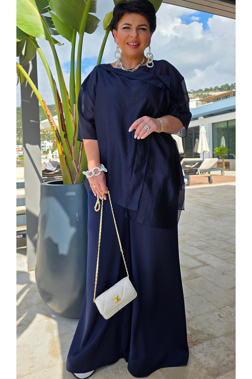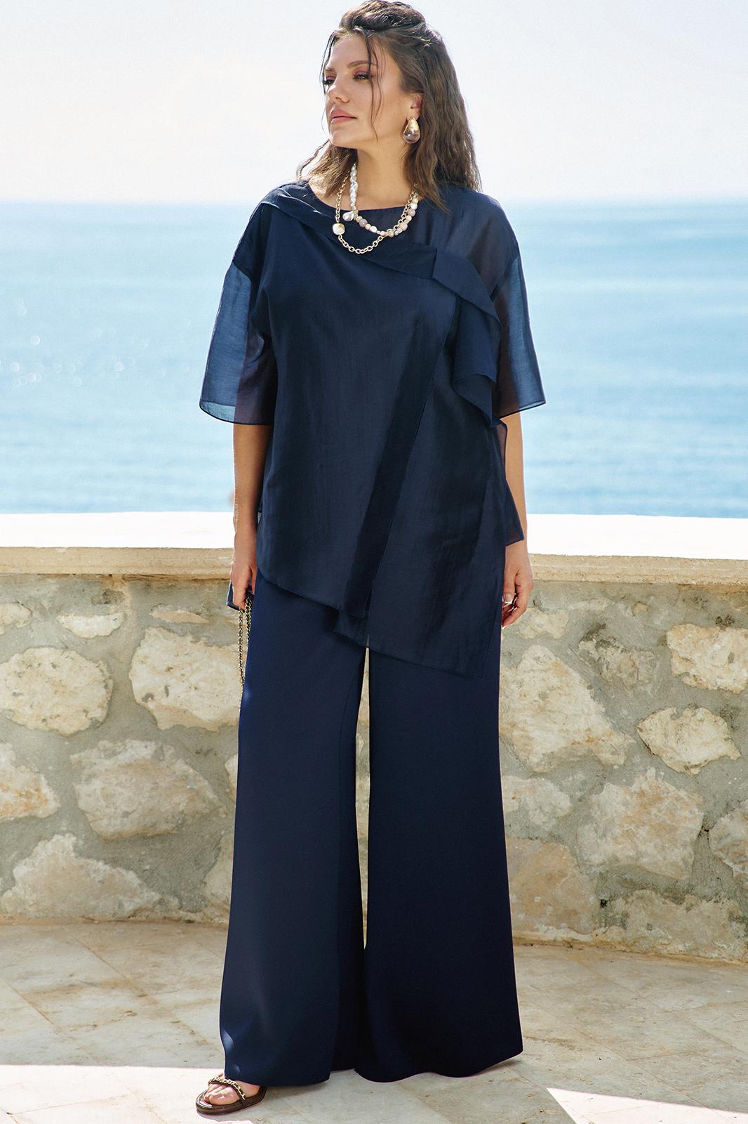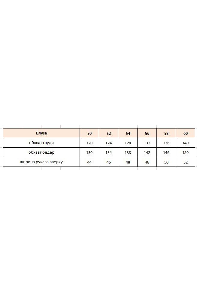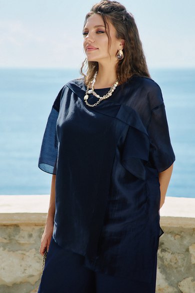 Эта блуза — не просто элемент гардероба, а воплощение стиля и уверенности, способное сделать любую женщину центром внимания. Она идеально сочетается как с классическими брюками, так и с юбками, создавая безупречный ансамбль для вечерних мероприятий или торжественных случаев. Блуза нежно струится по телу, создавая эффект невесомости. Ее мягкие линии и изящные детали, такие как легкие рукава и тонкая отделка, придают образу романтичность и загадочность. Блуза свободного силуэта, с округлой формой горловины. По переду блузки декоративная отлетная деталь с застроченными складками. Линия плеча спущенная, рукав втачной, короткий. Спинка без особенностей. Низ в блузке ассиметричный, с разрезами в боковых швах. Длина блузы 76 см, длина рукава 27 см (р 50-54), 28 см (р 56-60).