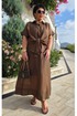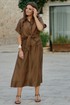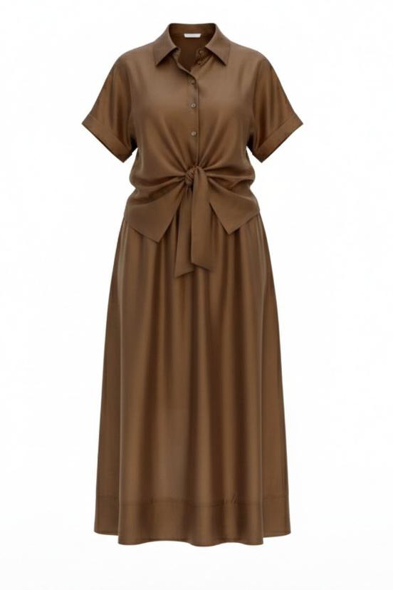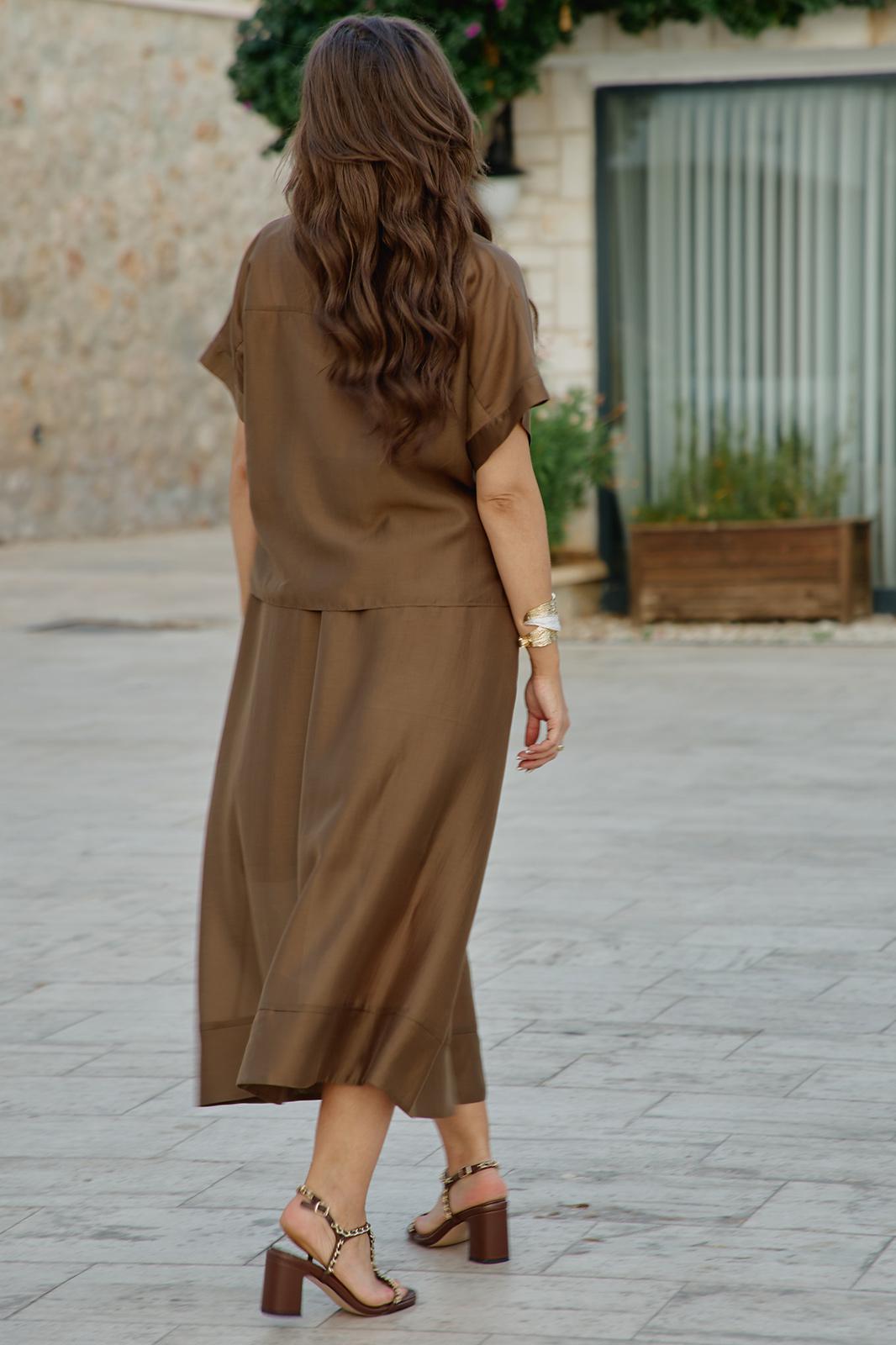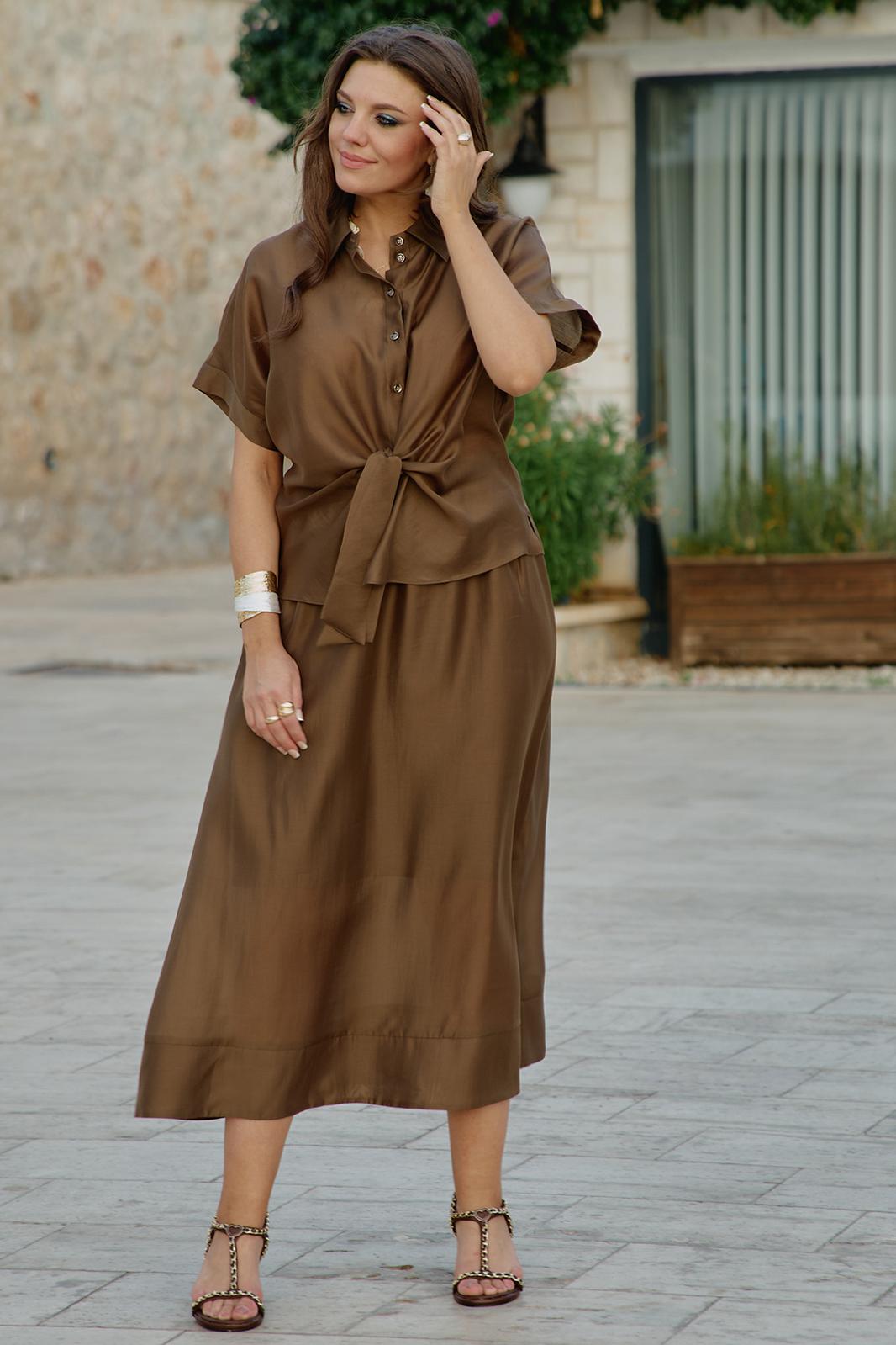 Блузка словно соткана из жидкого шоколада, застывшего в момент своего самого изысканного перелива. Это не просто одежда — это тонкая игра света и тени, где полупрозрачность становится не недостатком, а главной художественной задумкой. Шоколадный цвет здесь становится не просто оттенком, а полноценным персонажем этой визуальной истории — теплым, глубоким, с легкой горчинкой изысканности. А полупрозрачная, летящая ткань создаёт иллюзию невесомости и лёгкой таинственности. Блузка с центральной застёжкой на декоративные петли-пуговицы по планке, с воротником рубашечного типа. Её свободный крой обволакивает фигуру, не стесняя, а подчёркивая её естественные линии. Рукав в блузке цельнокроеный с притачной манжетой по низу. По переду блузки цельнокроеные отрезные детали завязывающиеся на бант. Спинка с отрезной кокеткой. В боковых швах блузки разрезы. Полупрозрачная шоколадная блузка — универсальный элемент, который работает в любом стиле. Ключ к успешному образу — баланс: если блузка воздушная и чувственная, низ должен быть более структурированным, и наоборот. Экспериментируйте с текстурами, не бойтесь контрастов и помните — эта вещь создана быть центром внимания в любом ансамбле. Длина блузы 56 см (р 50-54), 57,5 см (р 56-60), длина рукава 32 см (р 50-54), 33 см (р 56-60).