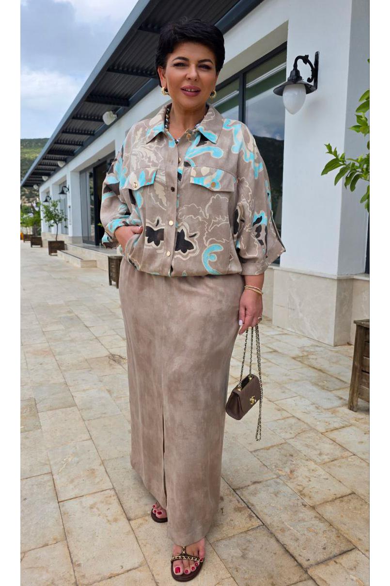 Этот блузон — воплощение современной элегантности и абсолютного комфорта, созданное для тех, кто ценит тактильную роскошь. Выполненный из стопроцентного тенсела, он обладает уникальной текстурой: шелковистой, едва прохладной на ощупь и благородно матовой. Ткань струится, мягко очерчивая силуэт и создавая живую игру света при каждом движении. Легкость материала делает этот блузон идеальным спутником для летних вечеров, когда хочется окутать плечи чем-то невесомым. Блузон в этом ансамбле — не просто куртка, это заявление, его облегчённая ткань делает его невесомым, почти эфемерным. Блузон свободного силуэта со вставкой эластичной тесьмы-резинки для мягкого прилегания. Блузон с центральной застёжкой на петли-пуговицы по планке, воротником рубашечного типа. Рукав в блузоне цельнокроеный с отложной манжетой и декоративной патой фиксирующейся отделочной пуговицей. По переду горизонтальные подрезы, декоративные клапана с отделкой в виде пуговицы. По переду блузона прорезные карманы в горизонтальных рельефах. Спинка в блузоне с отрезной кокеткой и вертикальными рельефами. Варианты стилизации: для создания образа в стиле «тихая роскошь» сочетайте блузон с широкими брюками-палаццо из такого же материала или тонкого льна в монохромной гамме. Добавьте шелковый топ в бельевом стиле и лаконичные кожаные сандалии на плоском ходу. Этот ансамбль идеально подойдет для прогулки по набережной или бранча на открытой террасе. В повседневном городском ритме блузон станет отличным дополнением к джинсам прямого кроя с высокой посадкой и базовой белой футболке. Чтобы добавить образу динамики, выберите кеды из светлой парусины и небольшую сумку-кроссбоди. Контраст между грубым денимом и нежным тенселом подчеркнет современность вашего вкуса. Длина блузона 61 см (р 52-56), 62 см (р 58-62). Длина рукава 52 см (р 52-56), 53 см (р 58-62).