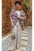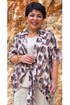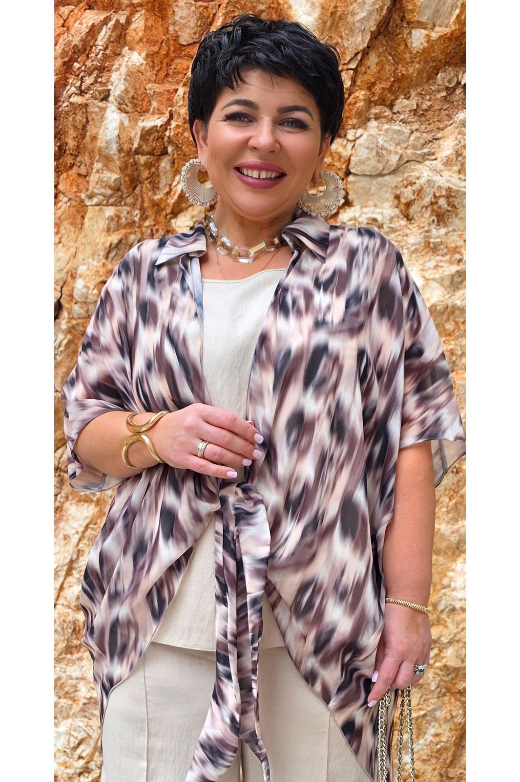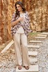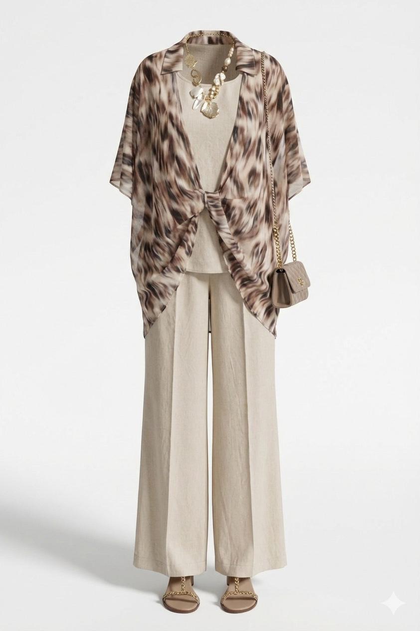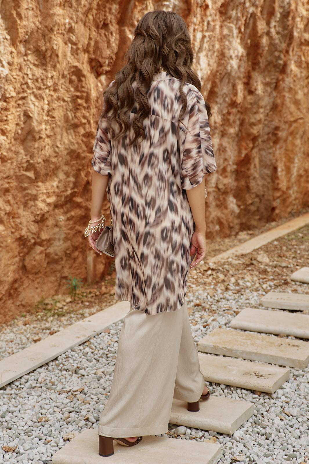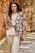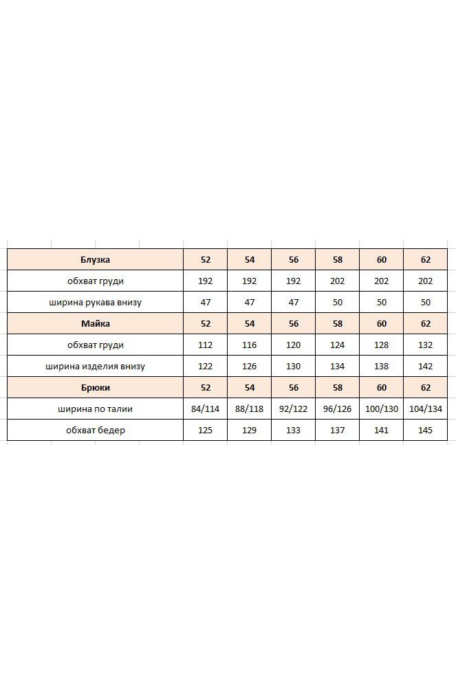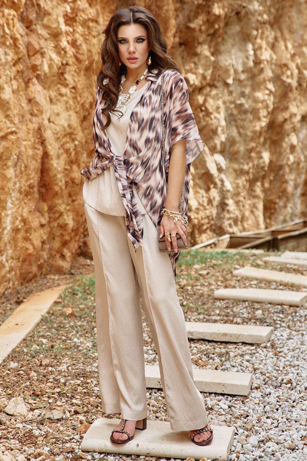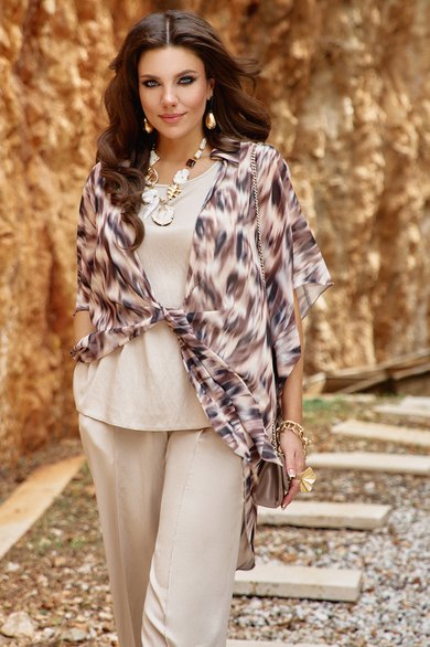 Комплект блузок. Комплект воплощает философию тихой элегантности, где настоящая роскошь проявляется в качестве материалов, продуманном крое и гармоничном сочетании пастельных оттенков. Этот комплект — не просто две вещи, а гардеробная система, которая учит: инвестировать в качественные базовые вещи — которые прослужат не один сезон, добавлять акцентные элементы — которые оживляют базовый гардероб, выражать свою индивидуальность — через выбор принтов и сочетаний. Блузка является «акцентным пятном» данного комплекта, выполнена в бежево-коричневой гамме, принт динамичный, создающий иллюзию движения даже когда блузка висит на вешалке. Блузка «оверсайз» силуэта, без застёжки с воротником рубашечного типа, по переду завязывается на декоративный узел. Рукав в блузке цельнокроеный с фигурной проймой. Для форменного силуэта боковые швы блузки переходят на перёд. Спинка с отрезной кокеткой. Низ в блузке фигурный, ассиметричный. Блуза прямого силуэта с широкими бретелями, с округлой формой горловины, нагрудными вытачками. В боковых швах от низа разрезы, низ фигурной формы. Длина блузки 97 см (р 52-56), 98 см (р 58-62). Длина майки 66 см (р 52-56), 67 см (р 58-62).