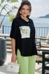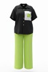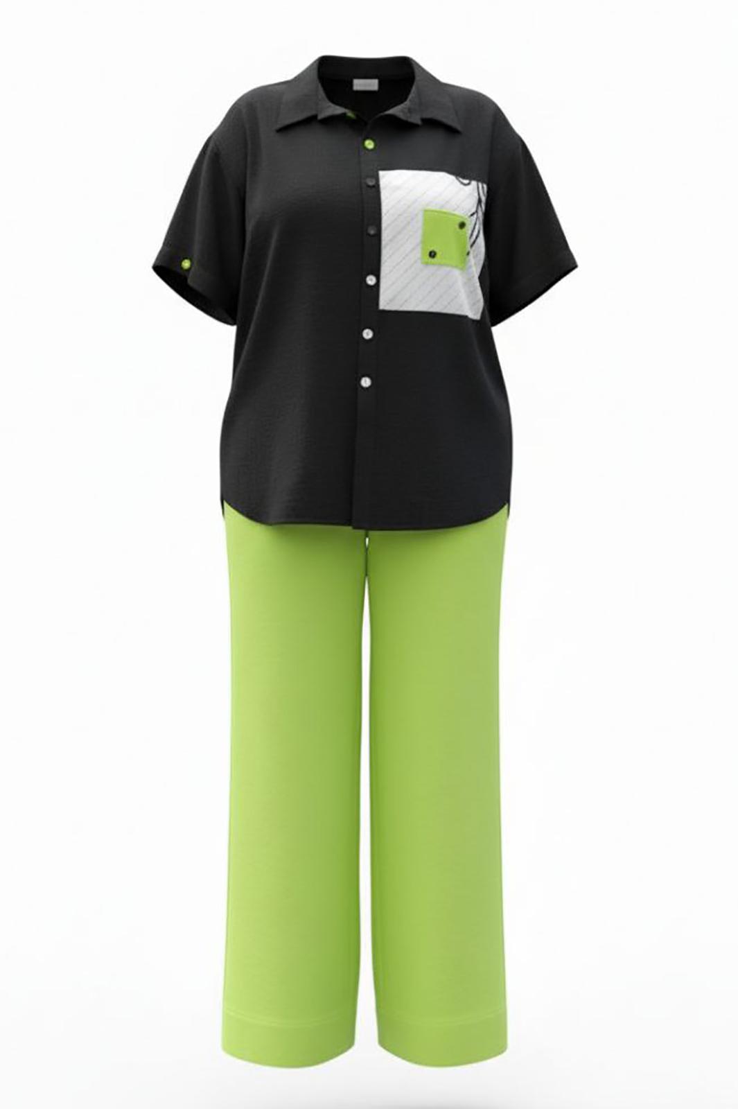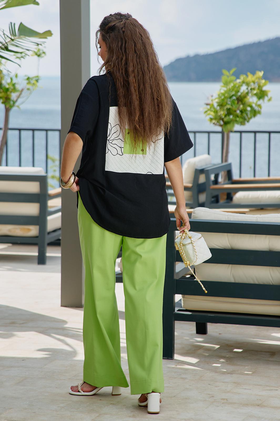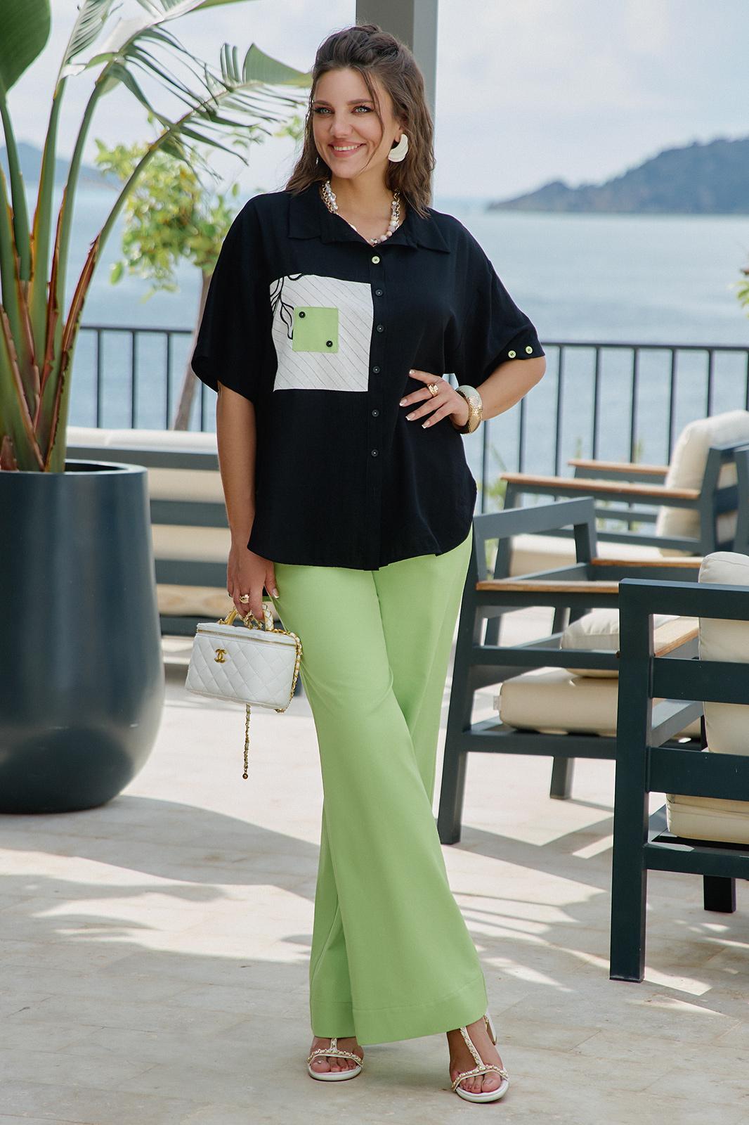Блузка из чёрного материала становится идеальным фоном для создания базы в гардеробе. Чёрный цвет здесь — не траурный, а драматичный, глубокий, он поглощает свет, чтобы яркие акценты сияли ещё ярче. Эта блузка — не просто предмет гардероба, а инструмент самовыражения. Она достаточно универсальна для офиса, а та же для особых мероприятий. Ключ к успешной стилизации — баланс: позвольте цветочным акцентам быть главными героями образа, а всё остальное пусть будет их достойным фоном. Помните — иногда одна яркая деталь говорит больше, чем целый ансамбль, и эта блузка именно такая деталь. Блузка прямого силуэта с центральной застёжкой на петли-пуговицы по планке, воротником рубашечного типа. По правой детали полочки отрезная кокетка, декоративная вставка из отделочной ткани с ярким акцентом. Линия плеча спущенная, рукав втачной, короткий с декоративным элементом по низу в виде пришивной пуговицы. Спинка в блузке с отрезной кокеткой, декоративной вставкой из отделочного материала с ярким акцентом. Низ в блузке фигурной формы. Длина блузы 80 см (р 52-56), 81 см (р 58-62), длина рукава 21,5 см.