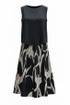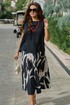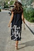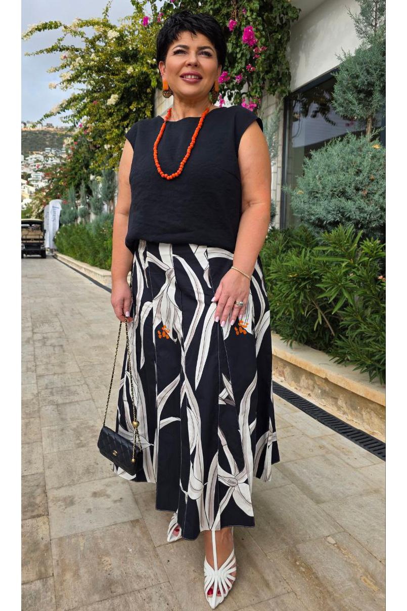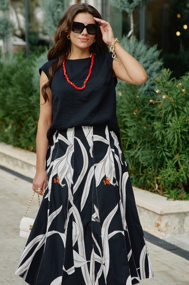 Блузка свободного силуэта, материал струится по телу лёгкой прохладой, горловина — изящный полукруг, обрамляющий ключицы. По переду нагрудные вытачки, линия плеча слегка спущенная. Низ в блузке фигурной формы, в боковых швах небольшие разрезы. Длина блузки по спинке 63,5 см, длина рукава (плеча) 12 см (р 50-54), 12,5 см (р 56-60). Длина юбки 87 см (р 50-54), 88 см (56-60).