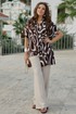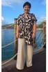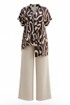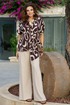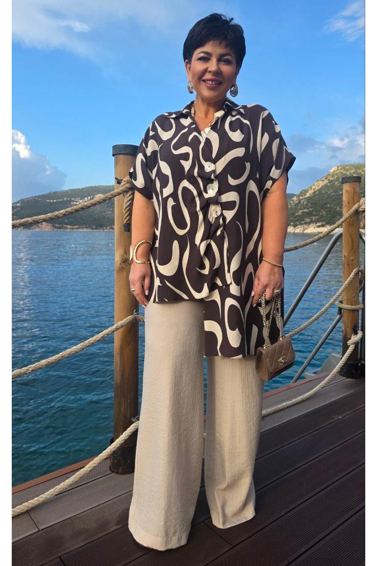 Блузка представлена как многофункциональный элемент гардероба, который сочетает в себе эстетическую глубину и практическую универсальность, становясь холстом для образов. Крой — свободный, но не мешковатый. Универсальность — подходит для работы, встречи с друзьями, прогулки, путешествия. Современность — вне сезонных трендов, но в тренде на осознанное потребление. Блузка не облегает — она скользит. Она не описывает фигуру — она её окутывает. Блузка свободного силуэта с ассиметричной линией борта с заложенными складками, имитацией застёжки на декоративные пуговицы. Горловина в блузке с отложным воротником со стойкой. Рукав в блузке цельнокроеный. Спинка с отрезной кокеткой. Низ в блузке ассиметричный с разрезами в боковых швах. Длина блузки 69 см (р 52-56), 72 см (р 58-62). Длина брюк 108 см.